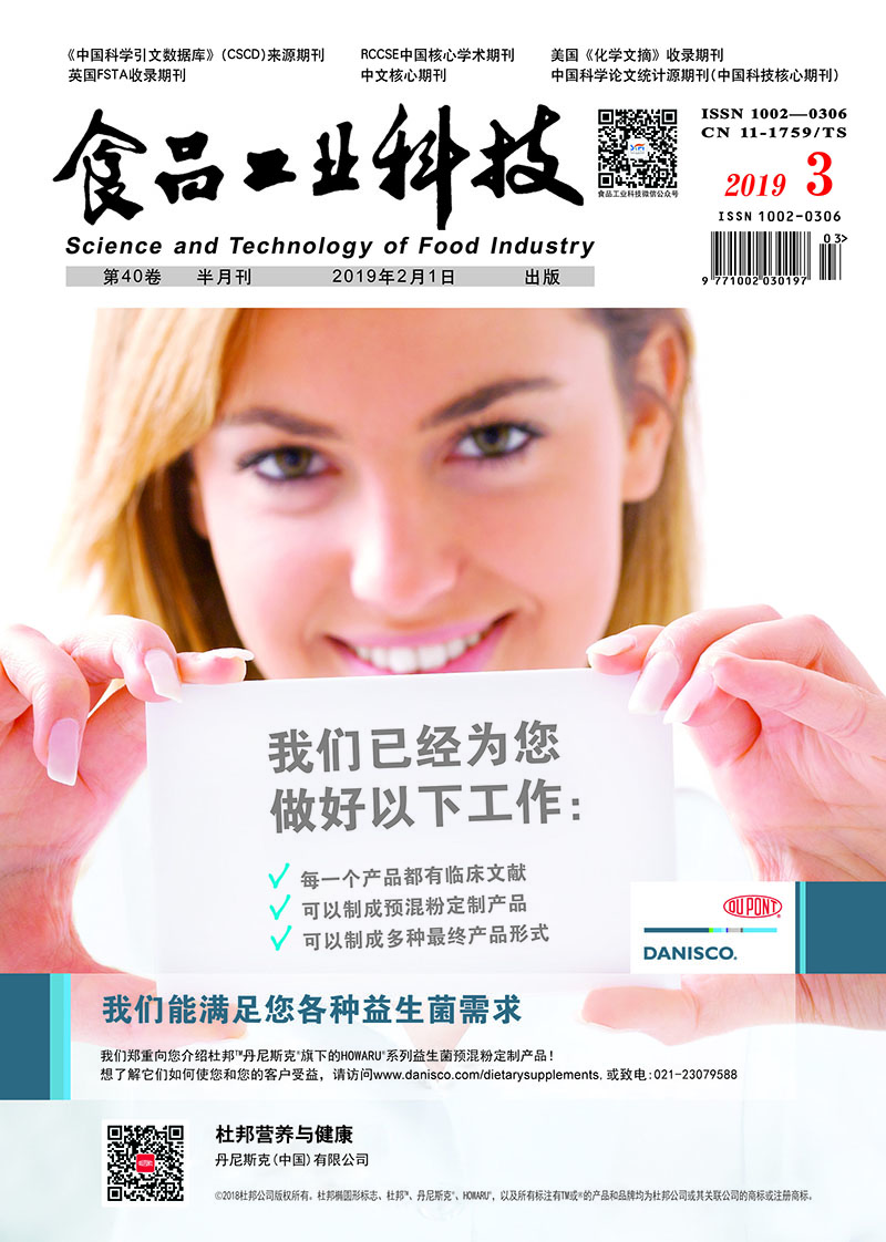 摘要: 本实验采用乳化活性优异的乳清分离蛋白(WPI)和阿拉伯胶(GA)分子内复合物为乳化剂,通过高压均质制备稳定的共轭亚油酸(CLA)乳液,并对乳液粒径和稳定性进行了评价。利用喷雾干燥法制备CLA粉末油脂,研究了进风口温度和CLA浓度对粉末油脂包封率的影响,并对CLA粉末油脂的复溶稳定性、机械性能和氧化稳定性进行了评价。结果表明,当复合乳化剂浓度为2%,进风口温度为130 ℃,CLA浓度为15%~25%时,包封率大于90%,粉末油脂分散均匀、复溶性好、法向应力Fn达到最大、耗氧速率0.005 μmoL/(mL·min)明显低于其他浓度下的0.01 μmoL/(mL·min)。通过乳化活性优异的WPI-GA分子内复合物制备出稳定的共轭亚油酸粉末油脂,提高了其稳定性,扩大了功能因子共轭亚油酸的应用范围。Abstract: In this paper, whey protein isolate (WPI) and gum arabic (GA) intramolecular complexes with excellent emulsifying activity were used as emulsifiers to prepare stable conjugated linoleic acid (CLA) emulsions by high pressure homogenization, the emulsion particle size and stability were evaluated. Then the CLA powder were prepared by spray drying, the effects of inlet temperature and CLA concentration on the encapsulation efficiency of powdered grease were studied, the re-solubilization stability, mechanical properties and oxidation stability of CLA powder were evaluated. The optimal preparation condition was as follows:the concentration of WPI-GA intromolecular complex was 2%, the air inlet temperature was 130℃, and the CLA concentration was 15%~25%. The encapsulation efficiency was higher than 90%, the CLA powder was uniformly dispersed and its re-dissolution stability was good, the normal stress Fn reached a maximum, and the oxygen consumption rate was 0.005 μmol/(mL·min) which was significantly higher than 0.01 μmoL/(mL·min) at other concentrations. The stable conjugated linoleic acid powder oil was prepared by the emulsified activity of WPI-GA intramolecular complex, which improved its stability and expands the application of conjugated linoleic acid.