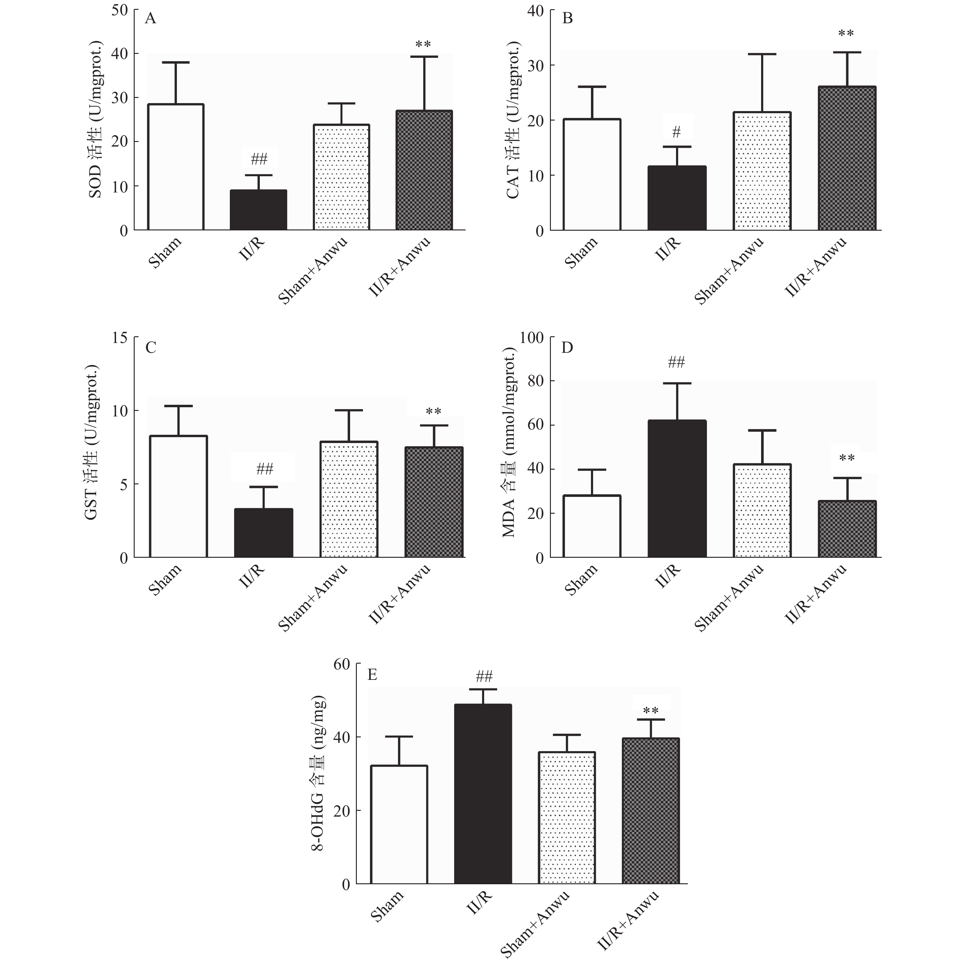 P > 0.05). When compared with II/R group, the serum AST, liver MDA, 8-OHdG contents in the II/R + Anwu group decreased extremely significantly (