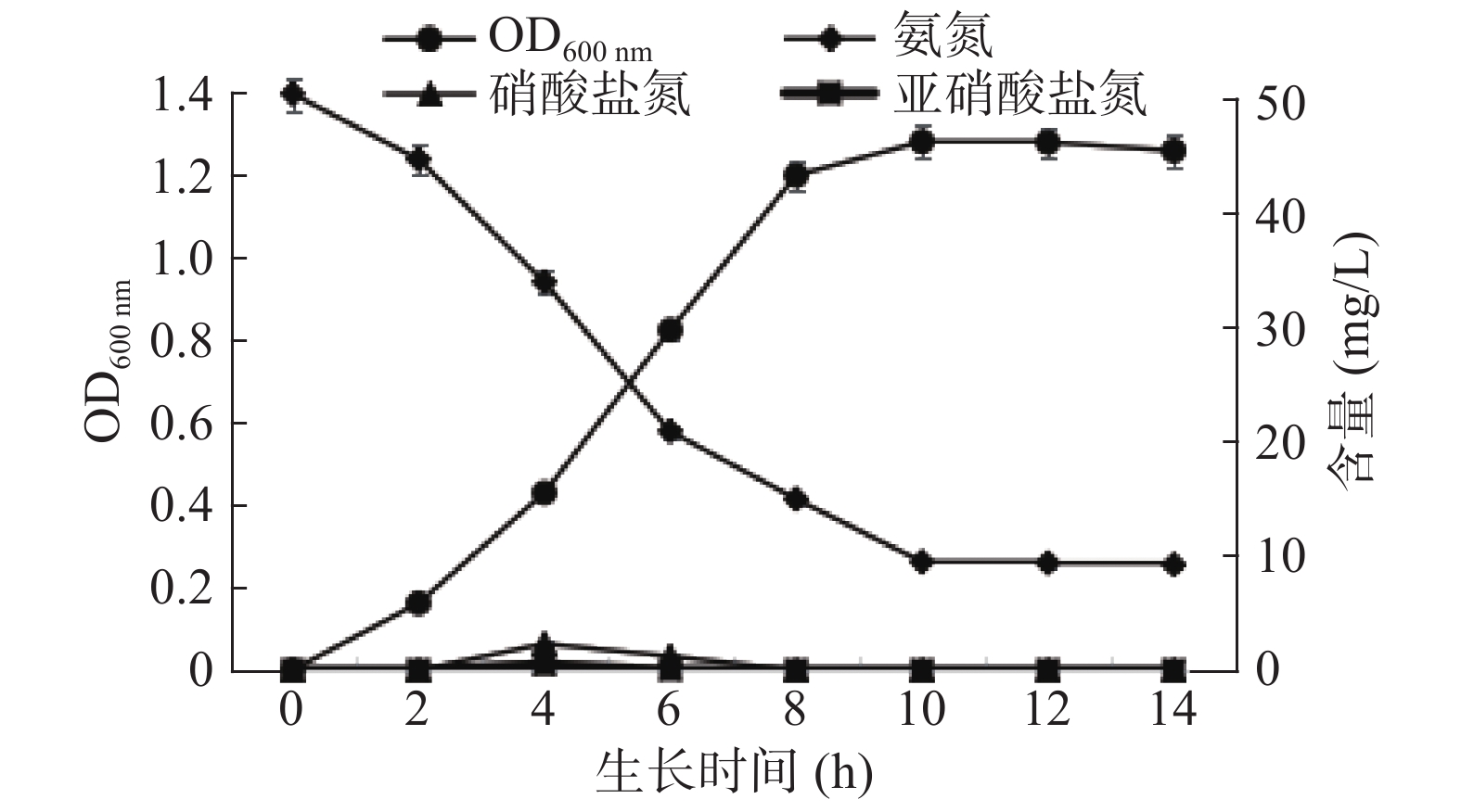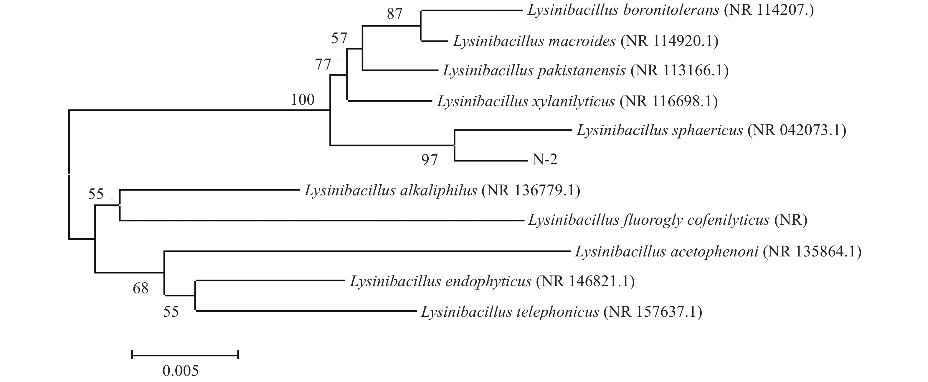 Lysinibacillus sphaericus. The N-2 strain could rapidly remove ammonia nitrogen in the simulated ammonia nitrogen wastewater within 10 h by bacterial assimilation without any accumulation of nitrate and nitrite, and could also grow normally with initial concentration of ammonia nitrogen up to 6000 mg/L. The best ammonia nitrogen removal conditions were C/N 10, inoculation volume 5%, pH8.0, temperature 31 ℃, speed 180 r/min and liquid volume 62.5 mL/250 mL. Under the optimal conditions, the removal rate of ammonia nitrogen was up to 97.7% for the initial concentration was 50 mg/L, 91.0% for 100 mg/L and 71.7% for 500 mg/L within 10 h. To sum up, the strain N-2 can not only quickly and efficiently remove ammonia nitrogen in water, but also has high tolerance to ammonia nitrogen. It can be used as a potential strain resource for removing ammonia nitrogen in industrial wastewater with high ammonia nitrogen concentration.
