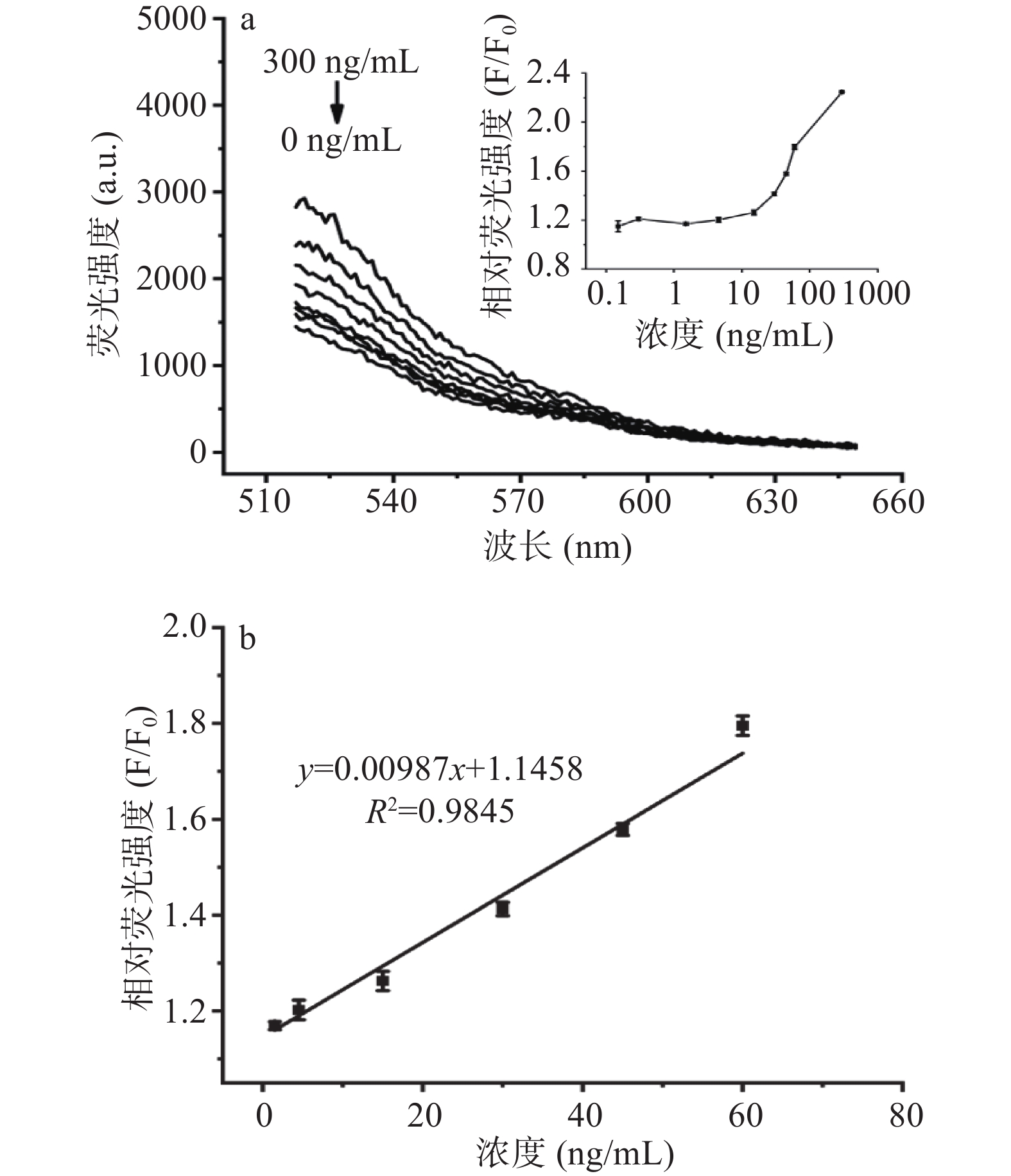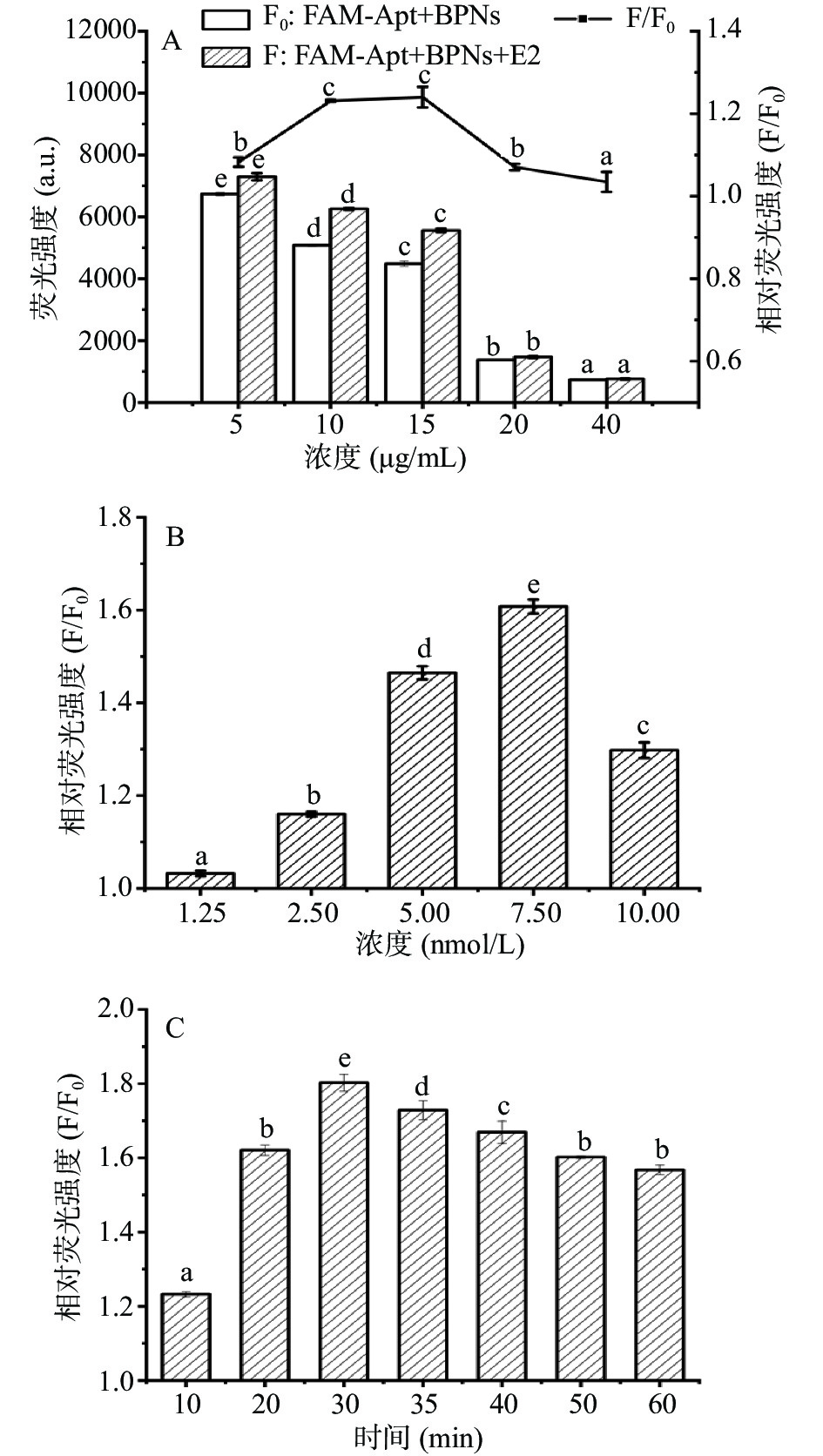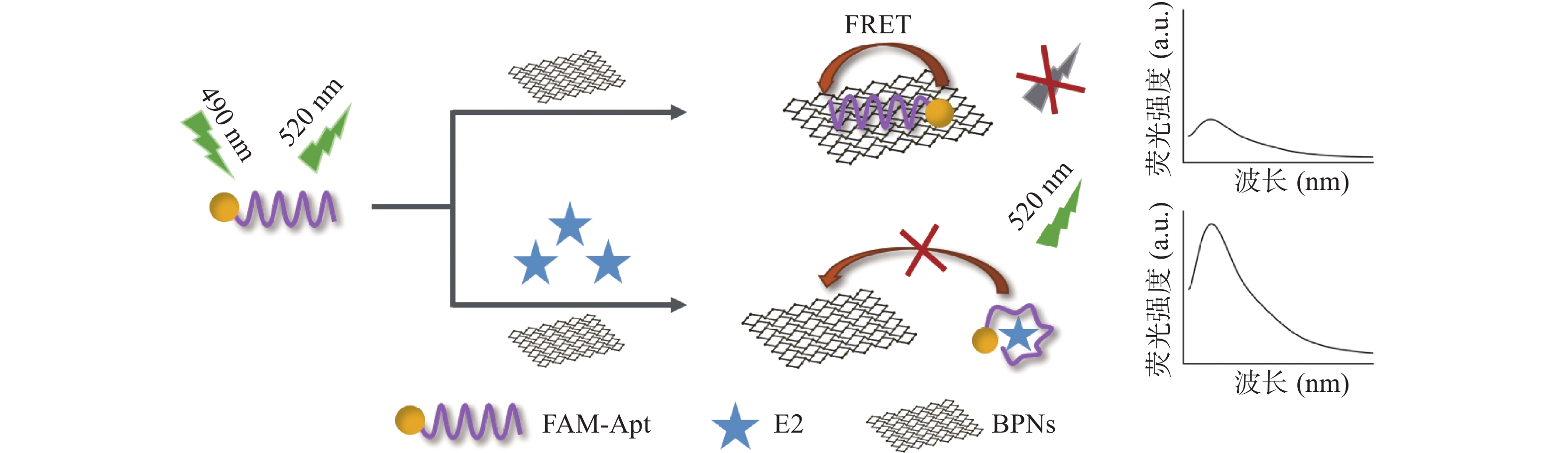 β-estradiol fluorescence aptasensor was constructed between FAM labeled aptamers and BPNs based on the fluorescence resonance energy transfer (FRET). After optimization of BPNs concentration, FAM-Apt concentration and reaction time, samples of tap water and milk were determined. The results showed that the prepared BPNs had independent lamellar structure and uniform particle size.With the concentrations of BPNs and FAM-Apt were 10 μg/mL and 7.5 nmol/L respectively, the linear range of the sensor was 1.5~60 ng/mL and the detection limit was 1.0 ng/mL. The recoveries of tap water and milk were 91.2%~104.8% and 87.5%~104.3%. The relative standard deviation (RSD) were 4.99%~10.53% and 4.48%~11.24%, respectively. This method with simple, high sensitive and strong specificity could be completed within 30 min and could realize quantitative detection of E2 in actual samples.