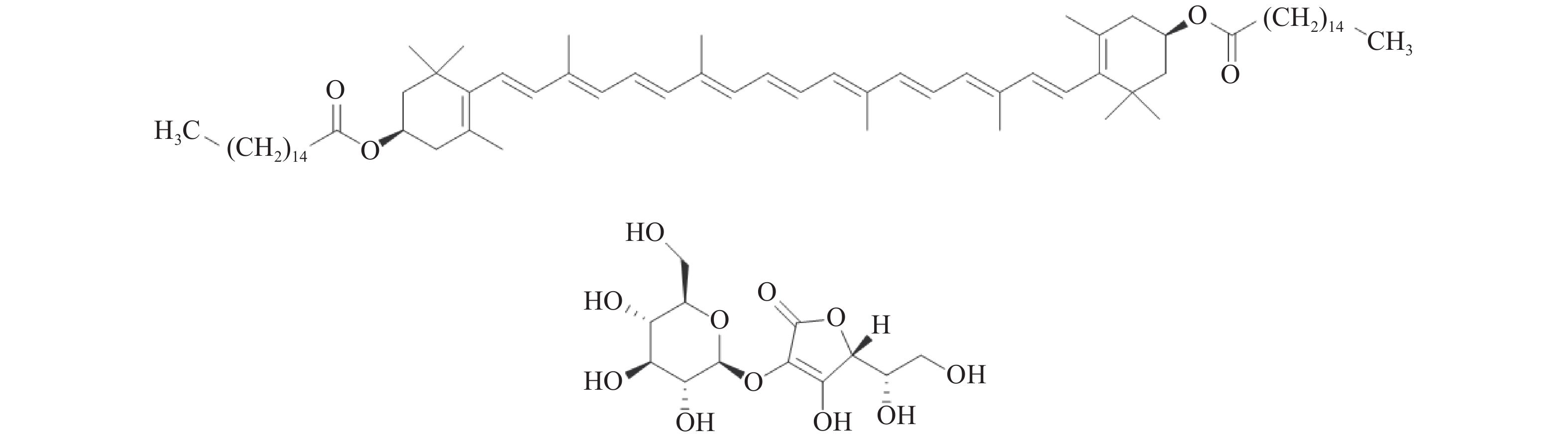 −1, and UV detection was performed at 450 nm. UPLC analysis of ascorbic acid was carried out on Torus TM Diol Column (3 mm×100 mm, 1.7 μm) at the temperature of 40 ℃. An isocratic system was also used at which the mobile phase (flow rate of 0.4 mL/min) consisting of acetonitrile (solventA) and 66.7 mmol/L ammonium acetate (solvent B) was set as 85% A and 15% B. UV detection wavelength was set at 260 nm. Results: The linear range of zeaxanthin dipalmitate and 2-O-(β-D-glucopyranosyl) ascorbic acid were 0.01~0.1 mg/mL and 3.125~100 μg/mL, with the correlation coefficient being 0.9990 and 1.0000, the average recovery was 99.44% and 96.30%, while the RSD was 4.04% and 3.61% respectively. In 22 batches of