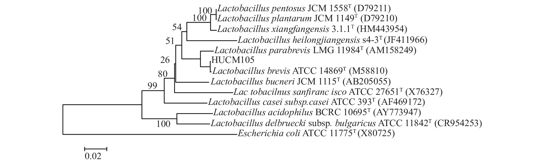 Lactobacillus brevis, and exhibited a good tolerance to acid and bile. The number of viable bacteria had no significant changes in a pH value higher than pH2.5 and 0.5% oxgall for 3 h, respectively. Moreover, the strain HUCM105 could remove 26.4% of the cholesterol in the culture medium supplemented with cholesterol after incubation for 24 h. The number of viable cell of the strain HUCM105 was higher and reached the level of 5×10
