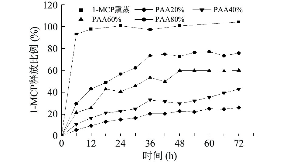 In this paper, 1-methylcyclopropene (1-MCP) controlled release packaging paper was prepared by mixing 1-methylcyclopropene with different proportions of ethyl cellulose ether (EC) and polyacrylic acid (PAA) and then coating it on the paper base. The release mechanism was studied. Saimaiti apricot fruits stored at 2 ℃ were treated with 1-MCP controlled release packaging paper. The effects of 1-MCP controllable slow-release packaging paper on respiratory intensity, hardness, titratable acid, soluble solids, peel color and commodity rate of apricot fruit during storage were studied in order to obtain a kind of fresh-keeping paper which could effectively prolong the storage period of apricot fruit. The results showed that under the conditions of 95% RH, 2 ℃ and 80% polyacrylic acid (PAA), the particle collapse of 1-MCP powder made the gas release slowly, and the release mechanism parameter was 0.49, and the release rate increased with PAA content. Controlled release 1-MCP-coated paper could inhibit the arrival of the peak of respiration intensity of apricot fruit, delay the decrease of hardness, titratable acid and soluble solid content, and maintain the color of peel. The results showed that controlled release 1-MCP-coated paper could effectively maintain the quality of apricot fruits stored in low temperature environment, and would provide some reference for the application of controlled release 1-MCP-coated paper to the storage of other fruits and vegetables.