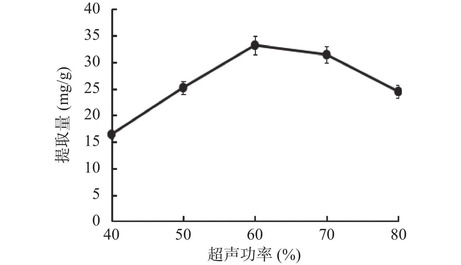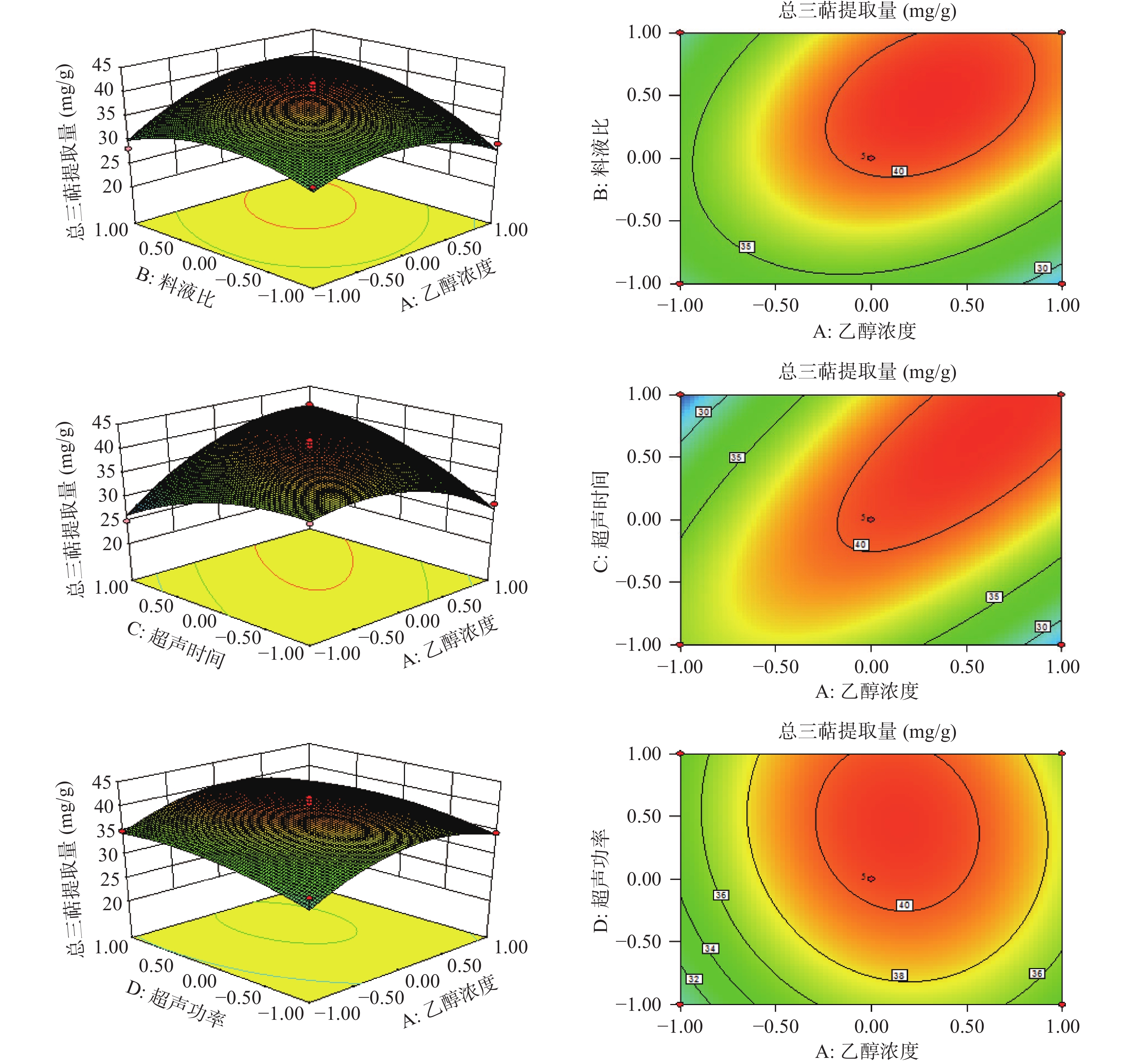 in vitro. Taking the yield of total triterpenes in LA as the evaluation index, the single factor experiments and the response surface methodology were used to optimize the extraction process of ultrasonic-assisted extraction of total triterpenes from LA. The results showed that the optimum extraction conditions were ethanol concentration 89%, ratio of material to liquid 1:33 (g/mL), extraction time 60 min, and ultrasonic power 70% (445 W). The theoretical extraction volume was 39.64 mg/g, and the actual one was (39.95±0.32) mg/g under this optimum condition, which was close to the predicted value. Afterwards, using V