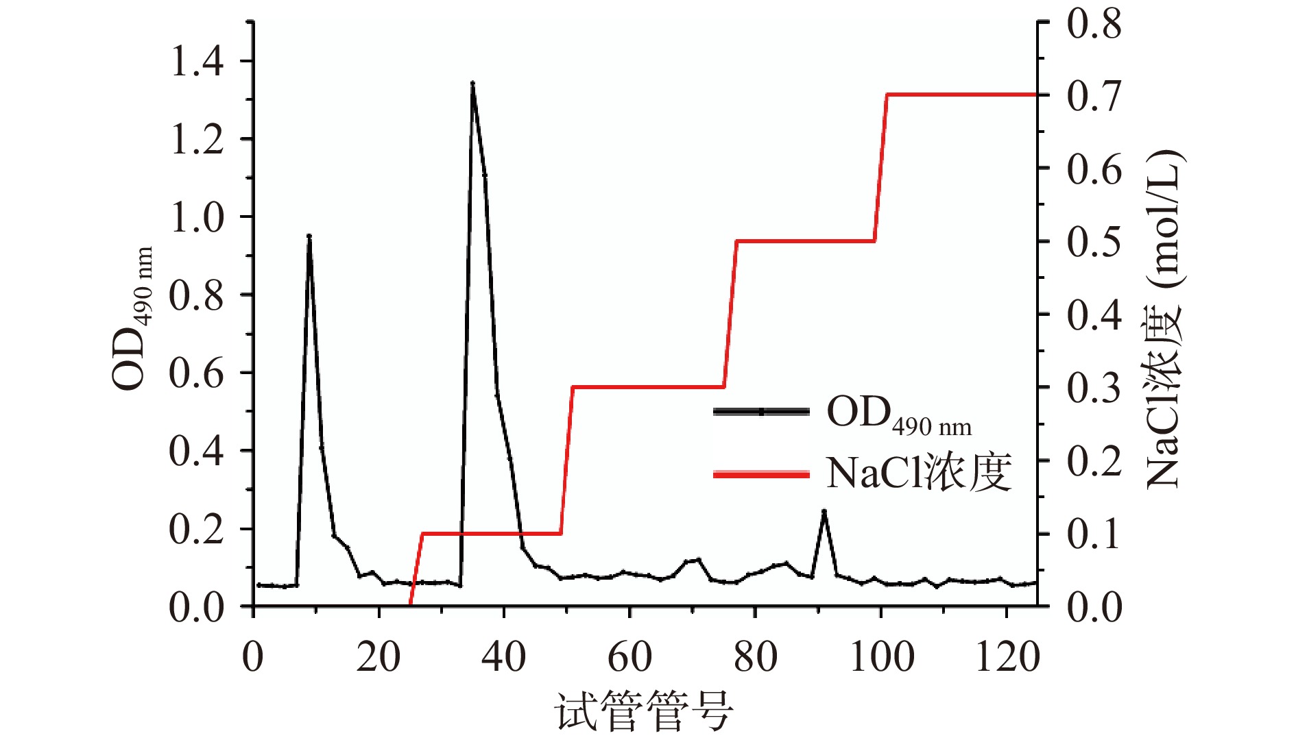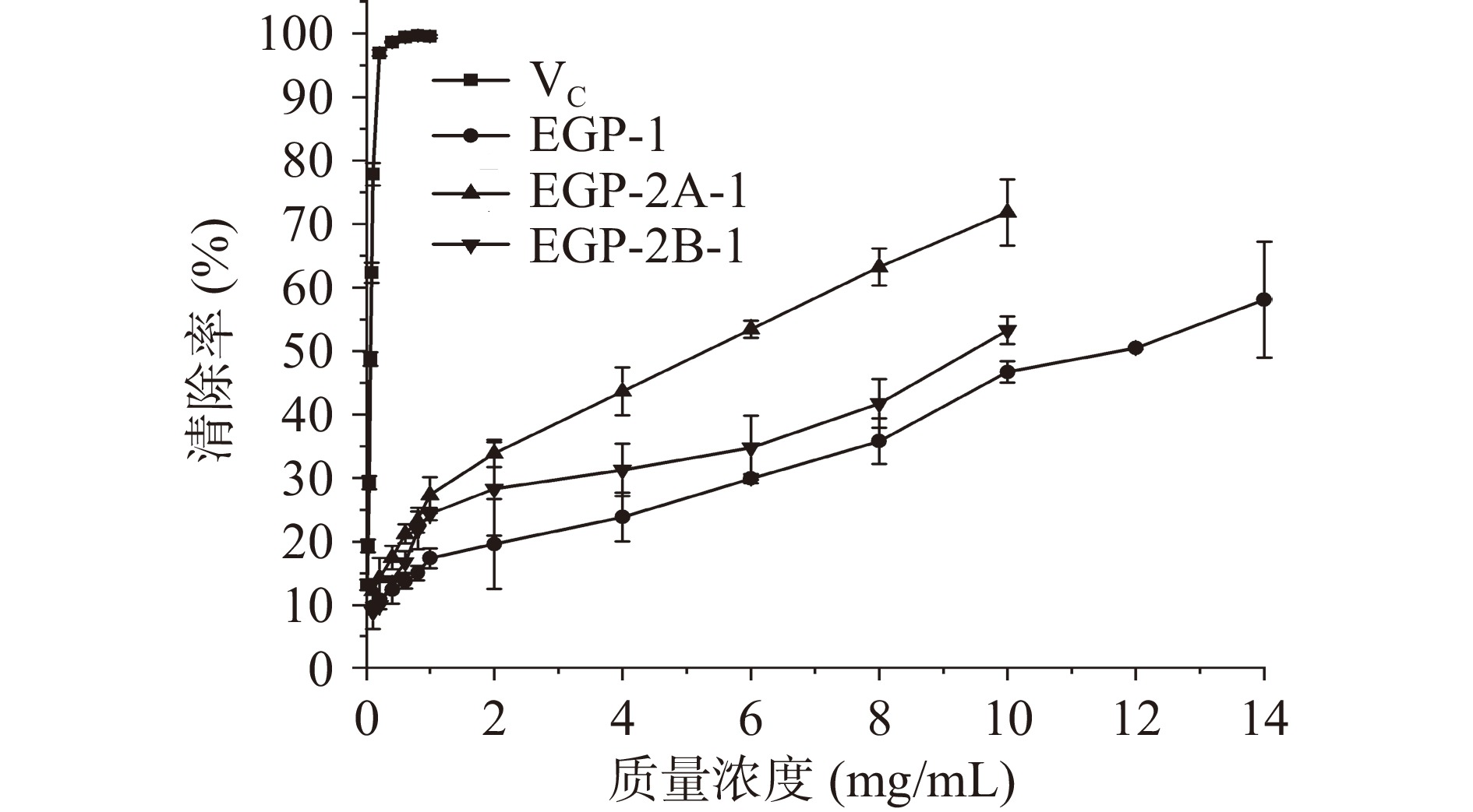 β-glycosidic bonds. The main monosaccharides found in EGP-1 were glucose, mannose, fucose and rhamnose; EGP-2A-1 and EGP-2B-1 were composed of fucose, rhamnose, arabinose, glucosamine, hydrochloride galactose, glucose, xylose, mannose and glucuronic acid. The results of antioxidant activities showed that three-component polysaccharides had antioxidant activity, the order of their antioxidant capacities was V