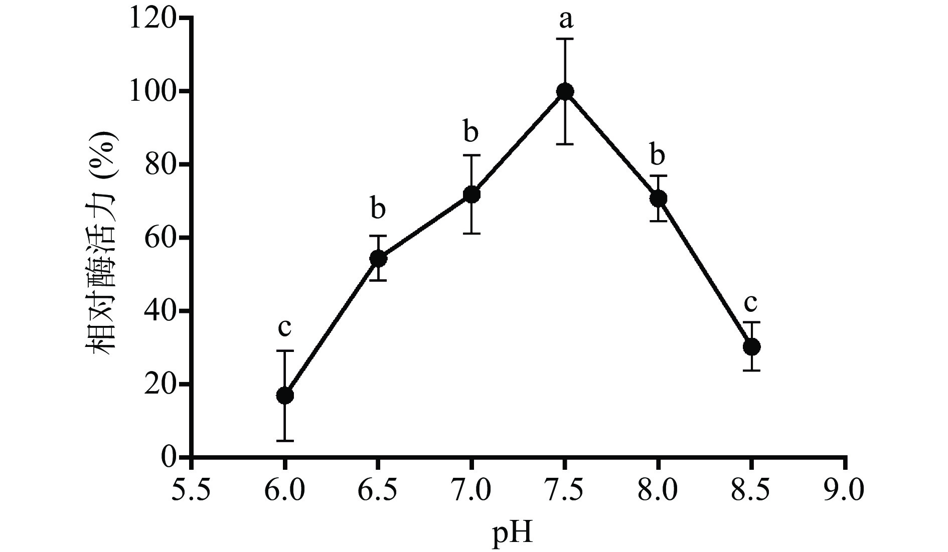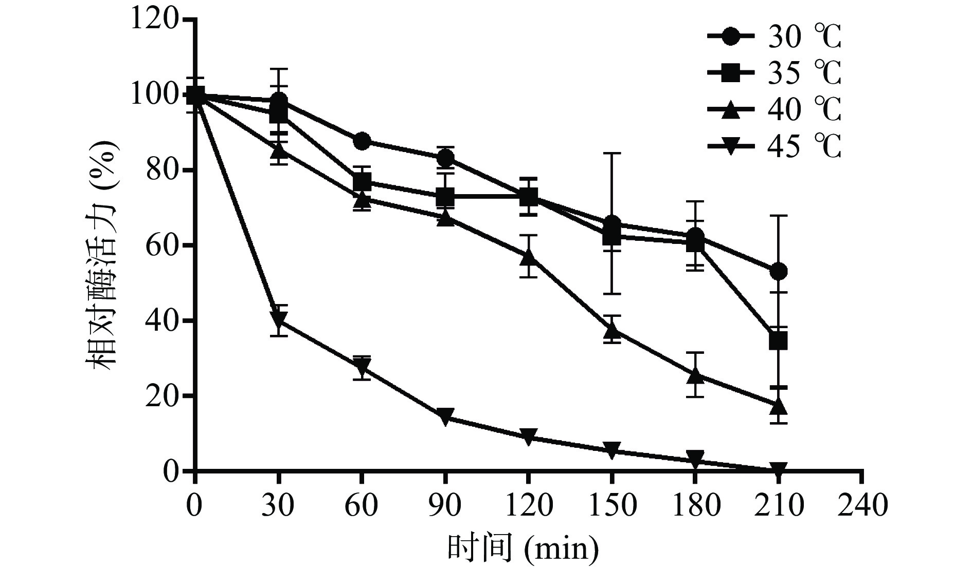β-D-thiogalactoside) concentration was 125 μmol/L, the enzyme activity of fermentation broth reached 7206.83±184.27 IU/L. Furthermore, the purified His-ChSase ABC Ⅱ had an enzyme specific activity of 22.02±0.39 IU/mg protein, with optimal pH and temperature of 7.5 and 40 ℃, respectively. The enzyme was also found to be stable at 30~40 °C with a half-life of over 2 h. Moreover, the His-ChSase ABC II was determined to specifically and effectively decompose chondroitin sulfate, with a K