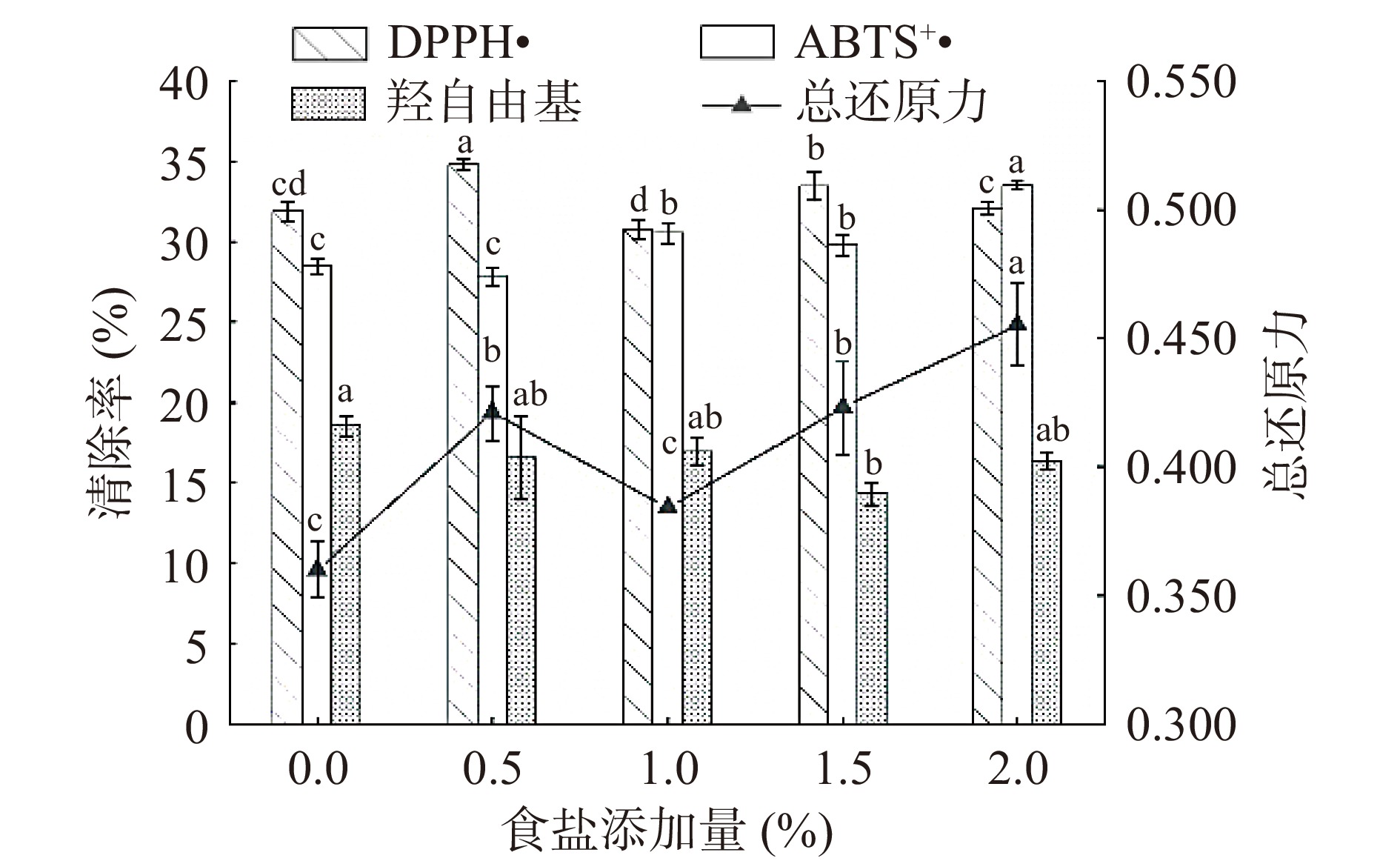 • 摘要: 为改善挂面品质,研究不同食盐添加量对石磨全麦粉糊化和粉质特性、面片色泽及挂面蒸煮、感官、质构特性和抗氧化活性的影响。结果表明:随食盐添加量增加,全麦粉峰值黏度、衰减值呈现先增大后减小趋势,吸水率、弱化度持续下降,糊化温度、面团形成时间和稳定时间持续增加。添加食盐后,0 h组的全麦面片亮度显著升高(P<0.05);红绿值、黄蓝值显著降低(P<0.05)。食盐添加量为2%时,全麦挂面烹调损失率和面汤浊度达到最大,分别为7.93%和0.162,熟面ABTS+•清除率和总还原能力达到最大,分别为33.53%和0.455。在0%~2%的食盐添加范围内,随食盐添加量增加,全麦挂面硬度、胶着性和咀嚼性呈下降趋势。1%食盐添加量条件下,全麦面团和挂面整体品质最佳。