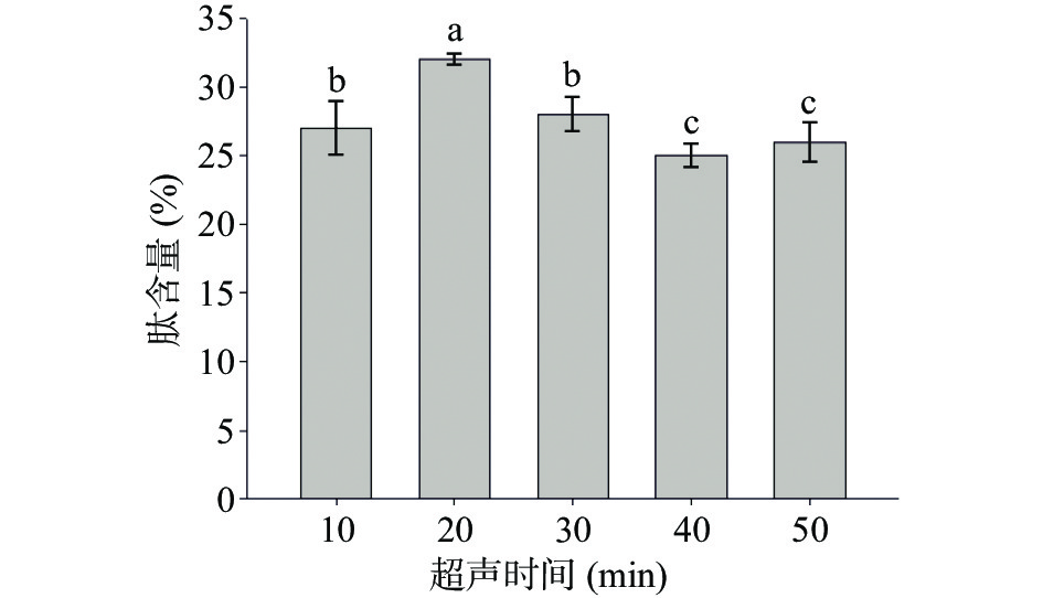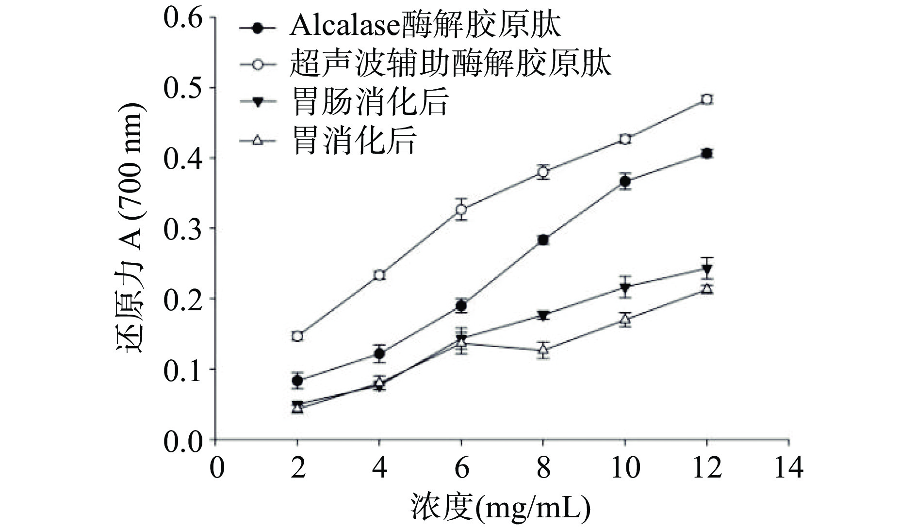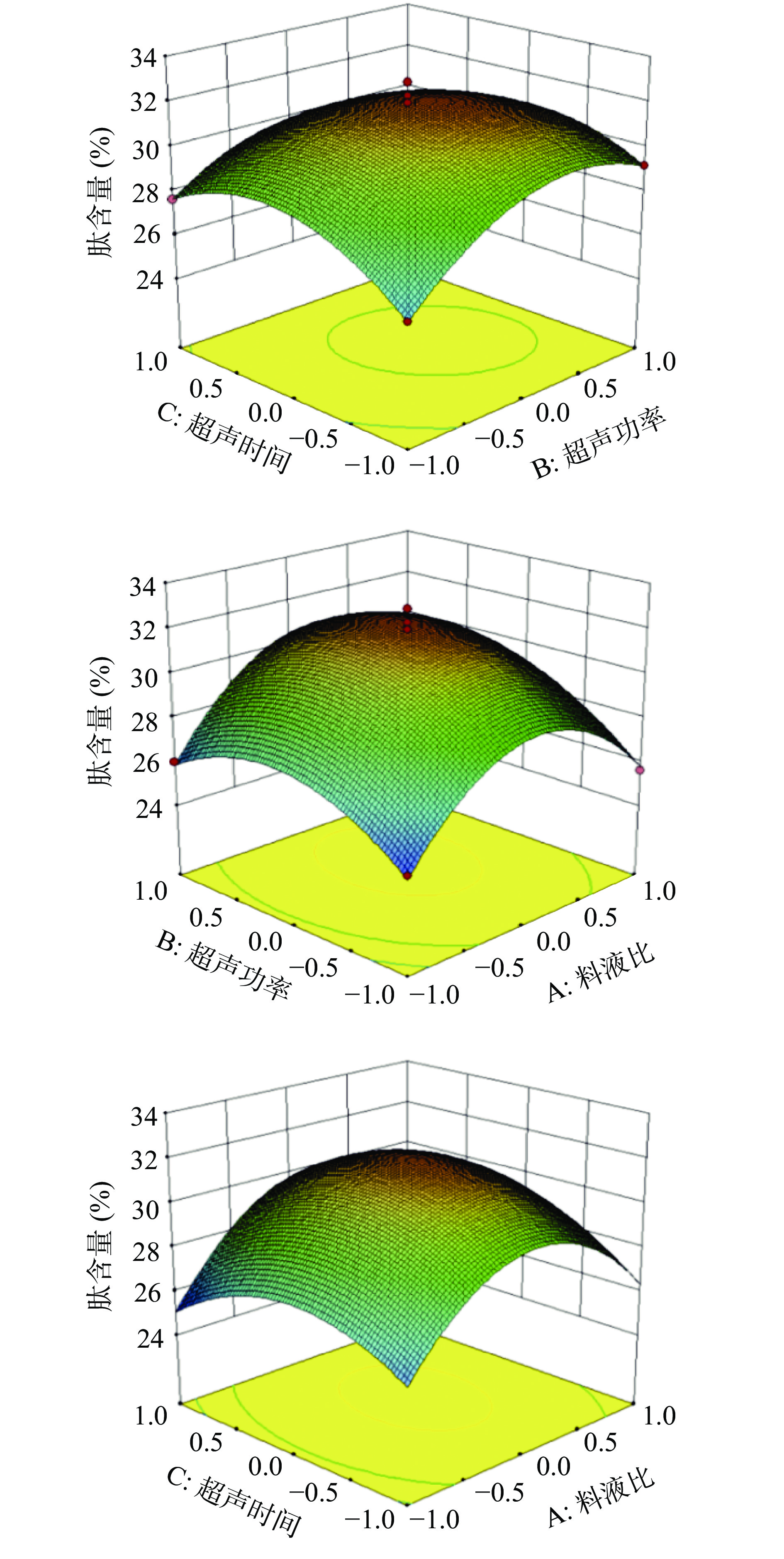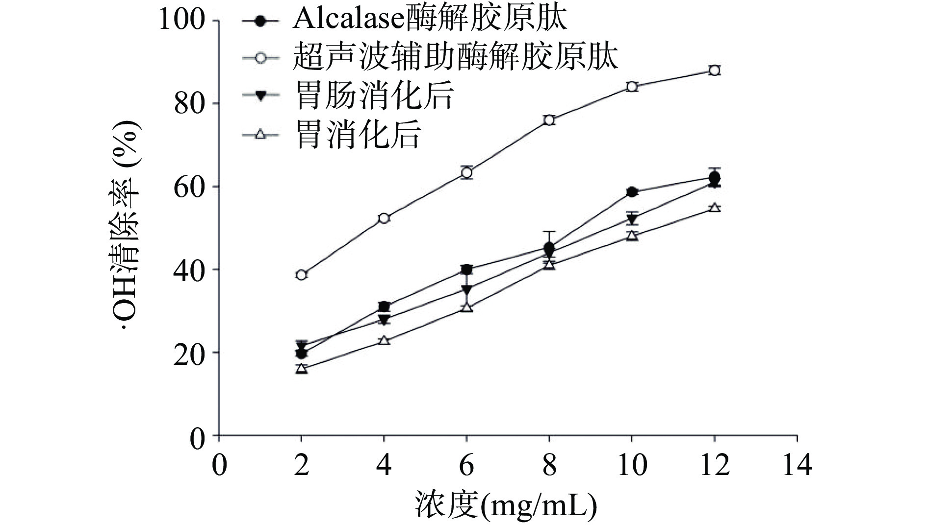 In order to determine the effect of ultrasonic extraction on the content and functional activity of collagen peptide from Tibetan sheep skin, solid-liquid ratio, ultrasonic power and ultrasonic time were studied by response surface method to determine the best ultrasonic extraction process of collagen peptide. The antioxidant capacity, reduction power and ·OH scavenging ability of collagen peptide from Tibetan sheep skin was analyzed. The results showed that ultrasound-assisted treatment had significantly affected the content of collagen peptide and antioxidant activity. The optimal ultrasonic extraction conditions were solid-liquid ratio 1:18, ultrasonic power 220 W and ultrasonic time 27 min. The collagen peptide content of Tibetan sheep skin was 30.21%±1.67%. The reduction power and ·OH scavenging rate of collagen peptide after ultrasonic assisted extraction were 0.49 and 83.2%, which were increased by 4% and 38.3% compared with those before ultrasonic extraction, respectively. After gastrointestinal digestion, the reduction power and ·OH decreased to a certain extent, but still had good antioxidant activity. Ultrasound-assisted extraction of collagen peptide from Tibetan sheep skin has the advantages of increasing the content of collagen peptide and enhancing antioxidant activity