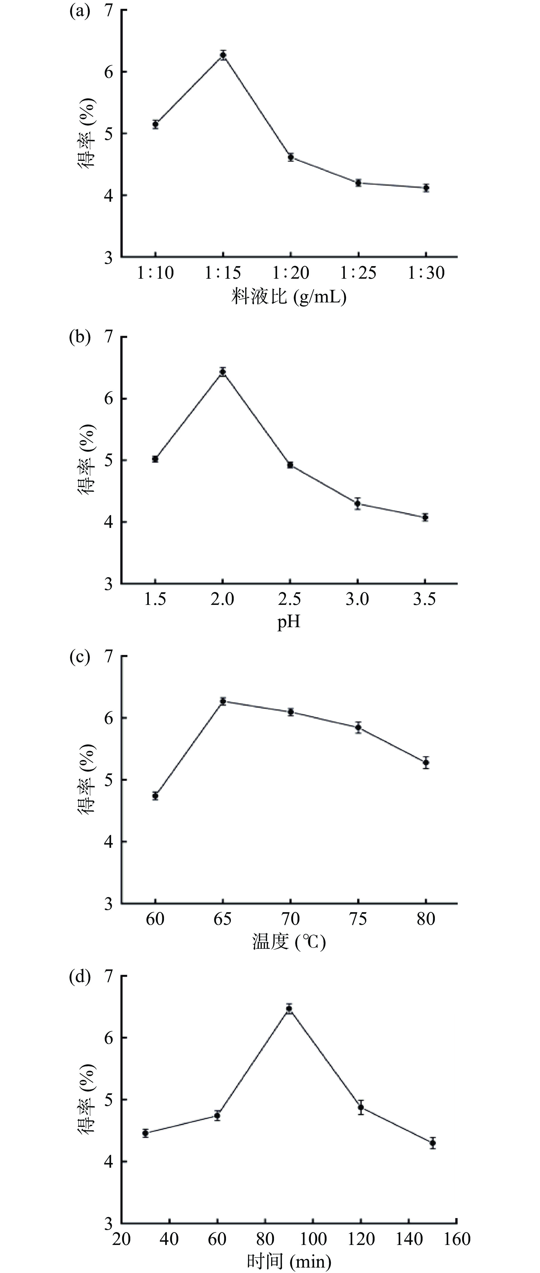 Wine mud is the precipitate produced during fermentation and storage, which contains pectin, protein, polyphenols and other substances. To realize the value-added utilization by separating and extracting the effective components of the mud in white wine production, in this study, the effects of material-liquid ratio, pH, extraction temperature and extraction time on the yield of pectin were investigated by the single-factor test, the extraction condition was optimized by the response surface method, the decolorization of pectin was carried out using macroporous resin, and the structure was characterized by infrared spectroscopy and HNMR. The results showed that the yield of pectin was 6.48% on the condition of wine mud:water=1:14 g/mL, pH was 2.0, extraction temperature was 65 ℃ and extraction time was 90 min, which was near to the predicted value of 6.50% by the response surface model. The factors on the yield followed as material-liquid ratio>extraction temperature>extraction time>pH. Decolorized by D101 macroporous resin under the condition that decolorization temperature was 25 ℃, pH was 2.0, decolorization flow rate was 3 BV/h and desorption solution was 60% (v/v) ethanol, desorption flow rate was 3 BV/h, the decolorization rate could reach 91.75%. IR and HNMR analysis showed that pectin extracted was