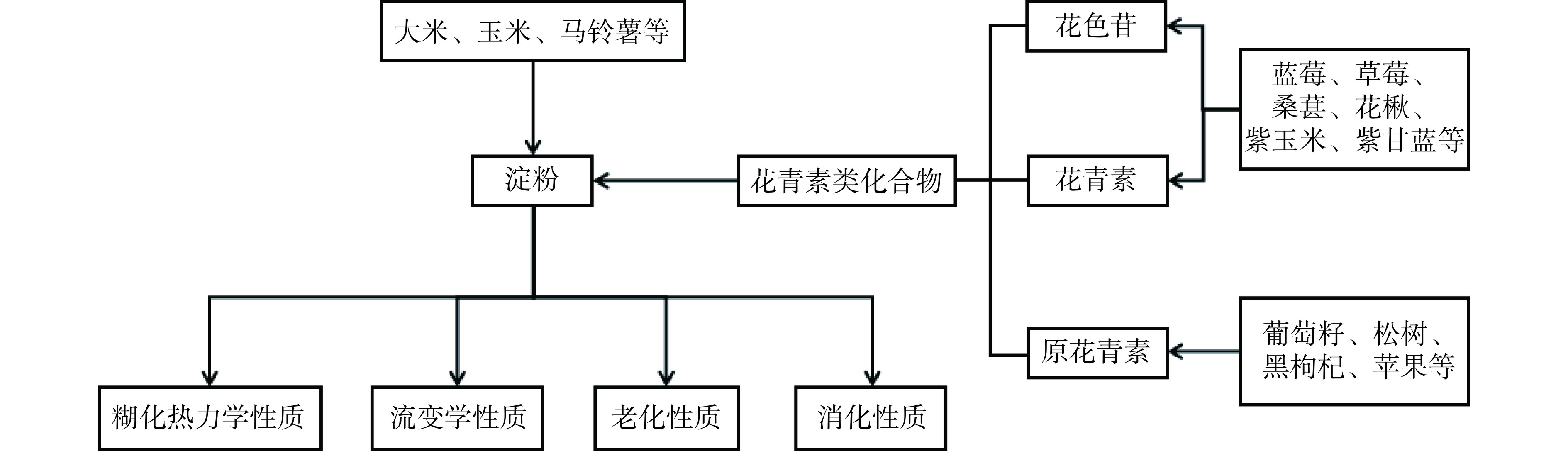 Anthocyanidin compounds include proanthocyanidins, anthocyanidins, anthocyanins, etc. Among them, proanthocyanidin is a kind of polyphenol compound, then anthocyanidin and anthocyanin belong to flavonoid compounds. When heated in an acidic medium, proanthocyanidins can produce anthocyanidins, which combine with sugars via glycosidic bonds to produce anthocyanins. Proanthocyanidins, anthocyanidins and anthocyanins are widely distributed in dark grains, berries and vegetables, all of them have various functional effects. Starch is low in price, rich in sources, and has a variety of functional properties. The sensory quality and nutritional value of starch-based foods are mainly determined by the changes of starch gelatinization properties, thermodynamic properties, rheological properties, aging properties and digestive properties. There have been many studies about the co-existence of starch and other compounds that can improve the original properties of starch. However, there is limited overview on the effects of anthocyanidin compounds on starch properties. Therefore, this paper reviews the latest research progress of anthocyanidin compounds and their effects on the gelatinization properties, thermodynamic properties, rheological properties, aging properties and digestive properties of starch through increasing the gelatinization temperature of starch and reducing its gelatinization enthalpy can affect its thermodynamic properties, as well as reduce its aging enthalpy and aging rate, additionally and the digestion rate of starch etc. These can provide guidance for the use of anthocyandin compounds to improve the processing properties, sensory and nutritional quality of starch-based foods.