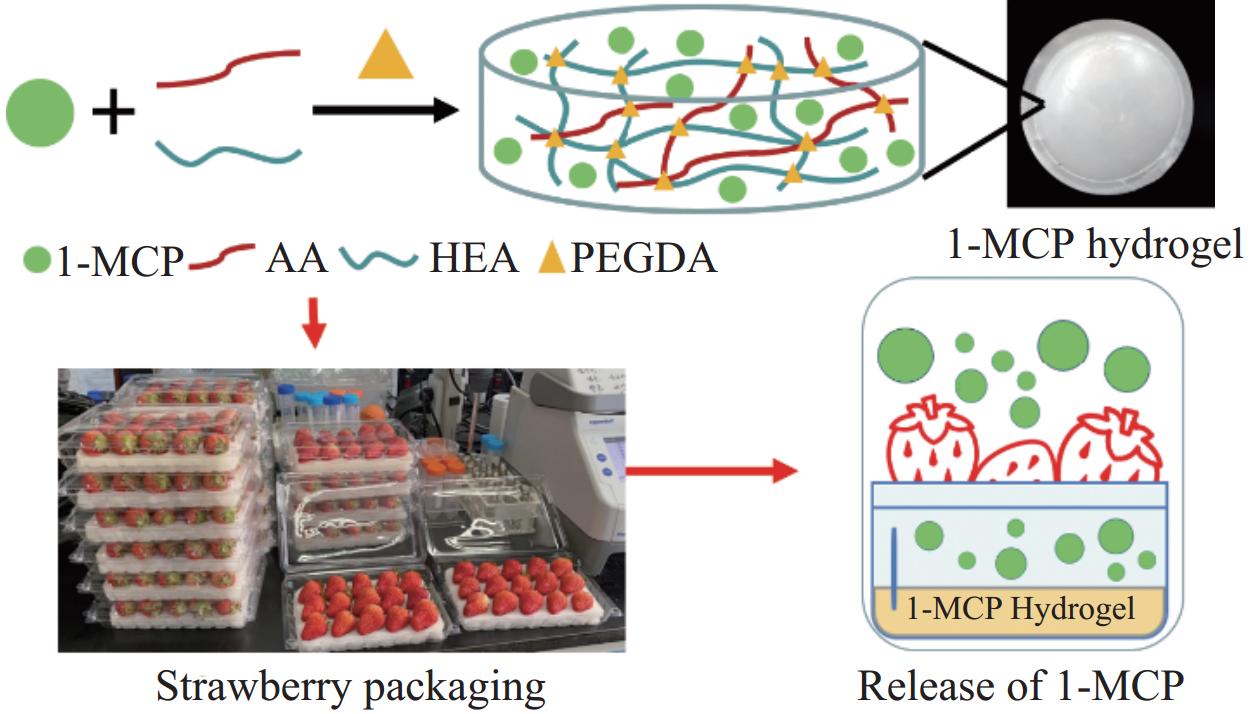 In recent years, extensive research had centered on the application of 1-methylcyclopropene (1-MCP) in fruit preservation, with a predominant focus on climacteric fruits. However, the development of efficient sustained-release products remained insufficient, and the effects of 1-MCP on the quality of non-climacteric fruits such as strawberry in postharvest were not fully understood. This research investigated the creation of a 1-MCP hydrogel-based controlled release product for strawberry preservation. The hydrogel system used in the preservative was synthesized using hydroxyethyl acrylate (HEA) and acrylic acid (AA) as monomers, with polyethylene glycol diacrylate (PEGDA) serving as a cross-linking agent. 1-MCP sustained-release hydrogel, which was referred to as 1-MCP hydrogel, was prepared by wrapping 1-MCP powder in a porous water gel system in an aqueous solvent system and initiated by diphenyl phosphorus oxide (TPO). The 1-MCP hydrogel was applied to the preservation of strawberry stored at room temperature. The results showed that the 1-MCP hydrogel had excellent 1-MCP sustained release performance, and could release 1-MCP evenly and slowly. Its release rate was 7% of the 1-MCP powder group and 3% of the 1-MCP powder solution group, respectively, at 12 h, achieving a long-term effective release. Fruit preservation experiments showed that the 1-MCP hydrogel group maintained a lower weight loss rate and decay rate, which were 20% and 21% lower than the control group on day 6, respectively. In addition, 1-MCP hydrogel maintained better fruit color, higher hardness, soluble solids content (TSS), and titratable acid content (TA). On day 2, the