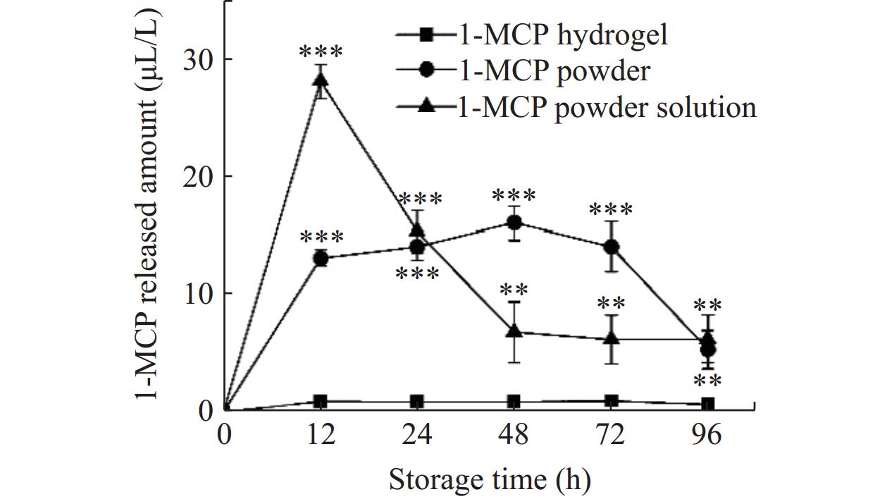 L* value of the experimental group were 11%, 11%, and 6% higher than the control group, respectively. The hardness, TSS, and TA on day 6 were 21%, 15%, and 18% higher than the control group, respectively. To sum up, 1-MCP hydrogel has multiple functions, such as the sustained release of 1-MCP, improving fruit quality. It is also convenient to prepare and can be used in the postharvest preservation of strawberries and potentially other fruit.