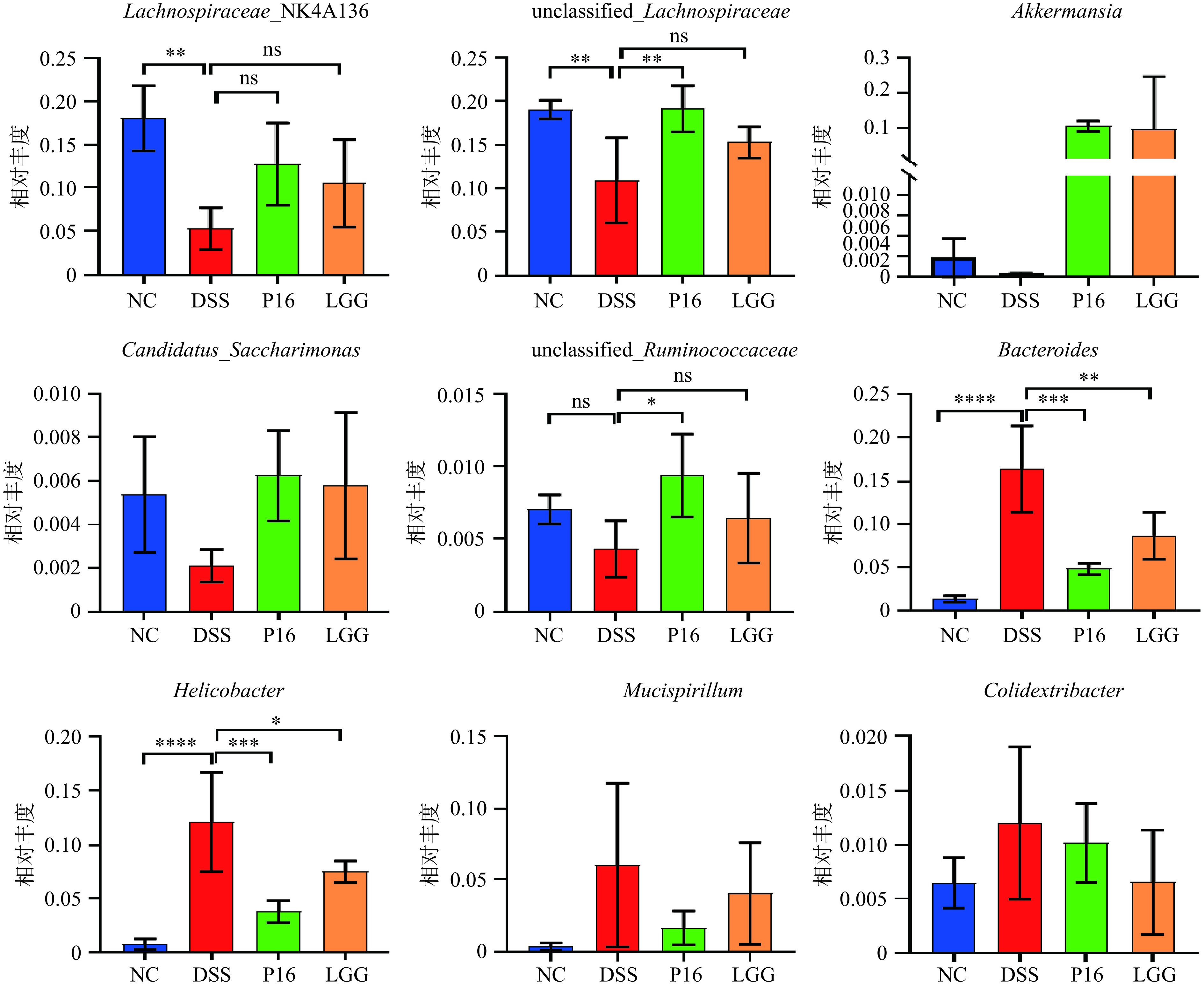 L. plantarum P16 group, and LGG group. The experiment lasted for 14 d, with the first 7 d of normal water intake followed by 7 d of free access to 3.5% DSS solution for the model, P16, and LGG to induce ulcerative colitis (UC). Throughout the experiment, the control and model groups were orally gavaged with 0.2 mL/d of saline, while the P16 and LGG groups were orally gavaged with 0.2 mL/d of the corresponding probiotic suspension at a concentration of 5×10