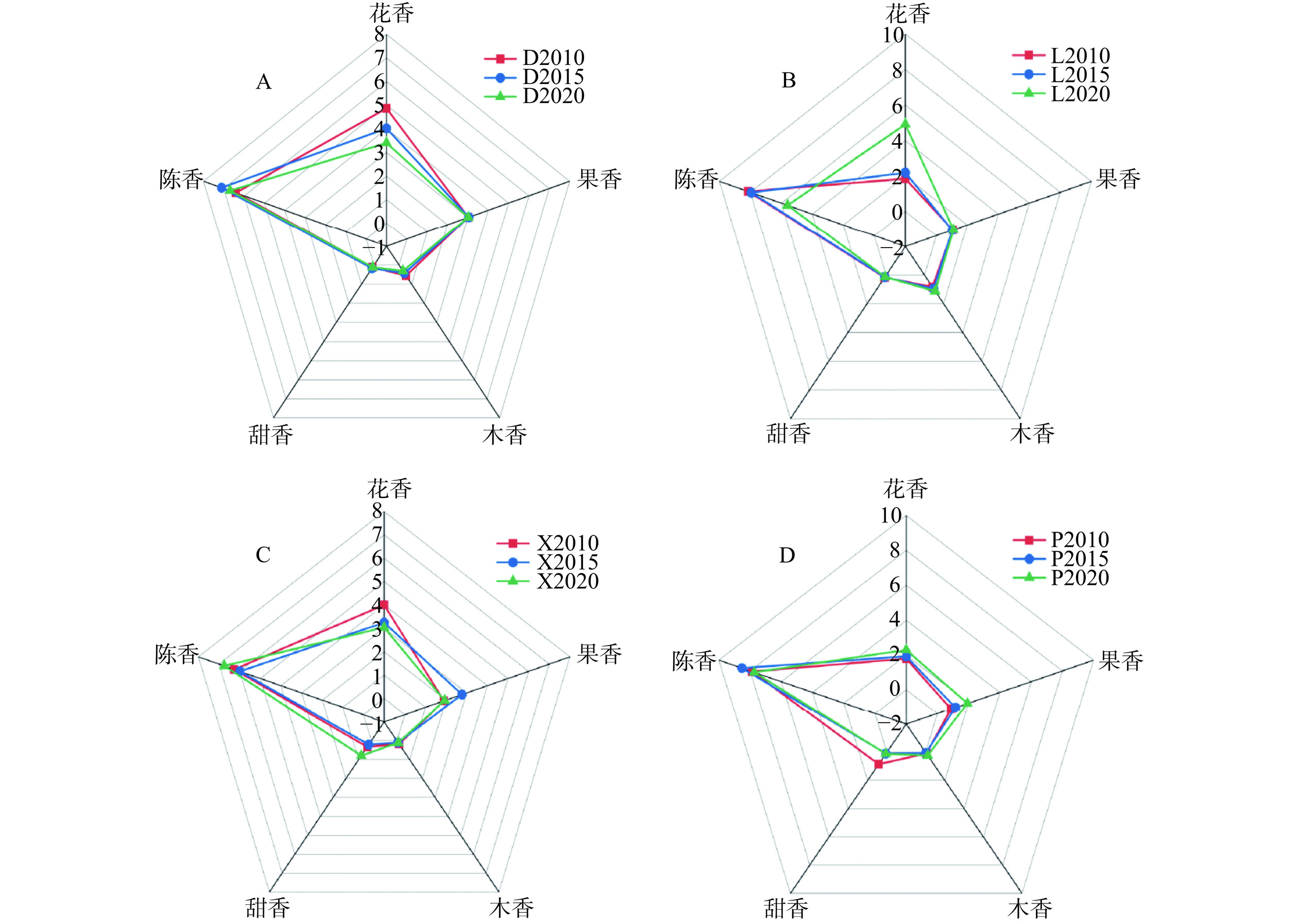 α-lononethere showed significant differences between different producing areas. The findings of the study reveal the characteristics of the aroma quality and provide a theoretical basis and data support for an accurate understanding of the aroma composition and changes in Pu-erh ripen tea from different producing areas and storage durations.