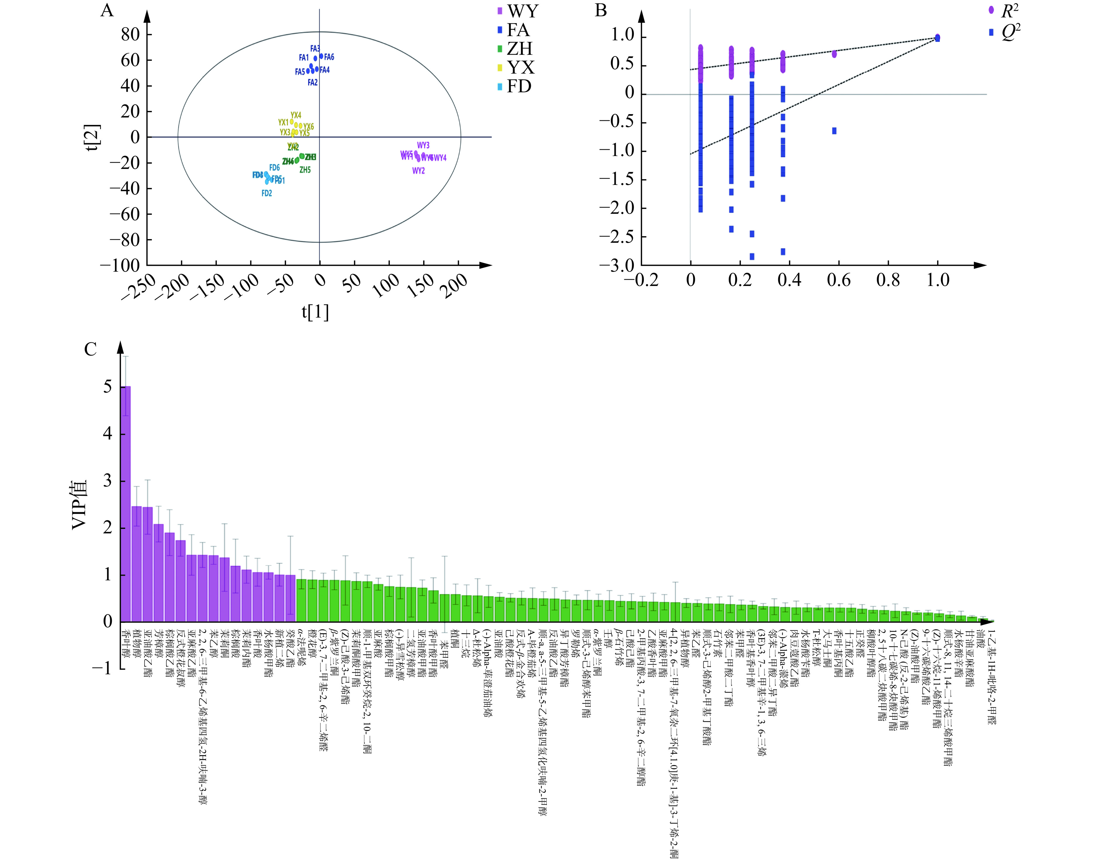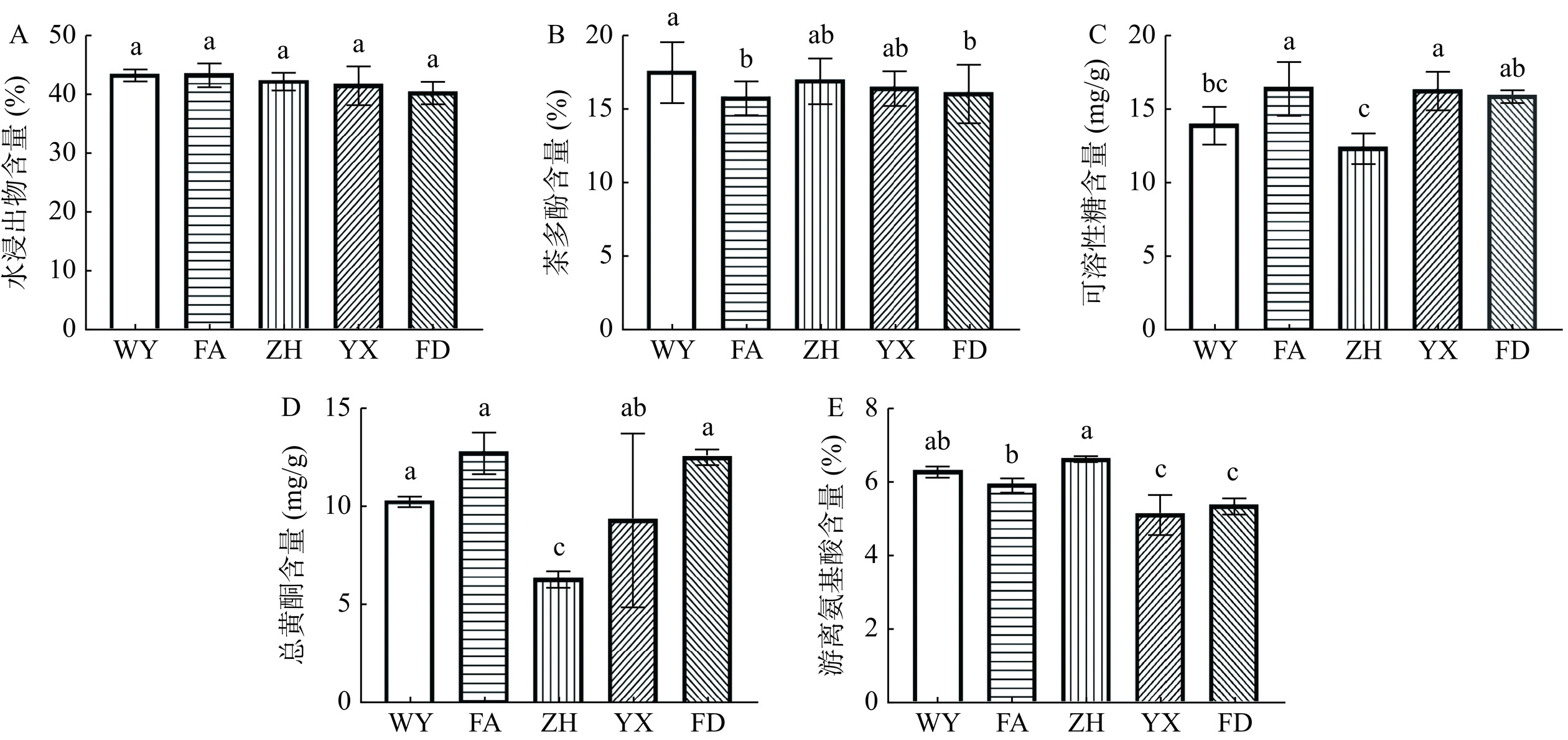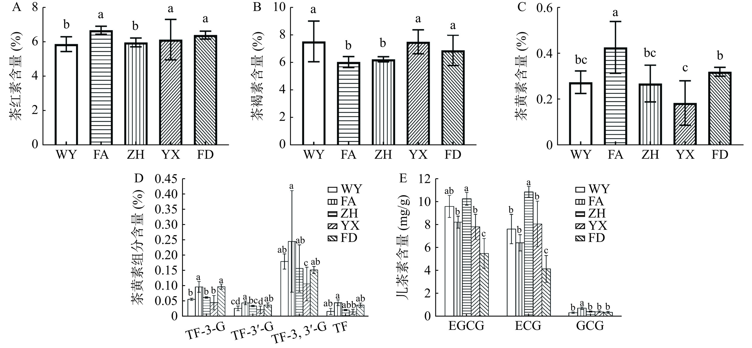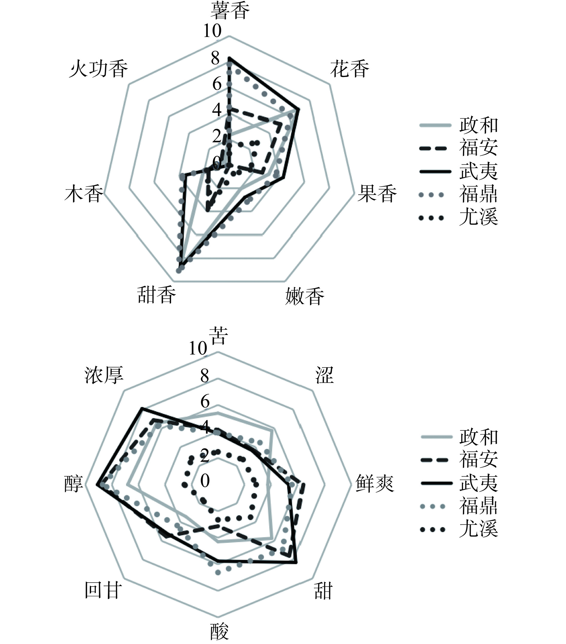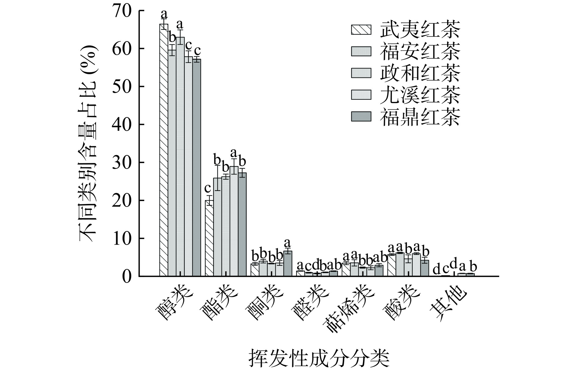 To further explore the flavor and quality characteristics of black tea from different regions of Fujian, with 30 samples of black tea sourced from 5 distinct regions within Fujian Province as research material, this study of the differences in flavor quality components of black tea from distinct regions in Fujian conducted a comprehensive analysis employing sensory evaluation, biochemical profiling, and aroma compound detection coupled with chemometric methodologies. The findings revealed that Fujian black tea was predominantly characterized by the aroma of potatoes, floral bouquets, and sweetness, with a taste profile that leant towards a mellow and sweet flavor. Notably, significant disparities existed in the flavor quality components of black tea across different regions. For instance, Wuyi black tea exhibited the highest levels of tea polyphenols (17.65%) and theabrownin (7.57%), whereas Fu'an black tea exhibited elevated concentrations of soluble sugars (16.45 mg/g), total flavonoids (12.81 mg/g), and theaflavin (0.43%) compared to its counterparts. Moreover, Zhenghe black tea exhibited higher levels of total catechins (21.56 mg/g) and free amino acids (6.66%) relative to other regions, whereas Youxi black tea presented the lowest theaflavin content (0.19%) among the samples. A total of 81 aroma compounds were identified across the samples, with alcohols and esters emerging as the primary aroma constituents. Notable contributors to the floral and fruity aroma of Wuyi black tea included linalool, phenylethanol, nerol, geraniol,