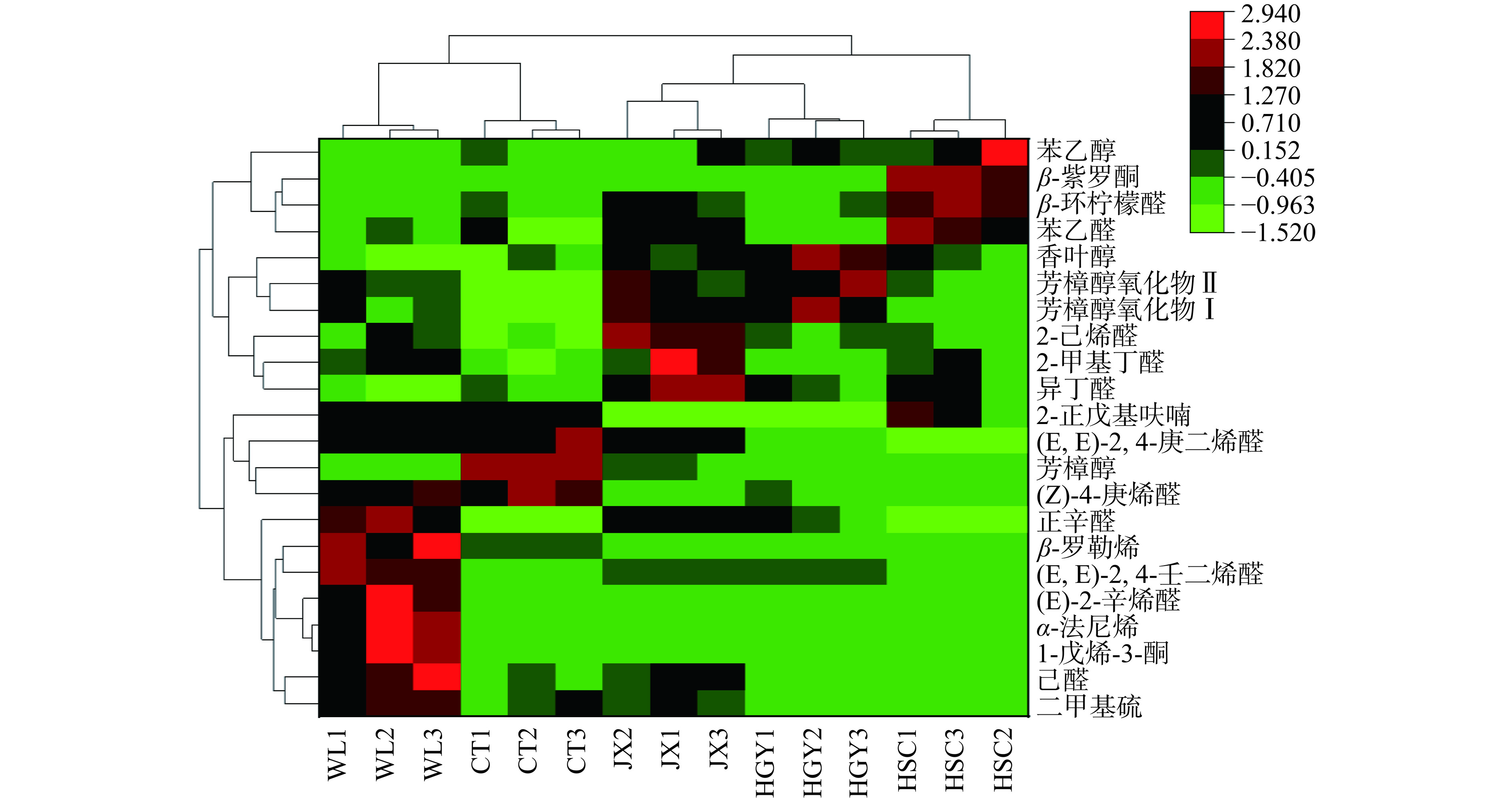 β-cyclocitral, linalool oxide I, trans,trans-nona-2,4-dienal, hexanal, 1-penten-3-one, linalool oxide II, linalool and geraniol. Determination of flowery black tea aroma characteristics by OAV combined with chemometrics methods was consistent with the sensory results. The results of this experiment can clarify the differences in volatile substances in flowery black tea and provide for further optimization of volatile component analysis methods.
