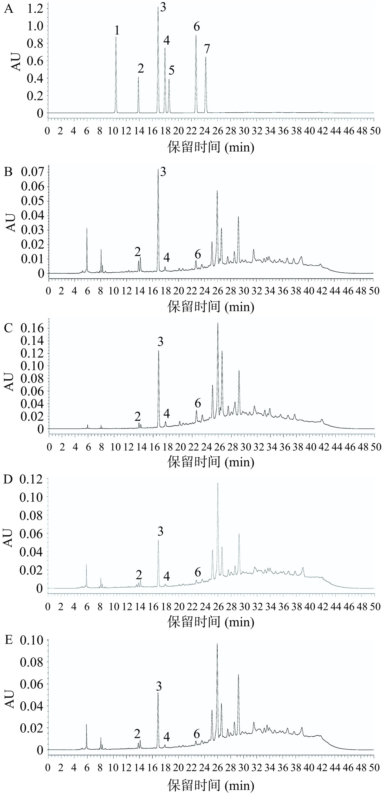 P<0.05). The total flavonoid content of ethanol extract (EE) was 14.90%, which was higher than that of AE, ethyl acetate extract (EAE) and mixed solvent extract (MSE). The highest total sterol content was observed in EAE with the value of 12.61%. Interestingly, AE showed the highest content of protocatechuic aldehyde, protocatechuic acid, caffeic acid and p-coumaric acid with the values of 602.09, 90.25, 6.24, and 5.57 μg/100 mg, respectively. Its total content of phenolic acids were significantly higher than those in EE, EAE and MSE (