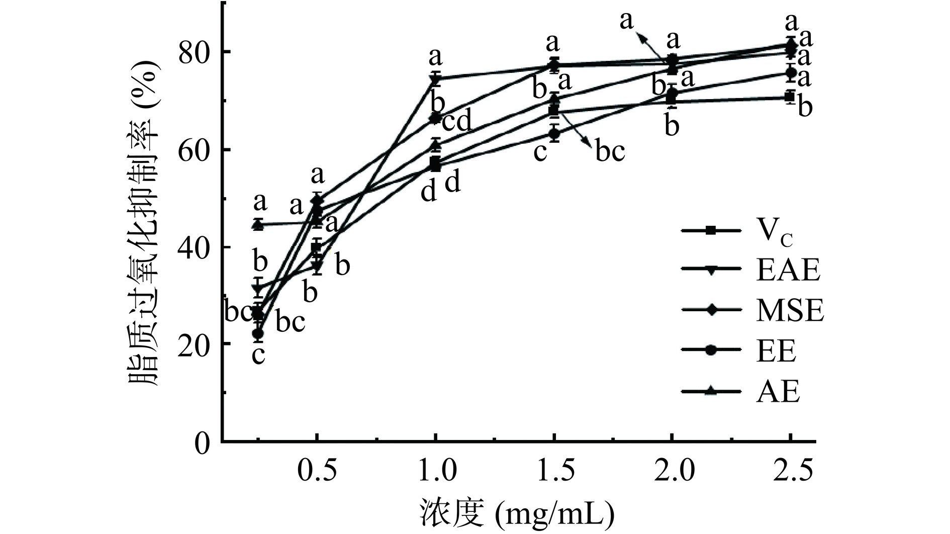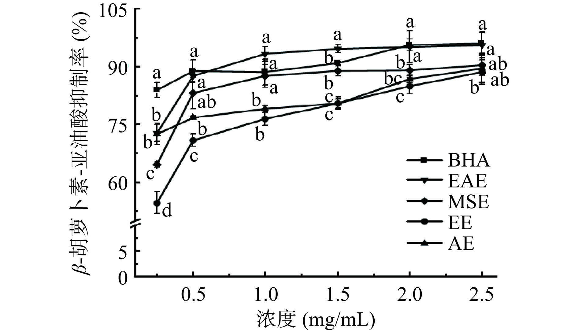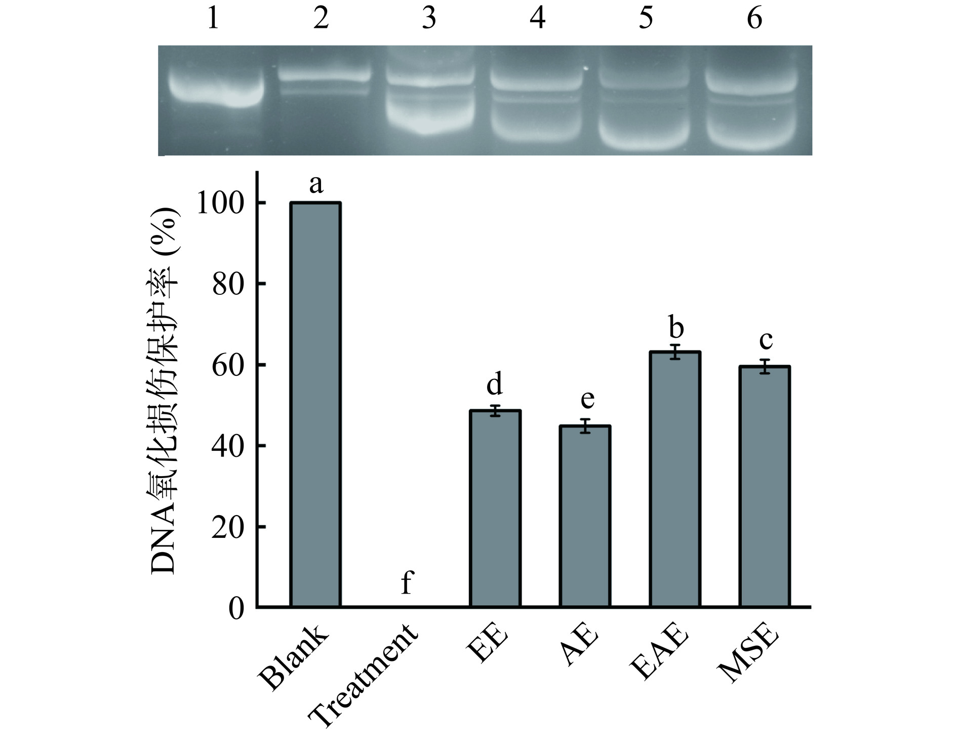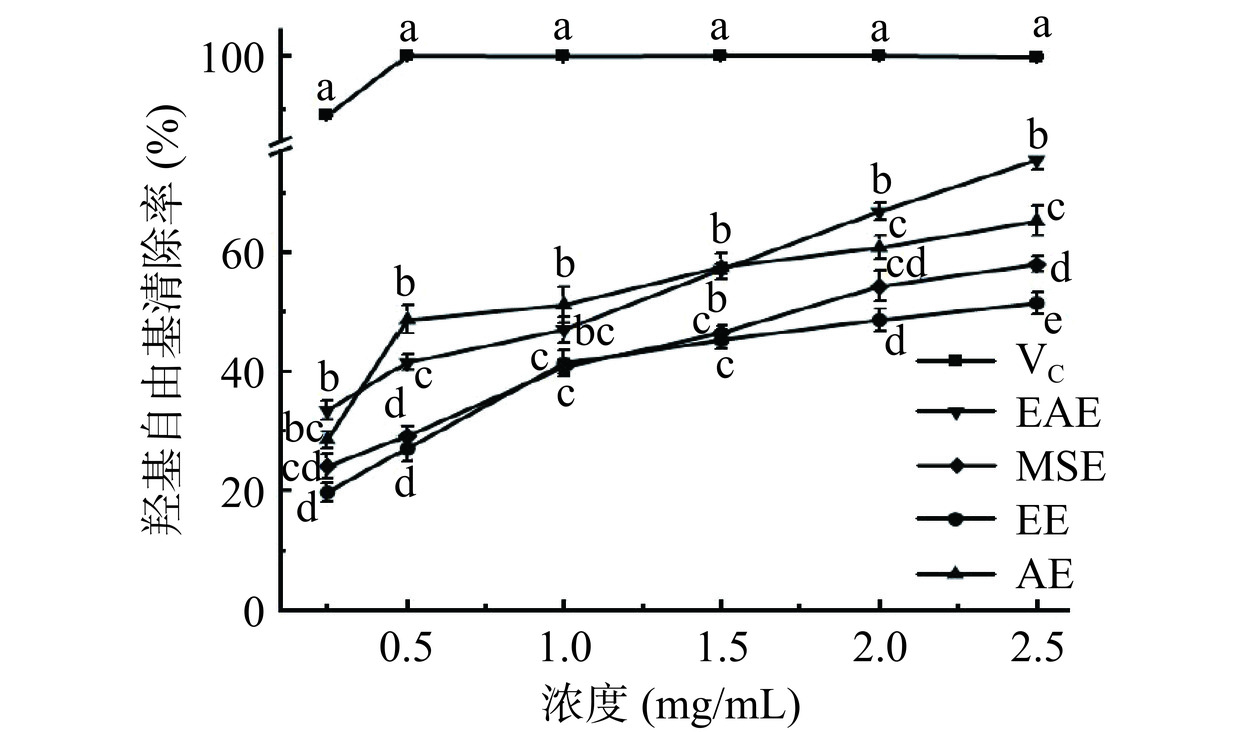 β-carotene-linoleic acid oxidation inhibition capacities of EAE were higher than those of EE, AE, and MSE. Its hydroxyl radical scavenging and DNA oxidative damage protection ability were significantly higher than that of EE, AE and MSE (