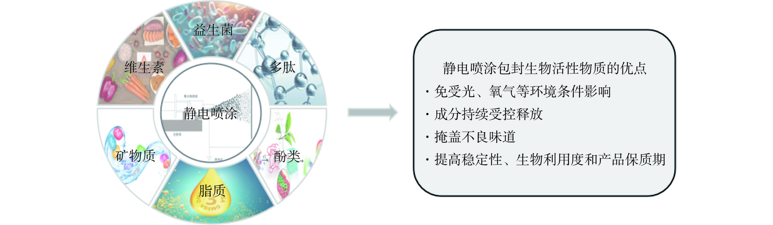 The non-thermophysical nature of electrospraying has been extensively documented, with high-voltage electrostatic fields being employed to achieve continuous fabrication of micro/nano particulates. Significant attention has been garnered within the food sector, particularly due to the operational advantages including facile processing protocols, ambient condition compatibility, and exceptional encapsulation performance. Therefore, this review systematically reviews the underlying mechanisms of electrospraying, with particular emphasis on the interdependent effects of polymer solution properties, process parameters, and environmental parameters on particulate morphology and encapsulation efficiency. This review systematically categorizes commonly utilized encapsulation materials, encompassing proteins (e.g., zein, whey protein, gelatin) and polysaccharides (e.g., alginate, chitosan, pullulan), with their respective functional properties and application scenarios being comparatively analyzed. Additionally, this review systematically outlines the current applications of electrospraying technology in both bioactive compound encapsulation and advanced food packaging systems. Furthermore, critical analysis is provided on existing technical limitations and future research directions, which aims to establish a theoretical foundation and inspire innovative developments in food-oriented electrospraying research.