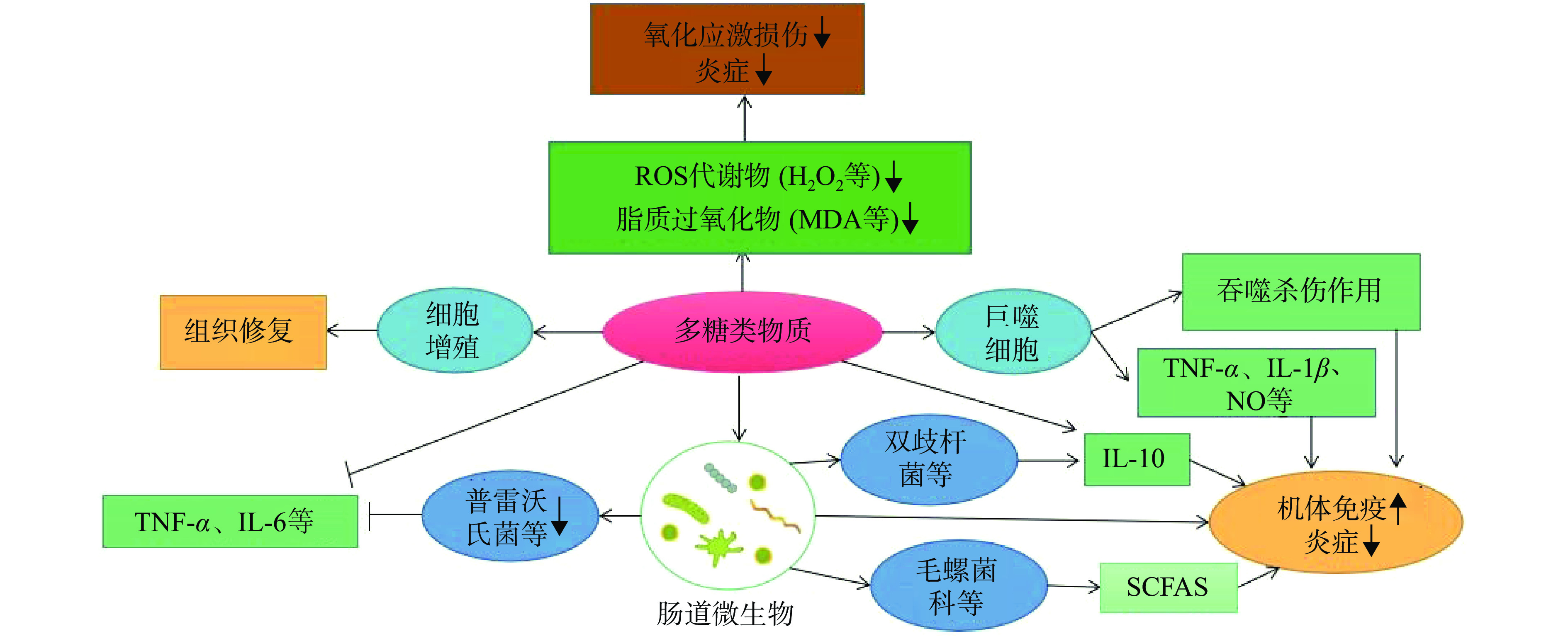 Plant polysaccharides, one of the main sources of polysaccharides, has many important pharmacological functions. This paper reviews the research progress of anti-inflammatory activity of plant polysaccharides in recent years, focusing on the anti-inflammatory mechanism from four perspectives: Antioxidant stress, regulating cytokine secretion, regulating neutrophils, improving intestinal flora and intestinal mucosal barrier. At the same time, this paper also analyzes the structure-activity relationship of anti-inflammatory activity of plant polysaccharides, such as average molecular weight, monosaccharide composition and glycosidic bond types, main chain and side chain, chemical modification and high-level structure, and summarizes the research progress of plant polysaccharide anti-inflammatory activity, which lays a foundation in theory for the further development and application of anti-inflammatory drugs and foods.
