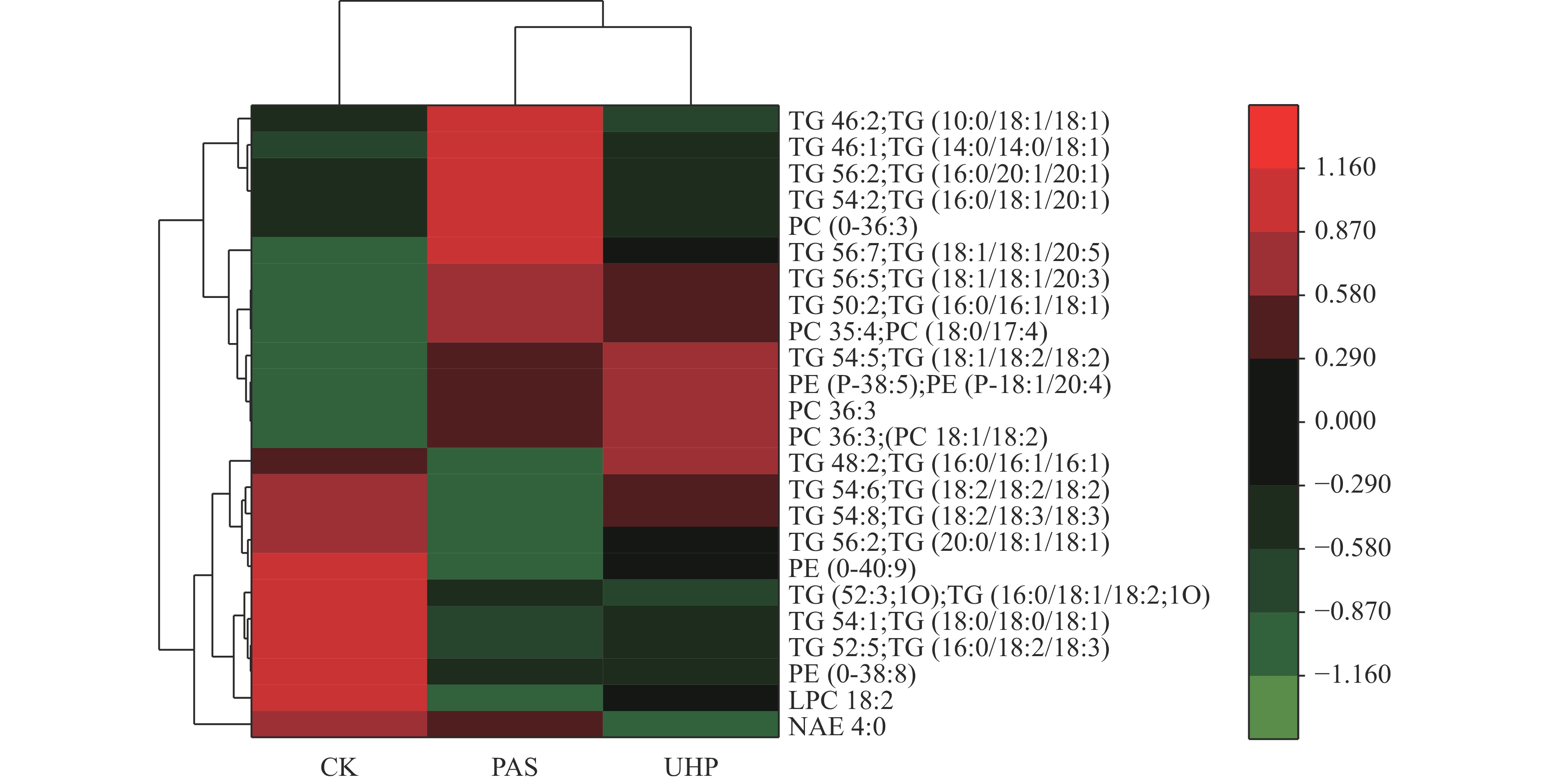 To investigate the changes of lipids and volatile flavor components of Chinese braised pork in brown sauce after sterilization processes, quantitative analysis of the whole lipid components of unpasteurized, pasteurized, and ultra-high pressure (UHP) braised pork in the brown sauce was conducted using ultra-performance liquid chromatography coupled with quadrupole-time of flight mass spectrometry. A total of 251 different lipids were identified. Partial least squares discriminant analysis and hierarchical clustering analysis were used to successfully distinguish the braised pork samples processed with different sterilization methods. Among them, 24 lipid substances were the key compounds to effectively distinguish the lipids, including 15 types of triglycerides (TG), 8 types of phospholipids, and N-acylethanolamine. According to the relative contents of lipid compounds, the braised meat after UHP sterilization was closer to the control group than the ones pasteurized. Using solid-phase micro-extraction coupled with gas chromatography-mass spectrometry, the types and contents of volatile components in braised pork under different sterilization methods were compared. A total of 31 volatile flavor components were identified, including 4 types of alcohols, 4 types of acids, 4 types of lipids, 7 types of alkanes, 2 types of ketones, and 9 types of aldehydes and furan. Based on these results, it was found that the UHP sterilization could maintain the original flavor and lipid composition of Chinese braised pork in brown sauce, which had great potential in meat processing and Chinese cuisine preparation.