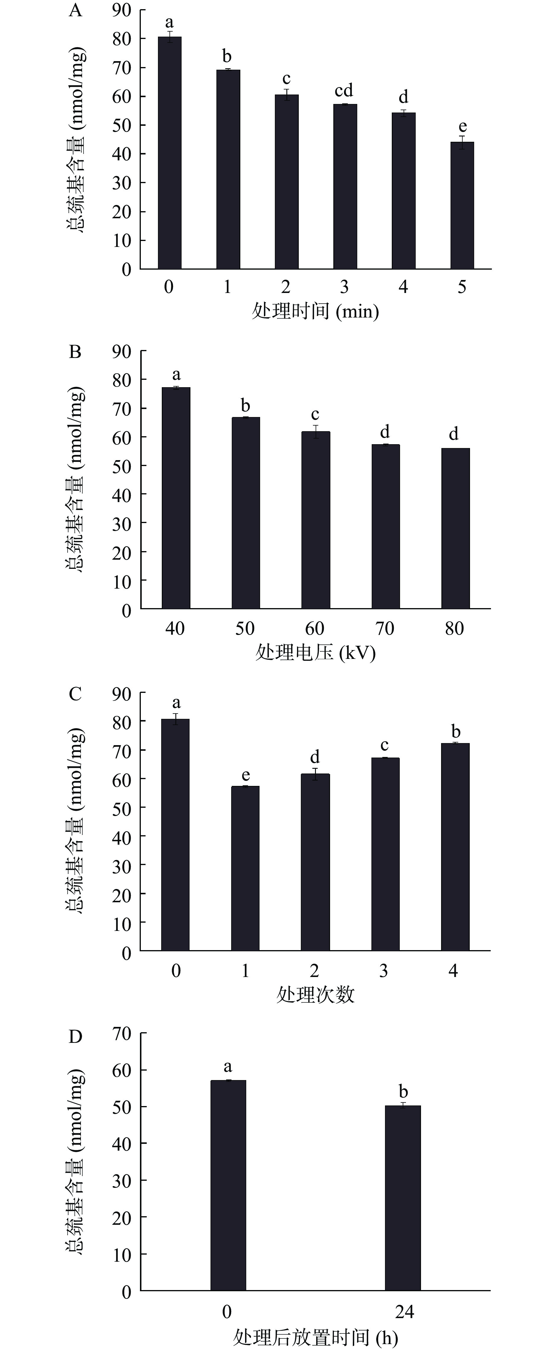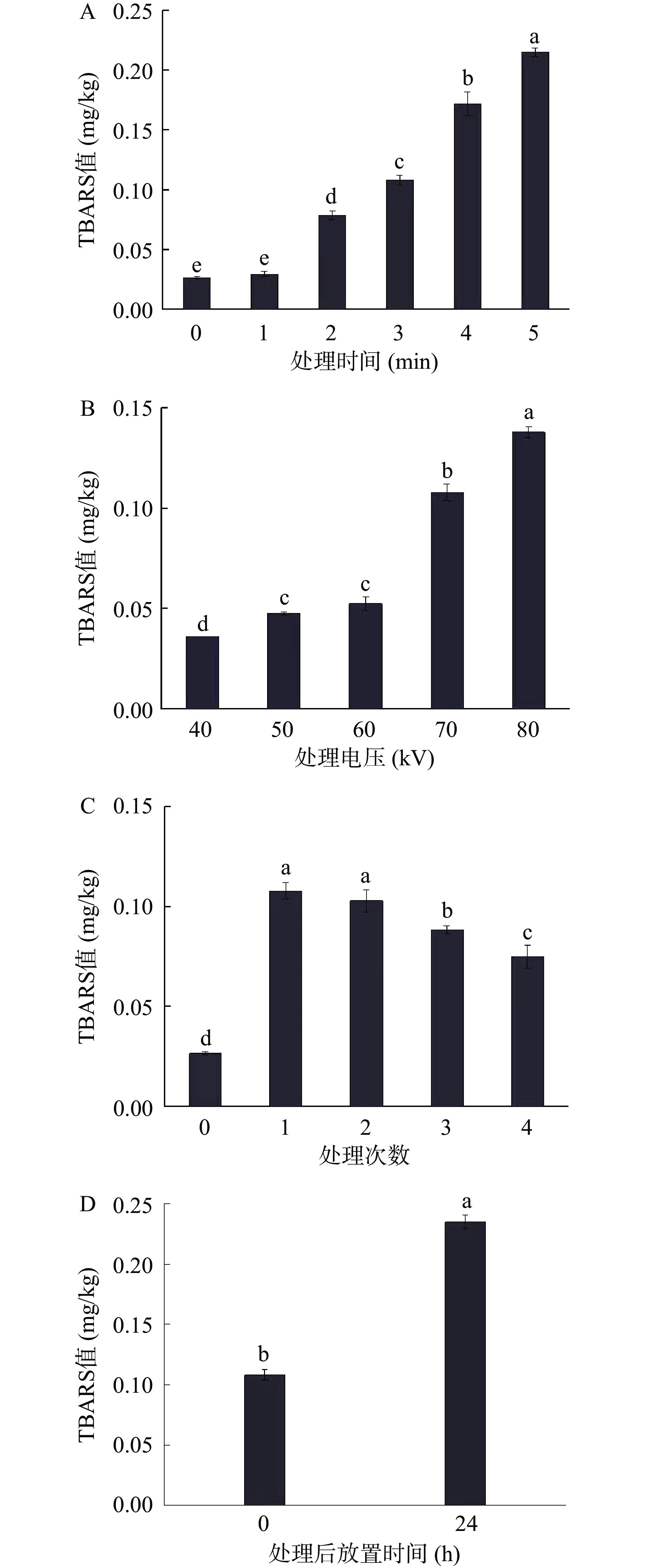 P>0.05). TBARS value, carbonyl content and surface hydrophobicity were increased gradually with the extension of treatment time, treatment voltage and storage time after treatment. When the treatment time was as long as 5 min, TBARS value of mutton was increased to 0.215 mg/kg, the pH value and total sulfhydryl content of mutton showed the opposite trend. When total treatment time was fixed (3 min), with the increase of treatment times, TBARS value, carbonyl content, and surface hydrophobicity of mutton were decreased, while pH value and total sulfhydryl content were increased. Therefore, cold plasma treatment could not affect the color significantly. However it promoted the oxidation of both lipids and protein in mutton.