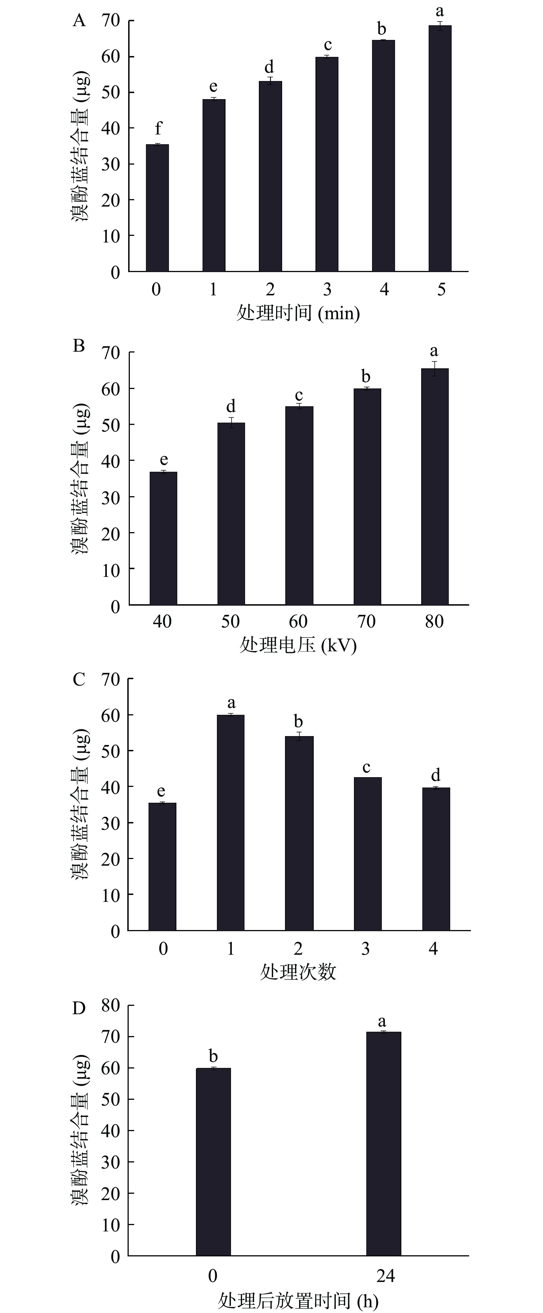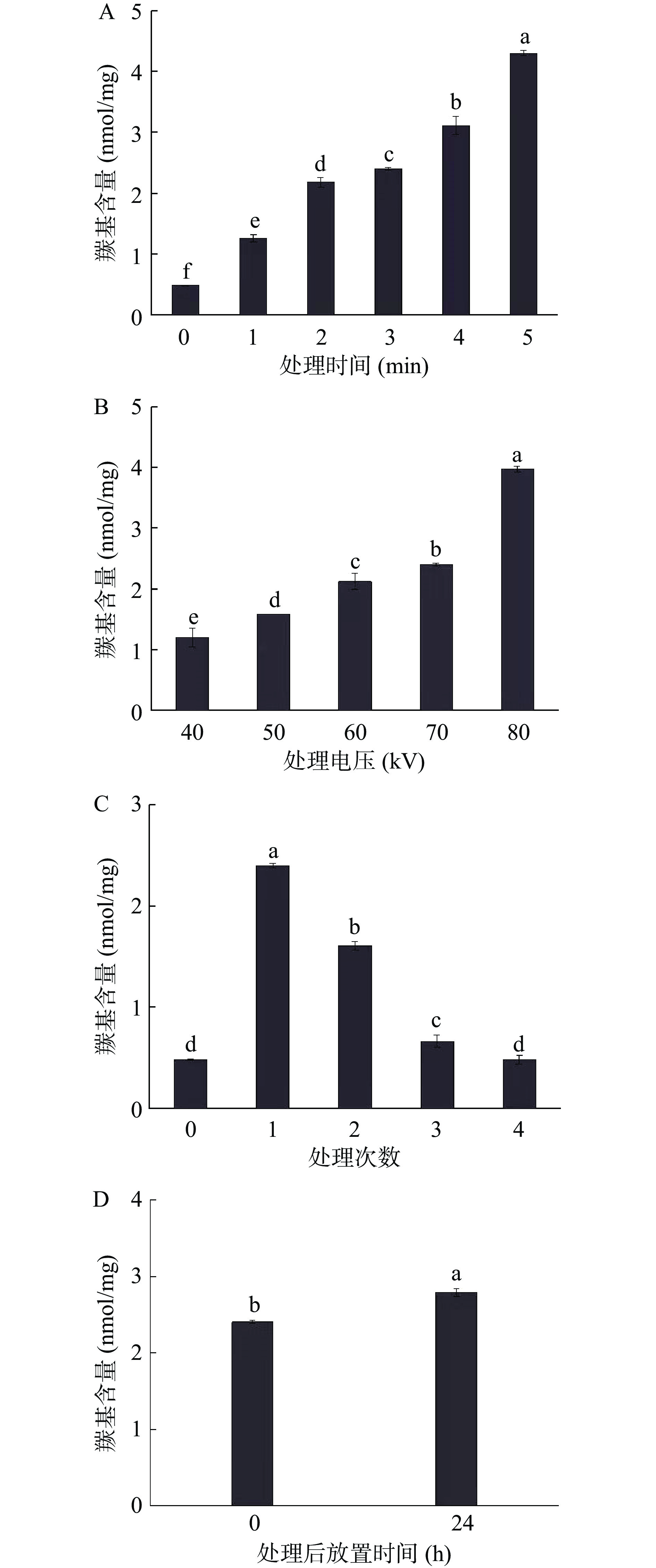 With fresh mutton as the research object, the effects of different cold plasma treatment conditions (treatment time, treatment voltage, treatment times, post-storage time after treatment) on mutton were studied by measuring mutton chromatism, pH value, thiobarbituric acid-reactive substances (TBARS) value, carbonyl content, total sulfhydryl content, and protein surface hydrophobicity. The results showed that cold plasma treatment increased