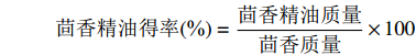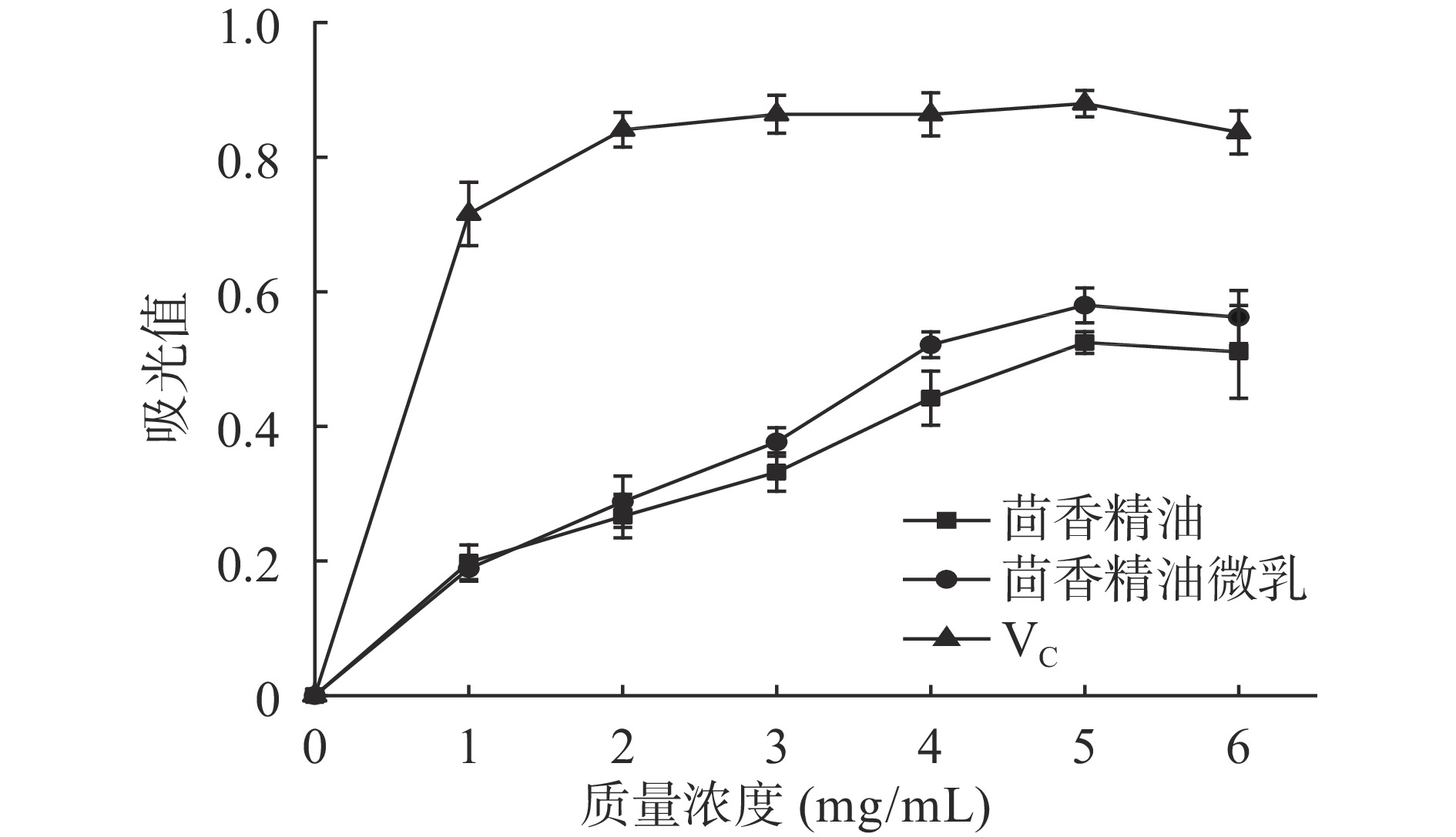 In this study, the extraction process of fennel essential oil was optimized by response surface methodology. Fennel essential oil was used as oil phase, Tween 80+40 as surfactant and glycerol as cosurfactant to prepare fennel essential oil microemulsion system. The structure, particle size, total reducing power and storage property of fennel essential oil microemulsion were investigated by rheology, particle size analyzer and reduction reaction. The results showed that the yield of essential oil of fennel was as high as 15.99%±0.10% when the ratio of material to liquid was 1:8.40 g/mL, the extraction time was 4.09 h, the particle size was 80 mesh, and the extraction temperature 80 ℃. The diameter of fennel essential oil microemulsion was 30.92±0.13 nm, and when the moisture content was higher than 60%, it was a stable O/W microemulsion. The emulsification of fennel essential oil significantly improved the total reducing power of fennel essential oil. According to the principle of chemical reaction kinetics, the Arrhenius equation was established as k=2518.85·e