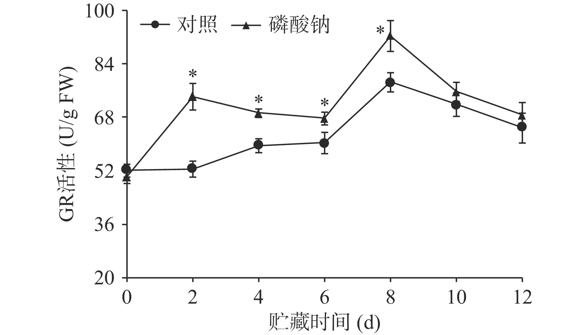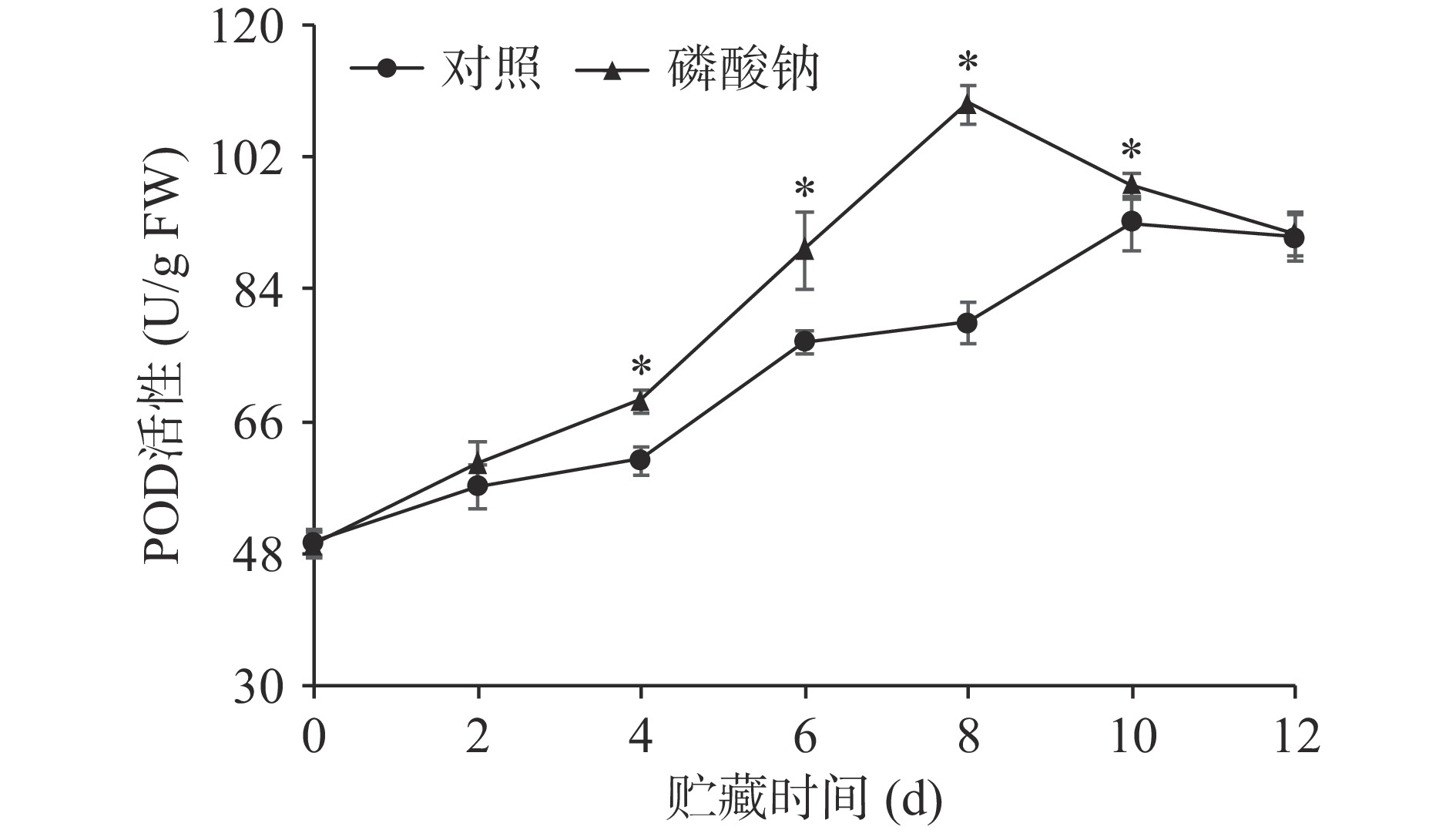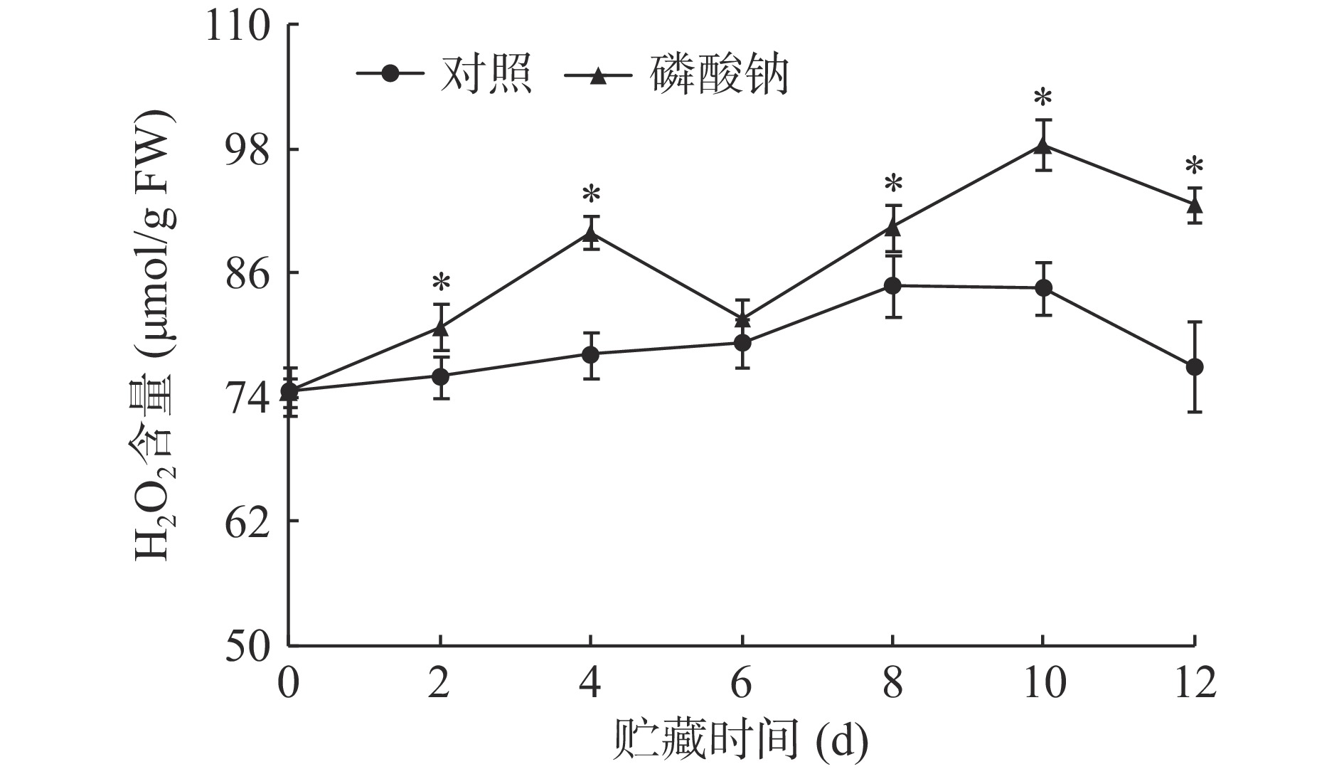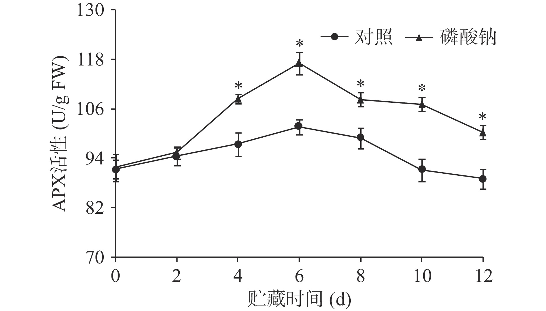Jujube fruit (cv. Sanxing) were soaked in 0.5 mg/mL trisodium phosphate solution for 10 min after harvest to study its effects on key enzymes activities and phenolic compounds accumulation in reactive oxygen species metabolism and phenylpropanoid pathway during storage at room temperature. Results showed that trisodium phosphate promoted hydrogen peroxide content during the entire storage time and peaked at 4 d and 10 d. Additionally, trisodium phosphate treatment distinctly increased the activities of ascorbate peroxidase and glutathione reductase on days 4~12 d and 4~8 d of storage (