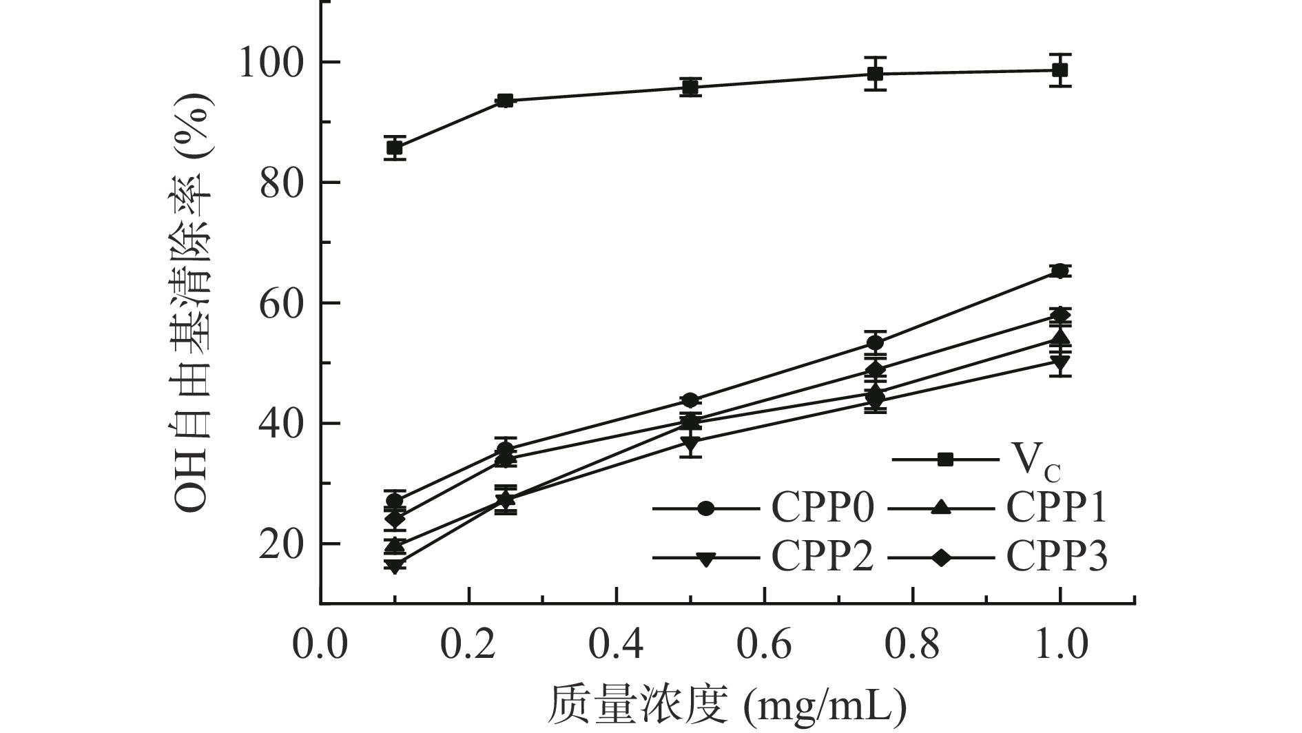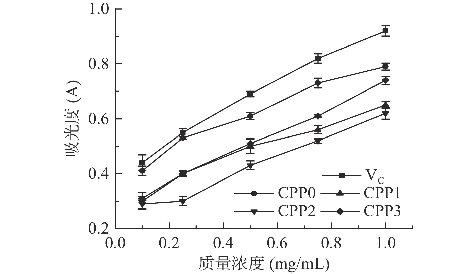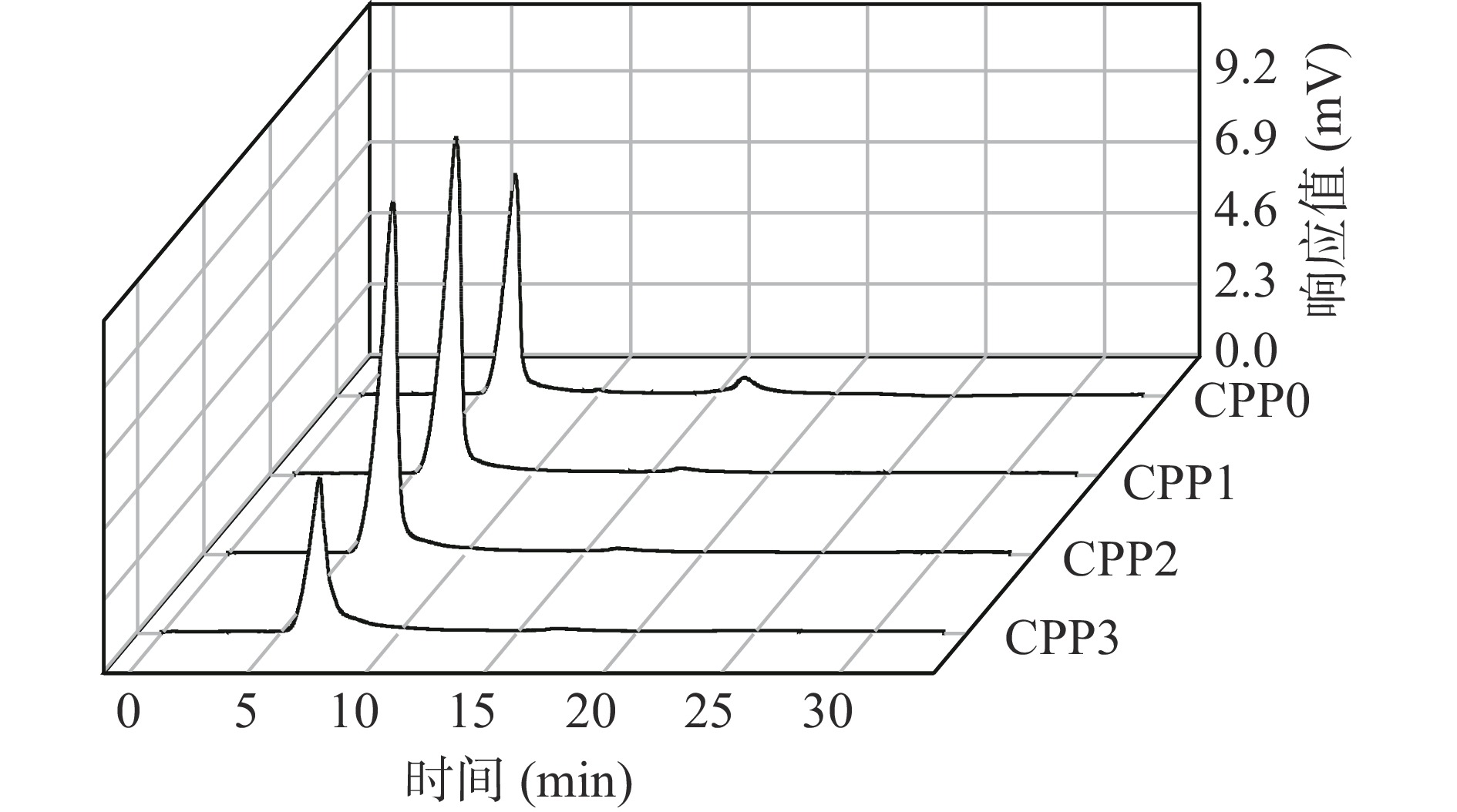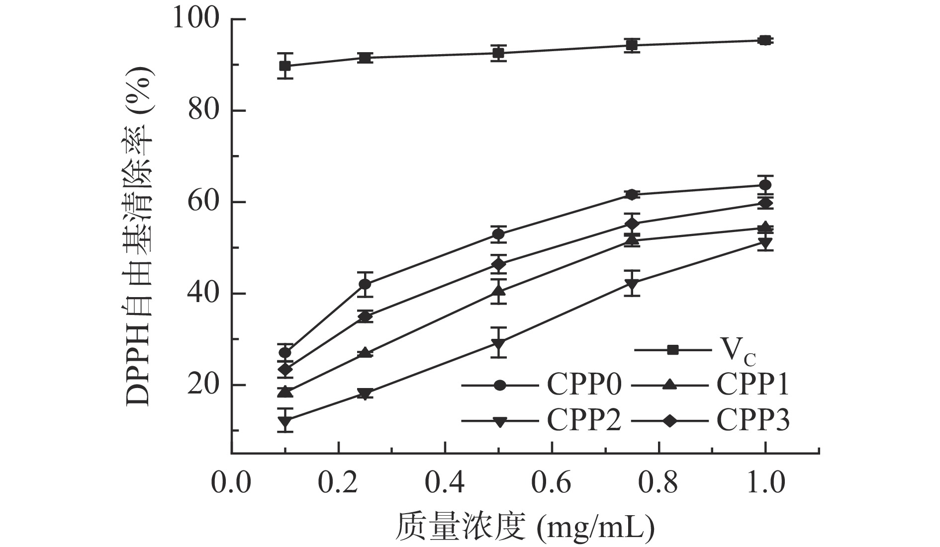 Objective: In this experiment, polysaccharides from cortex periplocae (CPP) were isolated and purified, and their monosaccharide composition and antioxidant activity were investigated, so as to provide a reference for the development and application of CPP in the food industry. Methods: The crude polysaccharides were obtained by aqueous extraction, alcoholic precipitation and protein removal by Sevag method, and four polysaccharide fractions CPP0, CPP1, CPP2 and CPP3 were separated and purified by DEAE-52 cellulose column. The chemical composition, molecular weight, monosaccharide composition, infrared spectrum and antioxidant activity were analyzed. Results: The sugar contents of these four polysaccharides were 82.20%, 77.13%, 75.23% and 72.85%, respectively, and all of them contained glyoxylate. The relative molecular weights were 685, 477, 411 and 572 kDa, respectively. The four polysaccharides were all heteropolysaccharides composed of mannose, rhamnose, galacturonic acid, glucose, galactose and arabinose in different molar ratios. The infrared spectra showed that four polysaccharides contained