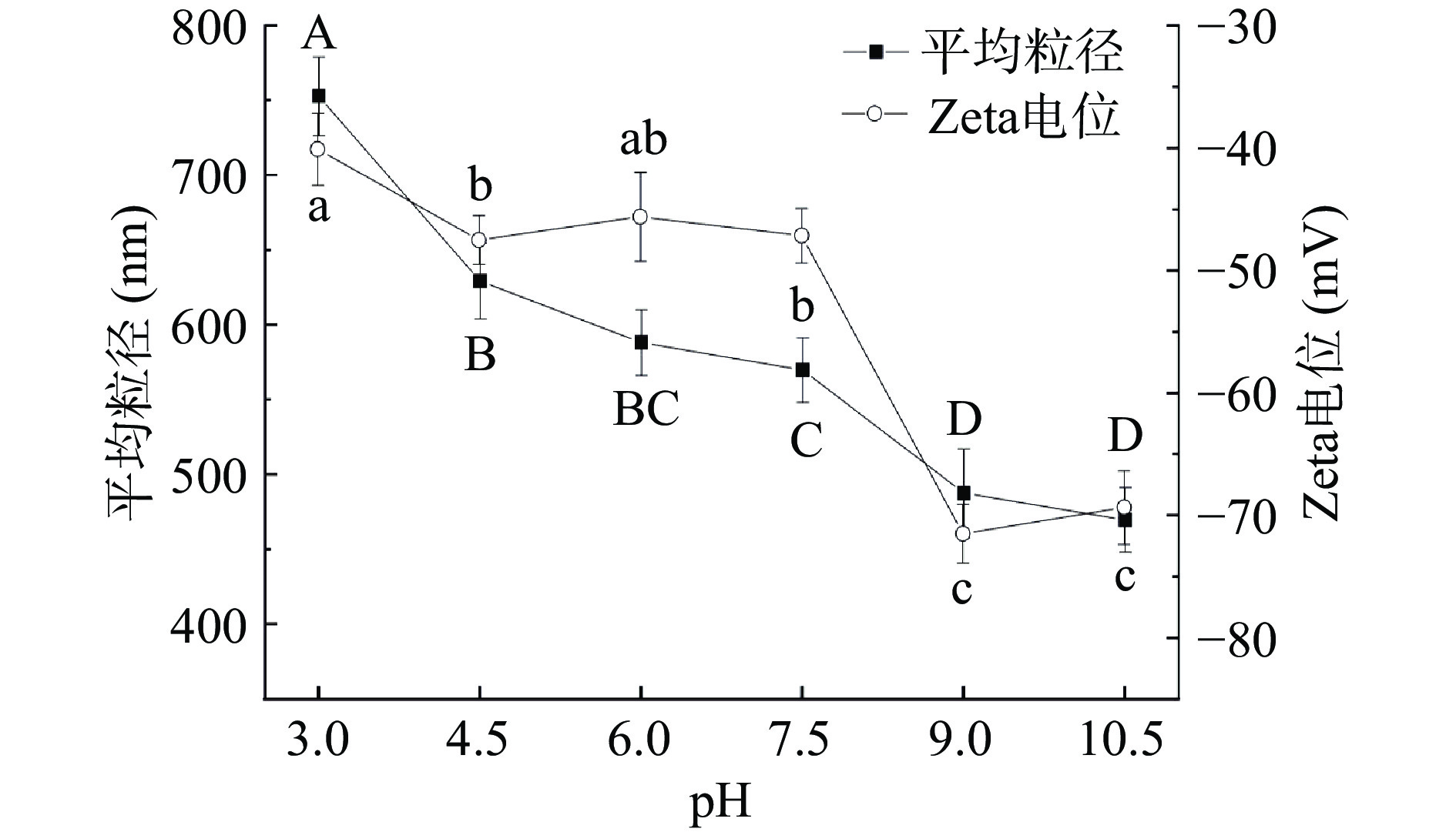 In this study, the Pickering emulsion of soybean protein isolate (SPI)-carrageenan-xanthan terpolymer was prepared. The effects of ratio of SPI to carraneenan-xanthan, pH, mass concentration of carraneenan, mass concentration of xanthan and volume of soybean oil on the particle size, Zeta potential, emulsifying activity index (EAI), emulsifying stability index (ESI) and SPI secondary structure of Pickering emulsion system were all investigated. Besides, the characteristics of emulsion system with different volume of inner phase during storage at normal temperature were studied. The results showed that the stability of Pickering emulsion of SPI-carrageenan-xanthan terpolymer was good, when the mass concentration ratio of SPI to the complex polysaccharide was 1:10, pH was 9.0, the mass concentration of carrageenan and xanthan both were 0.2%, and the oil volume was 10%~85%. Under this conditions, the average particle size of Pickering emulsion of SPI-carrageenan-xanthan terpolymer was 351±24.12 nm, and the absolute value of Zeta potential was 99.4±1.4 mV. As the inner phase volume of soybean oil increased from 10% to 85%, the particles size distribution of Pickering emulsion became more uniform and stable. When the oil volume was 75%, the dispersion state of emulsion particles was the best, EAI and ESI reached the maximum, and