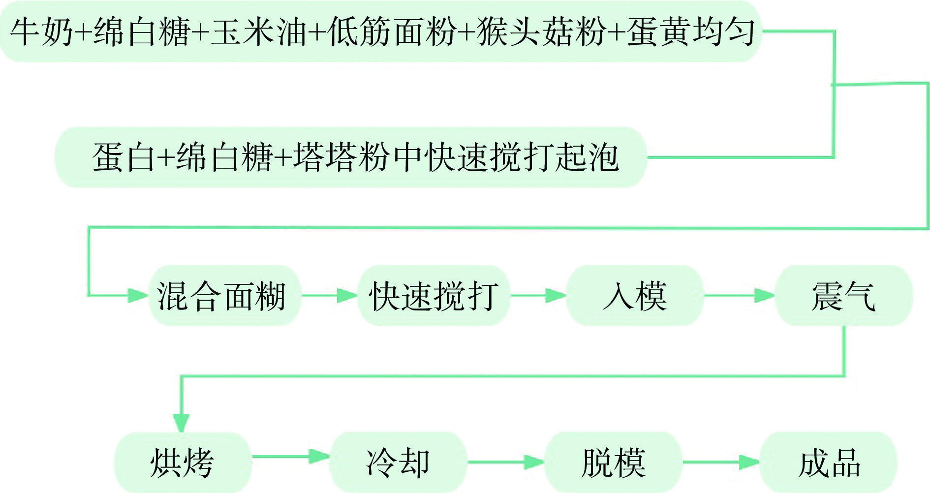 Hericium erinaceus powder 22.40 g, low gluten flour 100 g, milk 75 g, white sugar 93.70 g, corn oil 45 g, egg 242.85 g and tata powder 1 g.