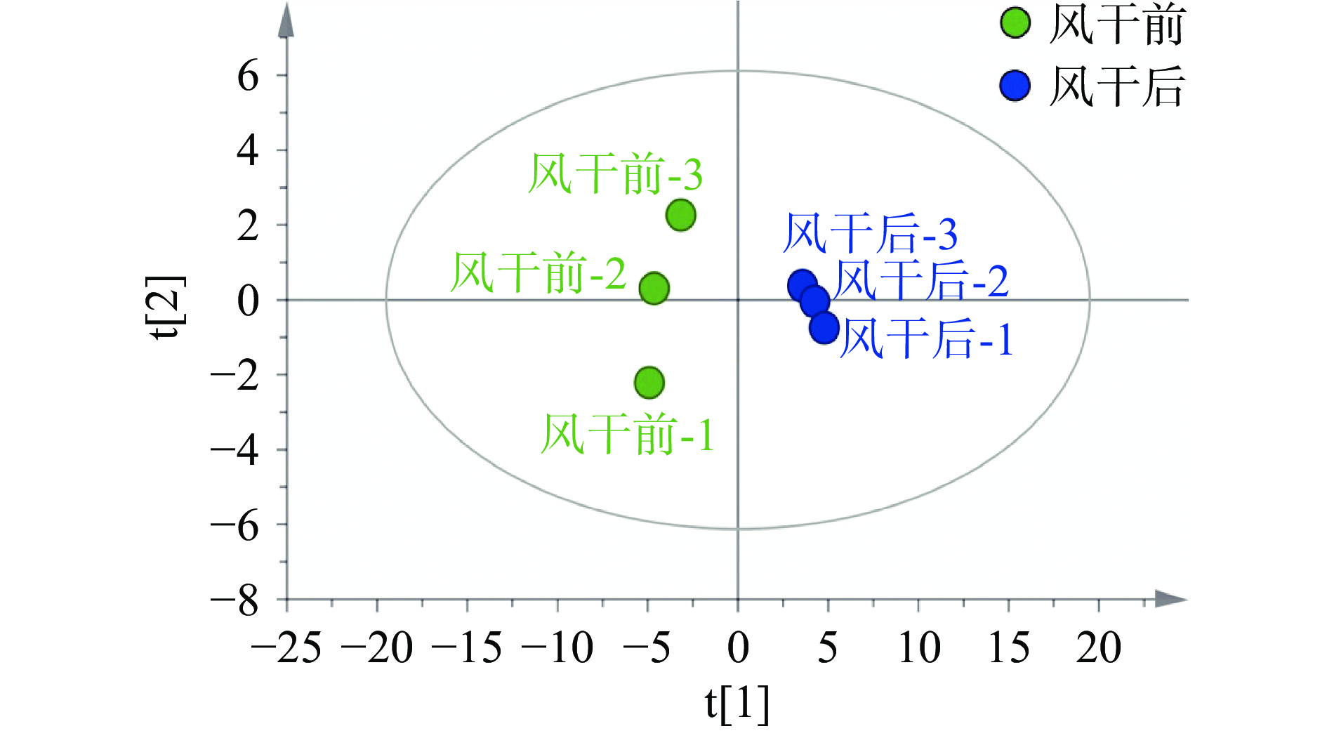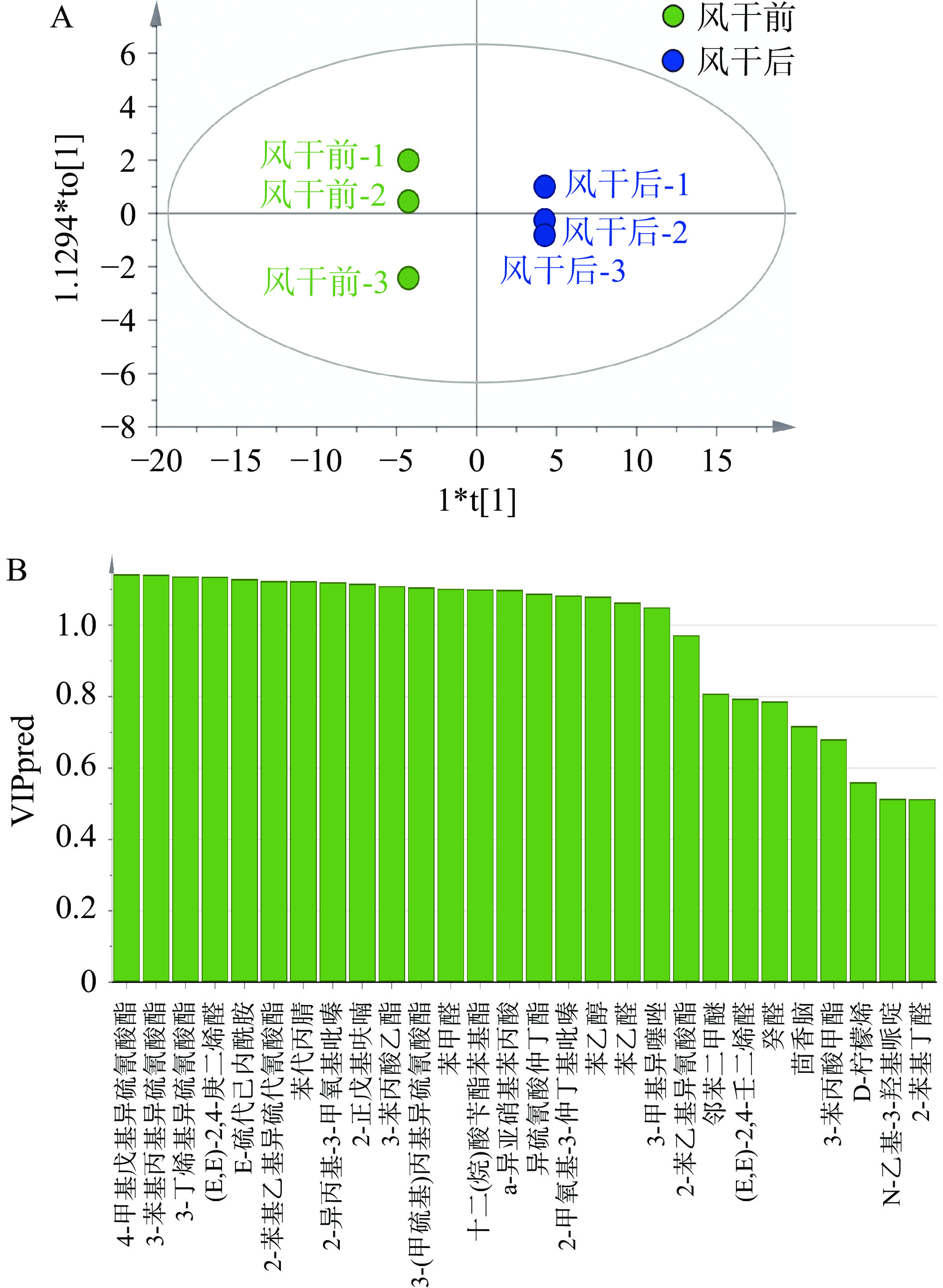P<0.05). A total of 24 and 18 volatile flavor substances were respectively detected from the mustard roots before and after air-drying through GC-MS. Moreover, the types and contents of volatile substances in raw mustard roots before and after air-drying significantly changed, among which the relative contents of sec-butyl-isothiocyanato and benzenepropanenitrile in the air-dried raw mustard roots respectively increased to 1.362% and 65.870%. Nineteen characteristic volatile markers (VIP>1,
