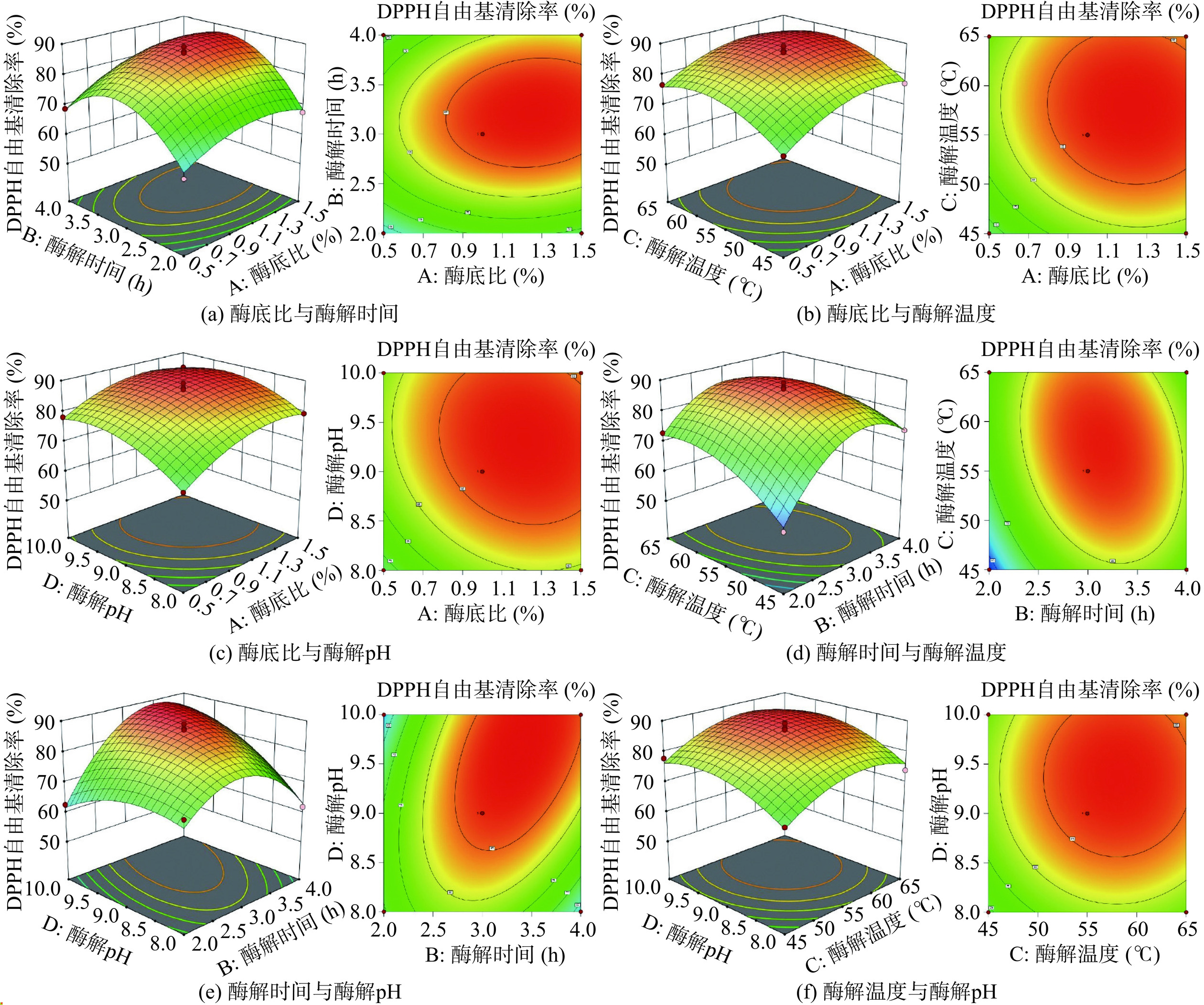 Schisandra chinensis protein and the comprehensive evaluation of molecular weight in SDS-PAGE, the optimal protease was screened. The DPPH free radical scavenging rate was used as the index, and the optimal enzymatic hydrolysis process was determined by single factor test combined with response surface analysis. The scavenging ability of O