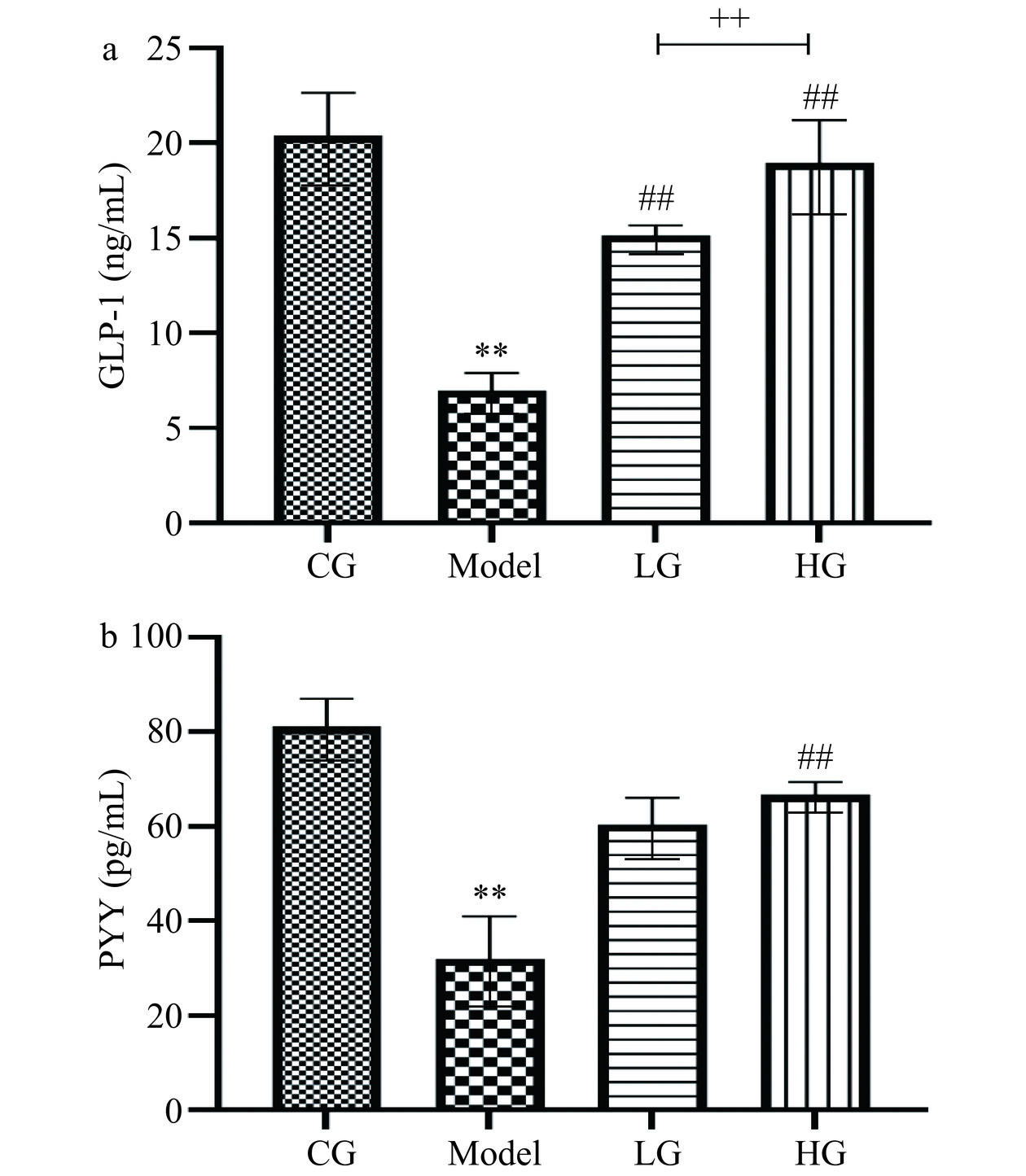 P<0.01). Conclusion: Jujube has the potential to elevate intestinal anorexigenic hormones GLP-1 and PYY, thereby reducing food intake in T2DM rats. This effect may be mediated through jujube's ability to alleviate intestinal inflammation, repair intestinal damage, and restore intestinal hormone secretion in T2DM rats.