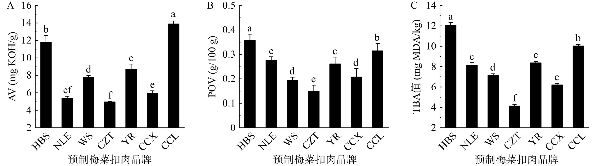 In order to study the key flavor characteristics and the influence of oxidation degree of oil on warmed-over flavor of pre-prepared steamed pork with preserved vegetable. The volatile flavor compounds and taste indexes of different brands of pre-prepared steamed pork with preserved vegetable were quantitatively detected by headspace-solid phase microextraction-gas chromatography-mass spectrometry and electronic tongue. The key flavor factors of pre-prepared steamed pork with preserved vegetable were screened and analyzed by odor activity value (OAV) and principal component analysis. Acid value, peroxide value and TBA value were used to analyze the oxidation degree of oil and warmed-over flavor of different brands of pre-prepared steamed pork with preserved vegetable. Results showed that a total of 85 volatile compounds were identified from 7 kinds of pre-prepared steamed pork with preserved vegetable, including 16 alkanes, 19 terpenes, 7 alcohols, 22 aldehydes, 3 ketones, 13 esters, 3 phenols and 2 others. A total of 23 key volatile compounds were screened by OAV, and the substances with OAV>10 were 1-octene-3-ol, hexanal, heptanal, octanal, nonanal, (E,E)-2,4-nonadienal, capric aldehyde, (E)-2-decenal, (E,E)-2,4-decenal and 1-octene-3-ketone, which were the key flavor substances for pre-prepared steamed pork with preserved vegetable. The results of electronic tongue and overripe taste evaluation showed that the taste of 7 kinds of pre-prepared steamed pork with preserved vegetable were mainly salty, umami and aftertaste. Its overripe taste mainly presented linseed oil taste and rancidity taste. The oil oxidation indexes of 7 kinds of pre-prepared steamed pork with preserved vegetable were higher and the differences were significant (