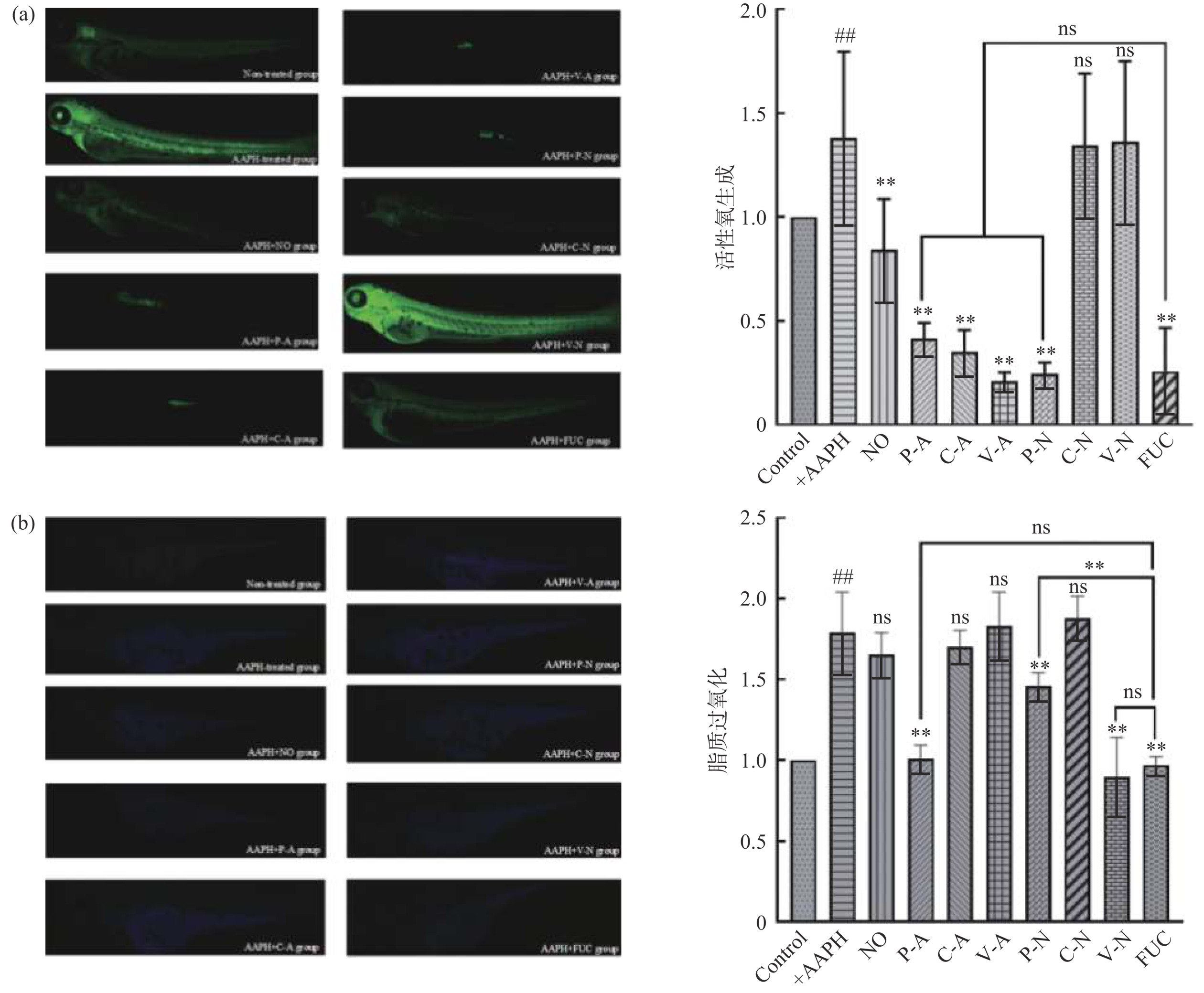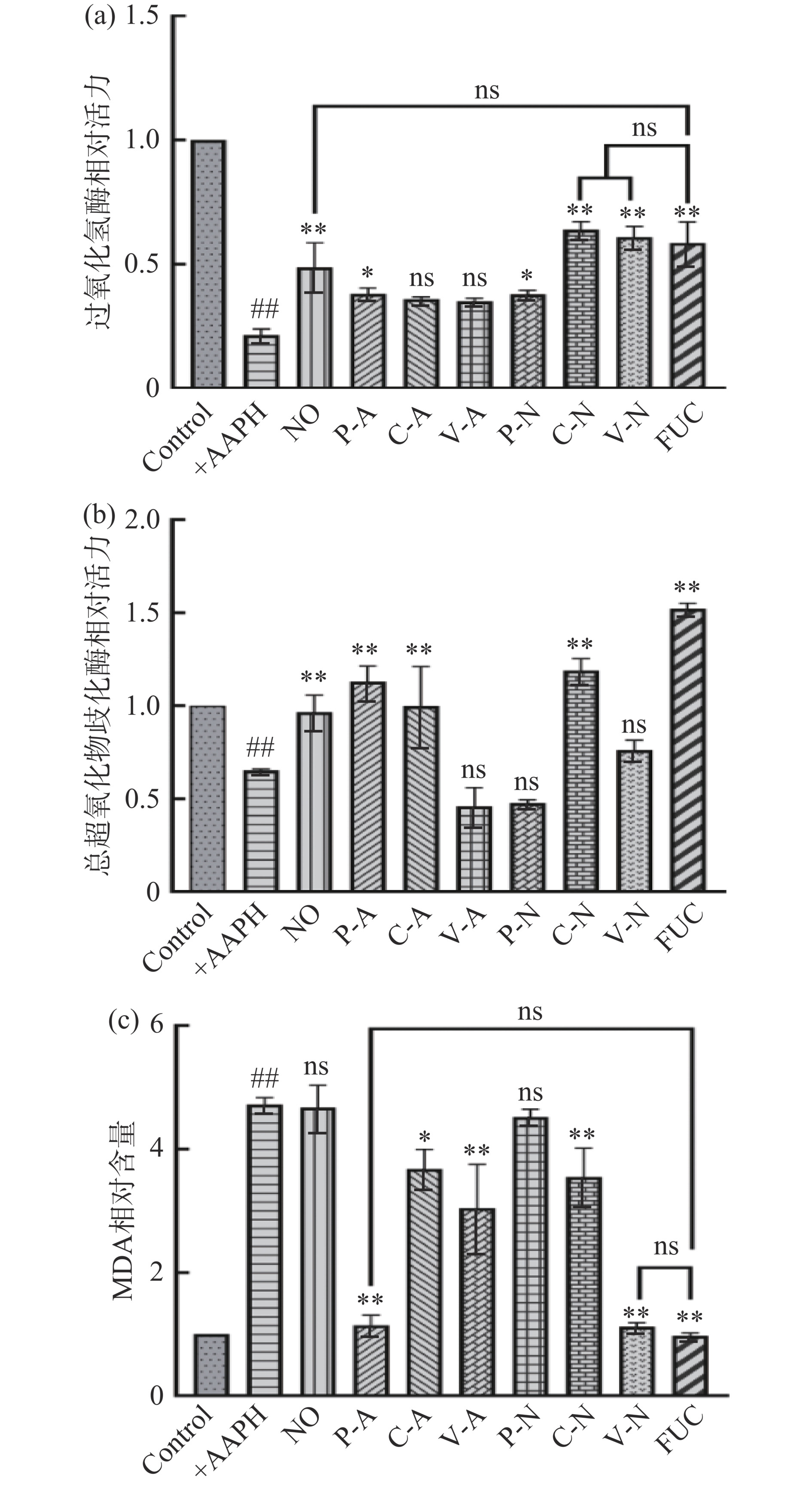 50). The polysaccharides prepared by different combined enzymes had different protective effects on AAPH-induced oxidative stress. Among them, compared with the NO group, the polysaccharides in the P-A, C-A, V-A and P-N groups had a stronger ability to reduce reactive oxygen species. The polysaccharides in the P-A, P-N and V-N groups had significant lipid peroxidation inhibition. Compared with the induction group, the polysaccharides in the C-N and V-N groups significantly increased CAT enzyme activity (