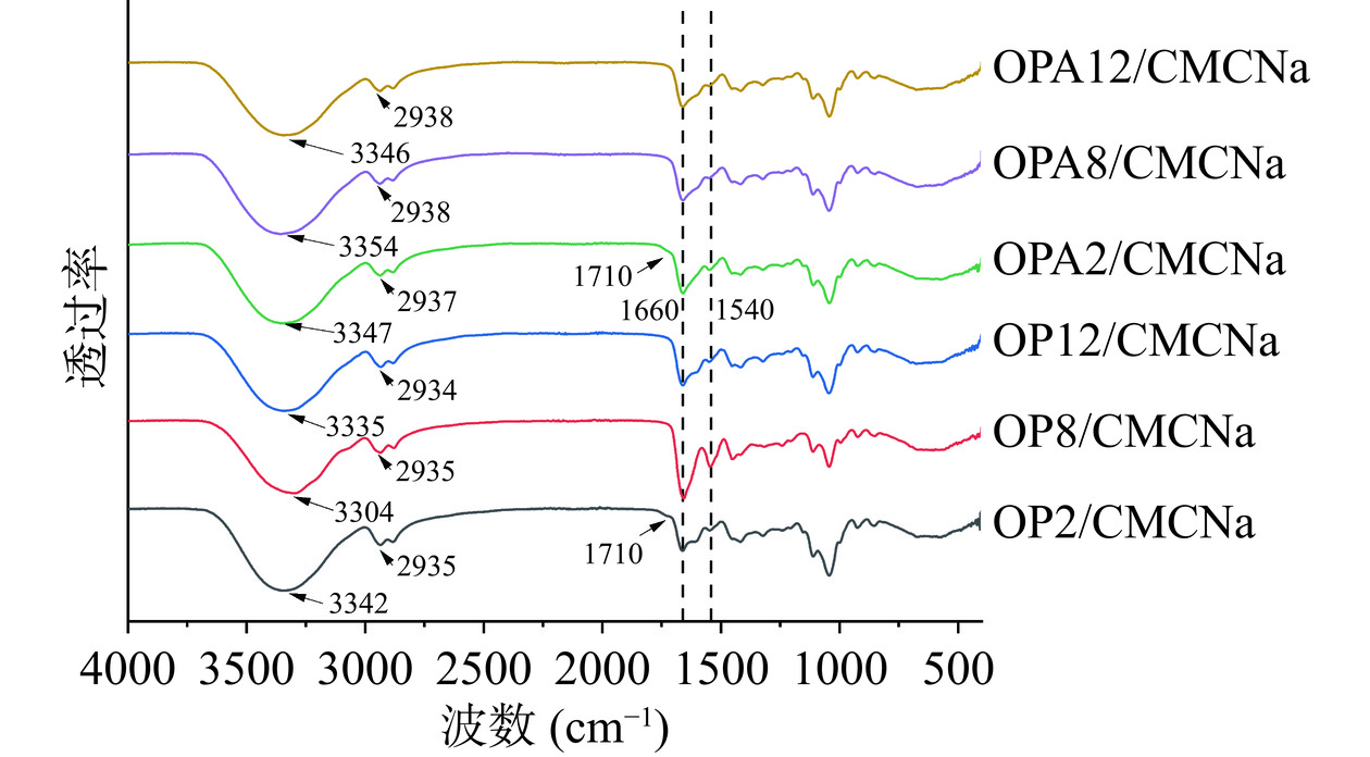 In order to improve the physicochemical properties of oat protein-based composite film, the natural oat protein (OP) was modified to prepare oat protein amyloid aggregates (OPA), and then the composite film was prepared with sodium carboxymethyl cellulose (CMCNa). The microstructure and properties of the composite films were studied by Fourier infrared spectroscopy (FTIR), differential scanning calorimetry (DSC) and scanning electron microscopy (SEM). The mechanical properties, optical properties, moisture content, water solubility and water vapor permeability of the composite films were also determined. The results showed that the structure of the modified oat protein changed significantly. Compared with the OP/CMCNa composite film, the surface of the OPA/CMCNa composite film was smoother and the structure was more compact. Compared with OP/CMCNa composite film, the water solubility of OPA/CMCNa composite film was reduced by 7.02% to 15.84%, and the water resistance of OPA/CMCNa composite film was significantly improved. Among them, the puncture distance of the composite film prepared by OPA8 was increased to 6.513 mm, the force was increased to 701.2 g, and the mechanical properties were significantly improved. In conclusion, oat protein amyloid aggregates can effectively improve the transparency, water resistance and mechanical properties of natural oat protein-based composite films. The results can provide reference for the preparation and properties of modified oat protein composite film.