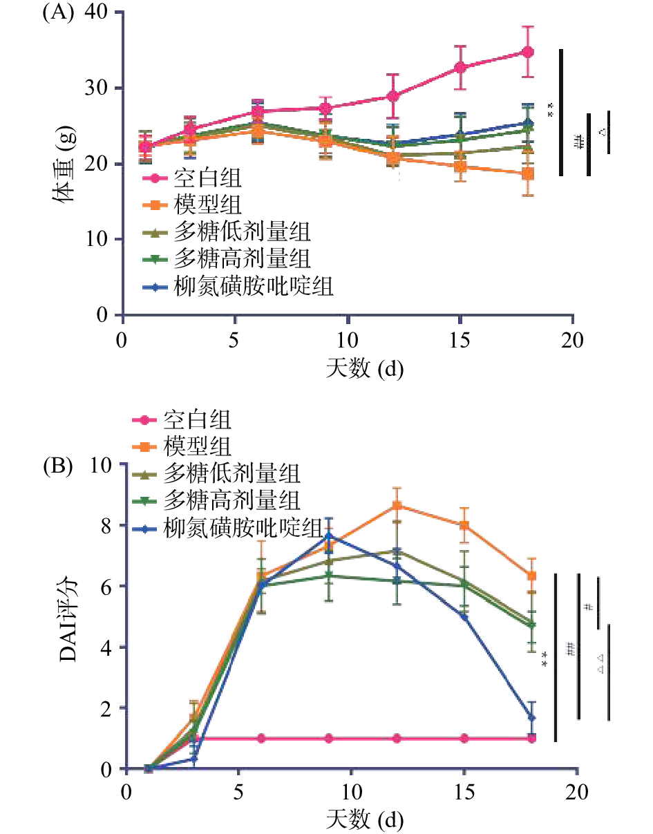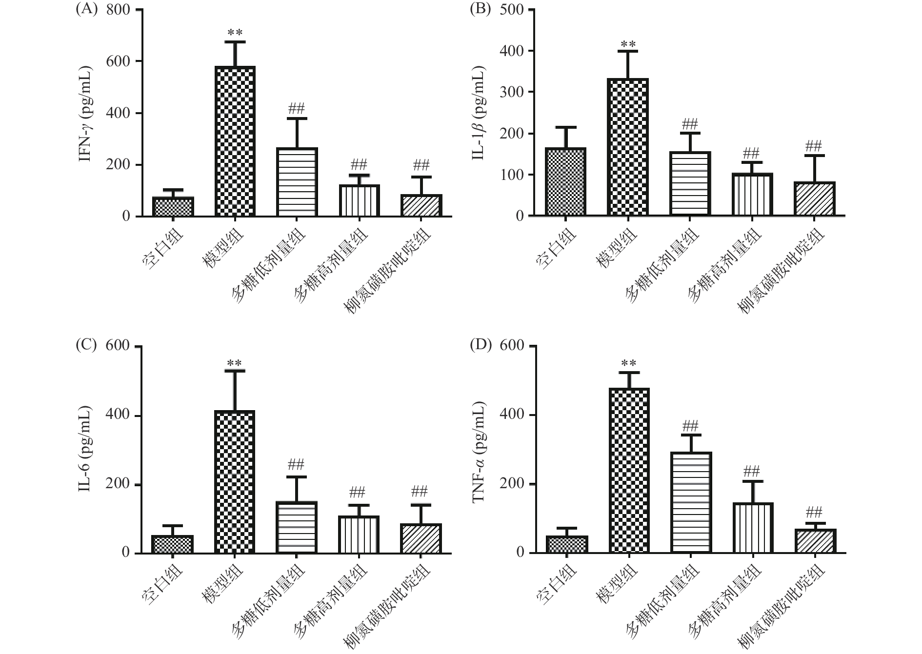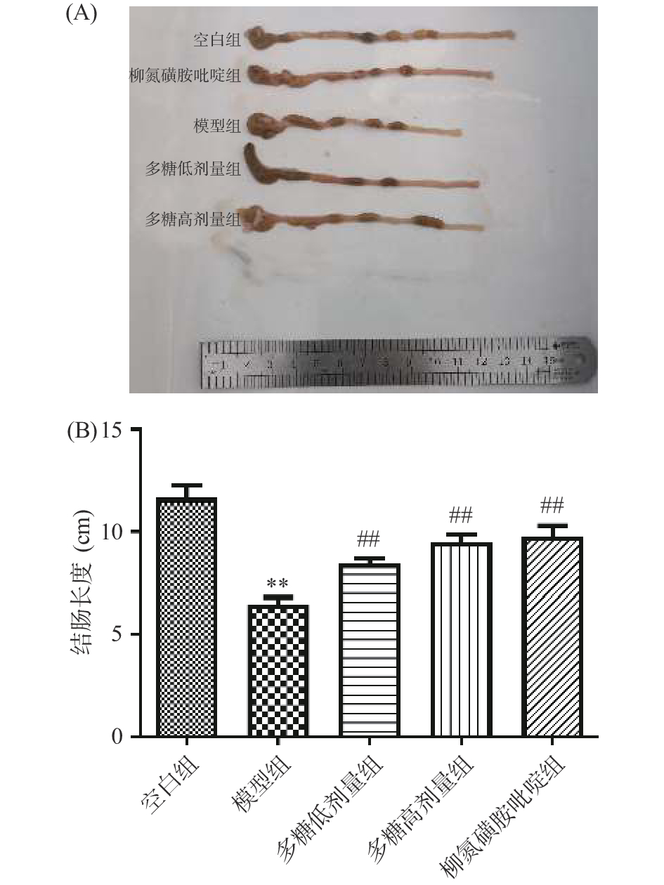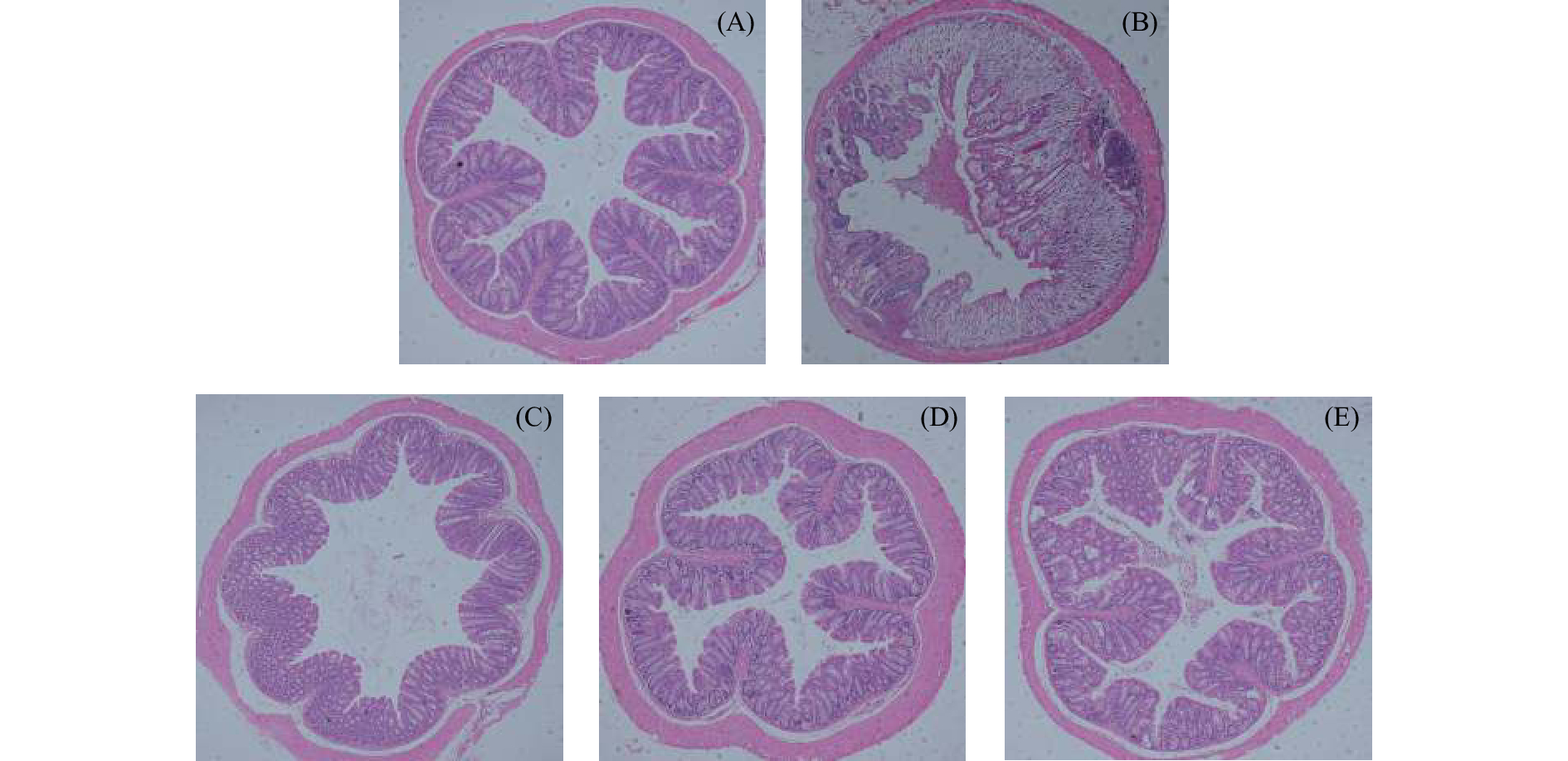 Methods : Fifty KM male mice were randomly divided into 5 groups (n=10): normal control group, model group, HCP low dose group (1 g/kg/day), HCP high dose group (2 g/kg/day), and Sulfasalazine positive group (SASP, 9 mg/kg/d). The UC model was induced with 2.5% DSS by water drinking for 9 days in mice. After successfully established the model in mice, the normal control group and the model group were free drinking distilled water, HCP in doses of 1 g/kg/day and 2 g/kg/day groups were given by filling to the stomach after DSS administration, and the positive group was treated with 9 mg/kg/d Sulfasalazine aqueous solution for 6 days. Assessing disease activity index (DAI) of mice in each group, observing colonic tissue structure by HE, detecting pro-inflammatory cytokines tumor necrosis factor-