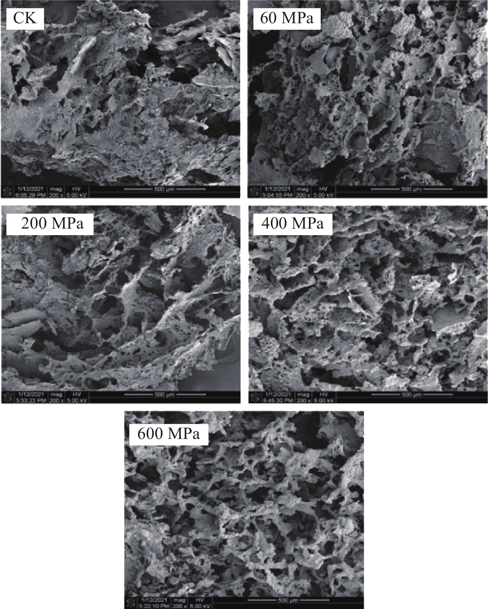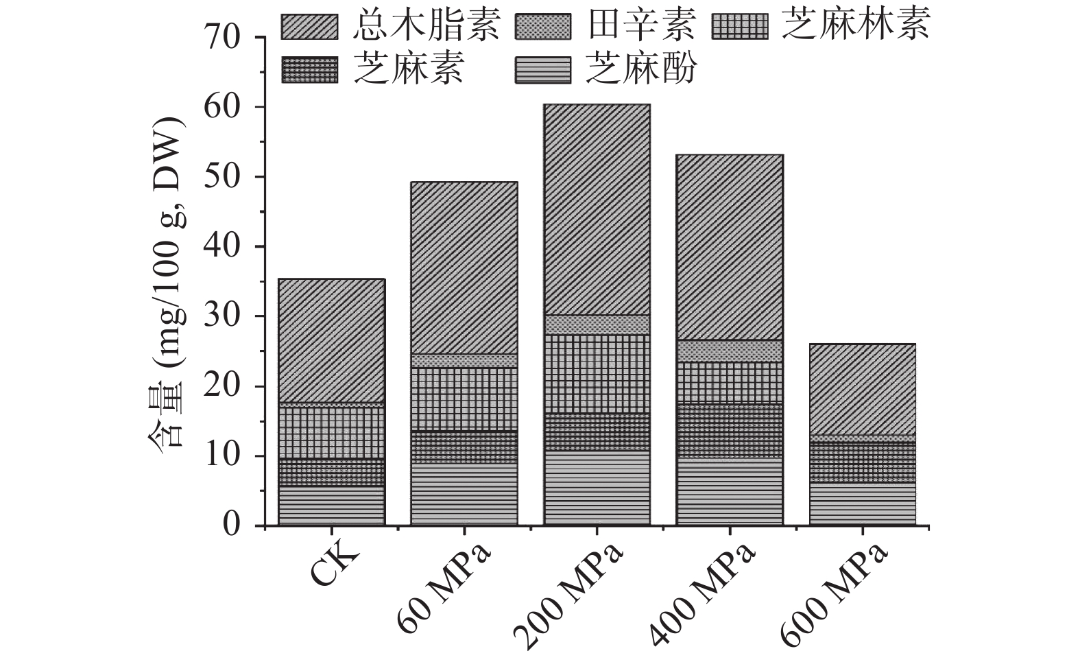 in vitro digestion of sesame treated with ultra-high static pressure and different pressures, and observe the microstructure changes of sesame with rheometer and scanning electron microscope. The results showed that the contents of sesame lignans, total phenols and total flavonoids after different pressure treatments were significantly higher than those of untreated ones. The total lignans, total phenols and antioxidant activity composite index (ACI) of 200 MPa treated sesame samples were (30.20±1.20) mg/100 g, (473.04±13.73) µmol Rutin/100 g and (88.02±3.80) µmol Rutin/100 g, which were significantly higher than the untreated value. Regardless of the content of phenolic substances and the strength of antioxidant capacity, 200 MPa was an ideal treatment condition. The rheological characteristic curve showed that the viscosity was maximum when the pressure was 600 MPa, and the sesame structure became more stable. It was observed by scanning electron microscope that with the pressure change, the surface of the sample became loose and porous, and at the same time, it promoted the action of digestive enzymes, which was beneficial to improve the digestibility.