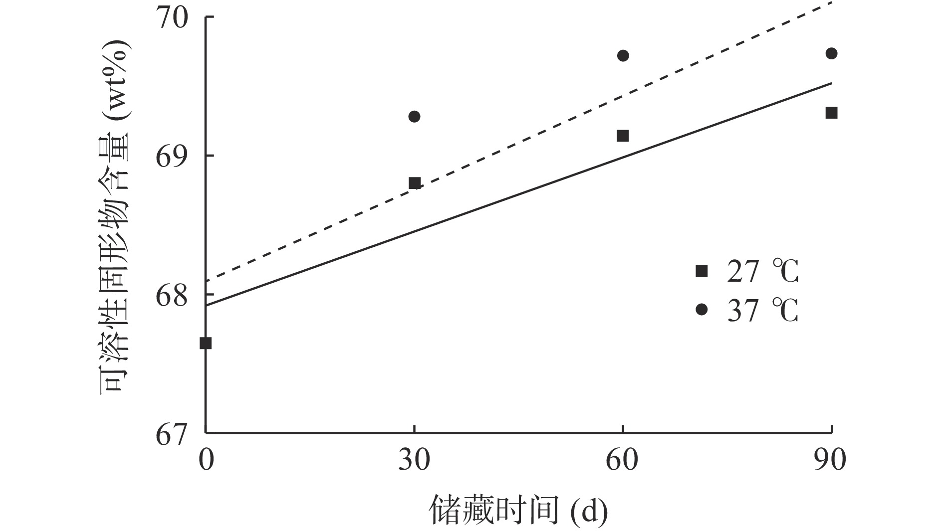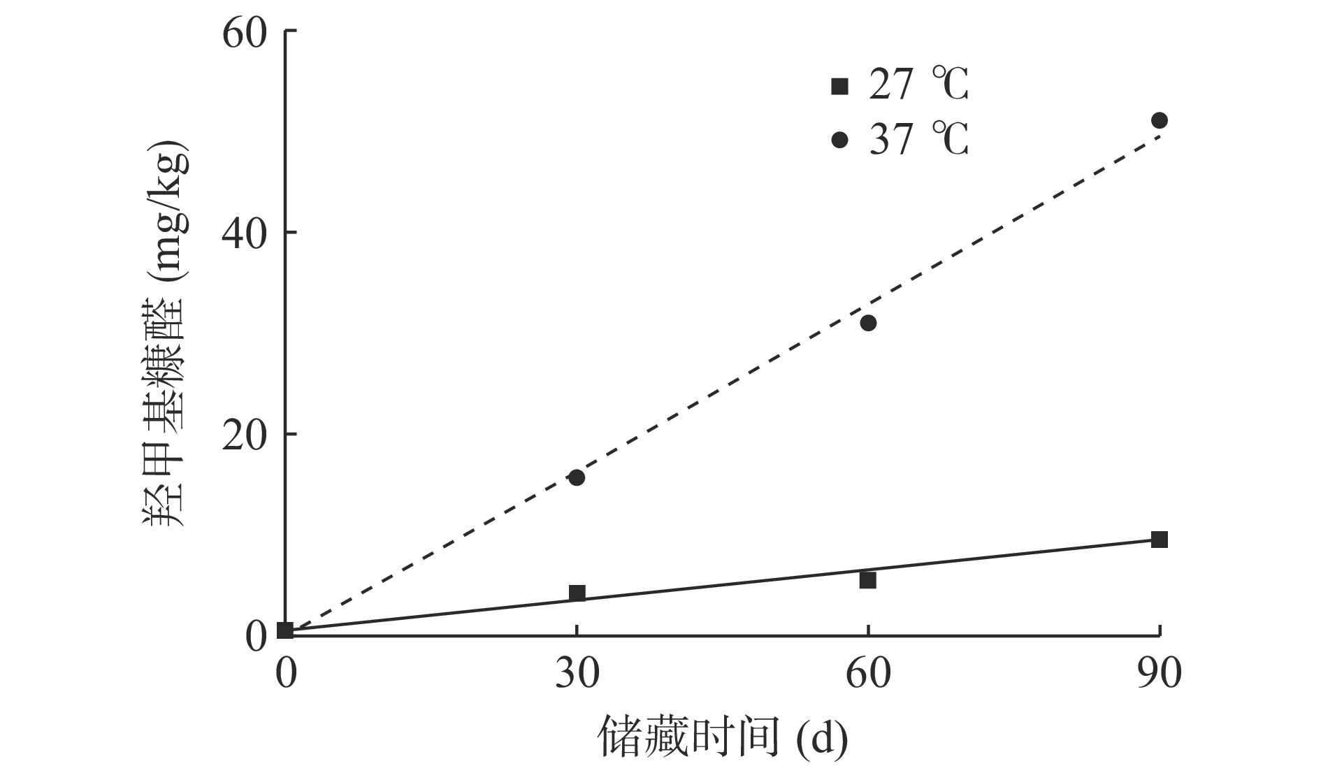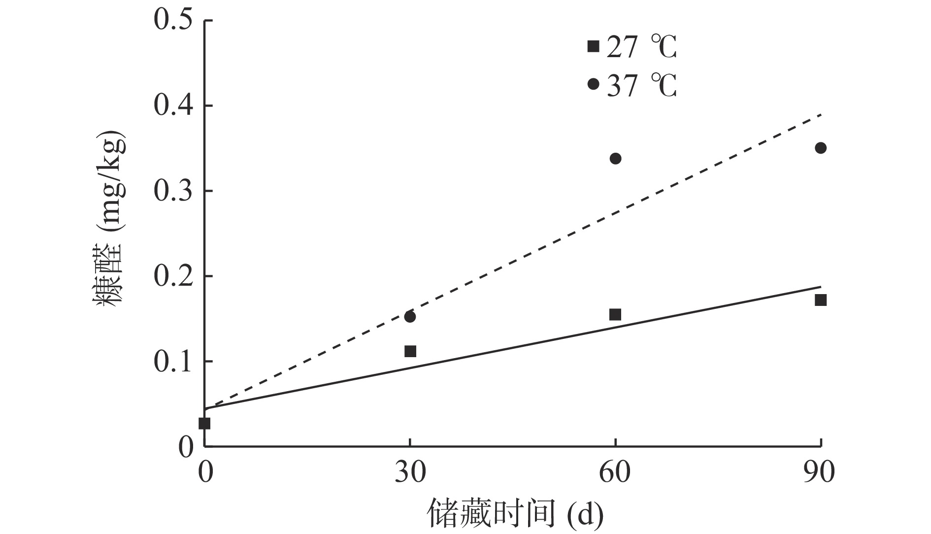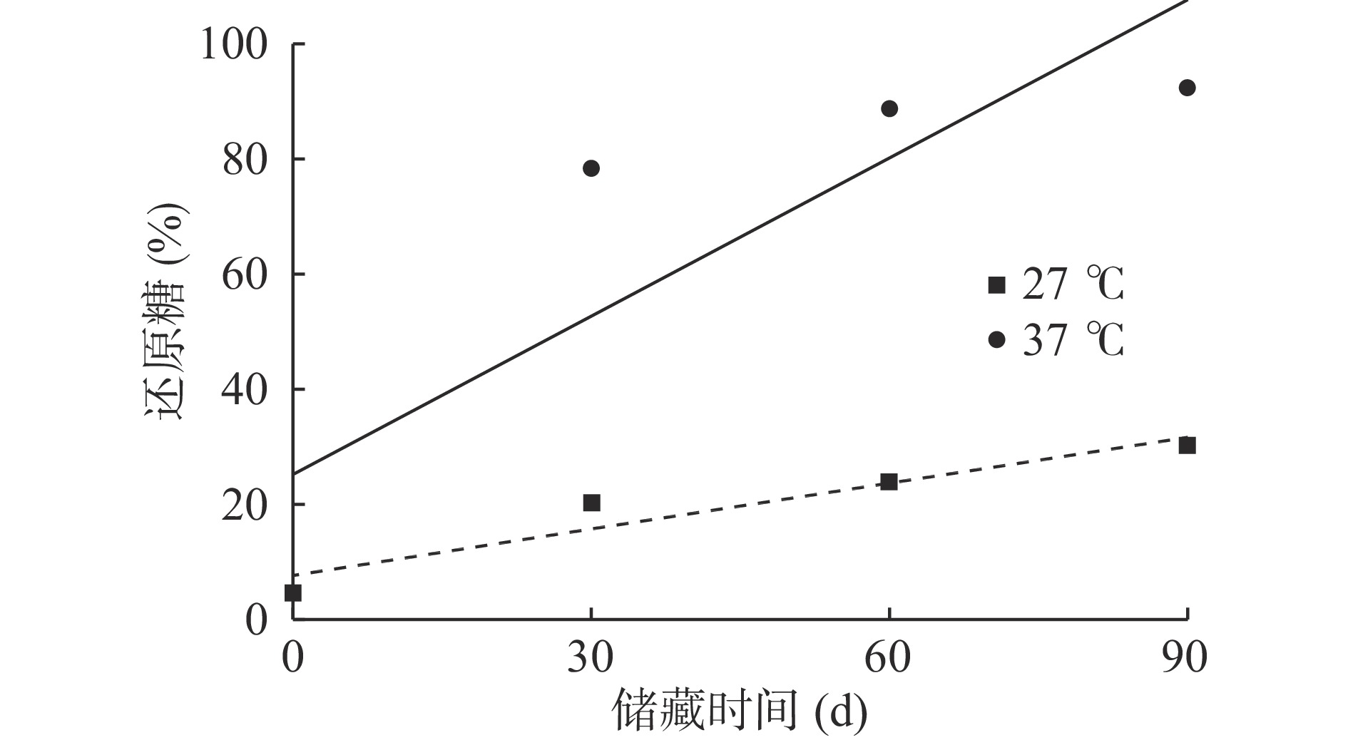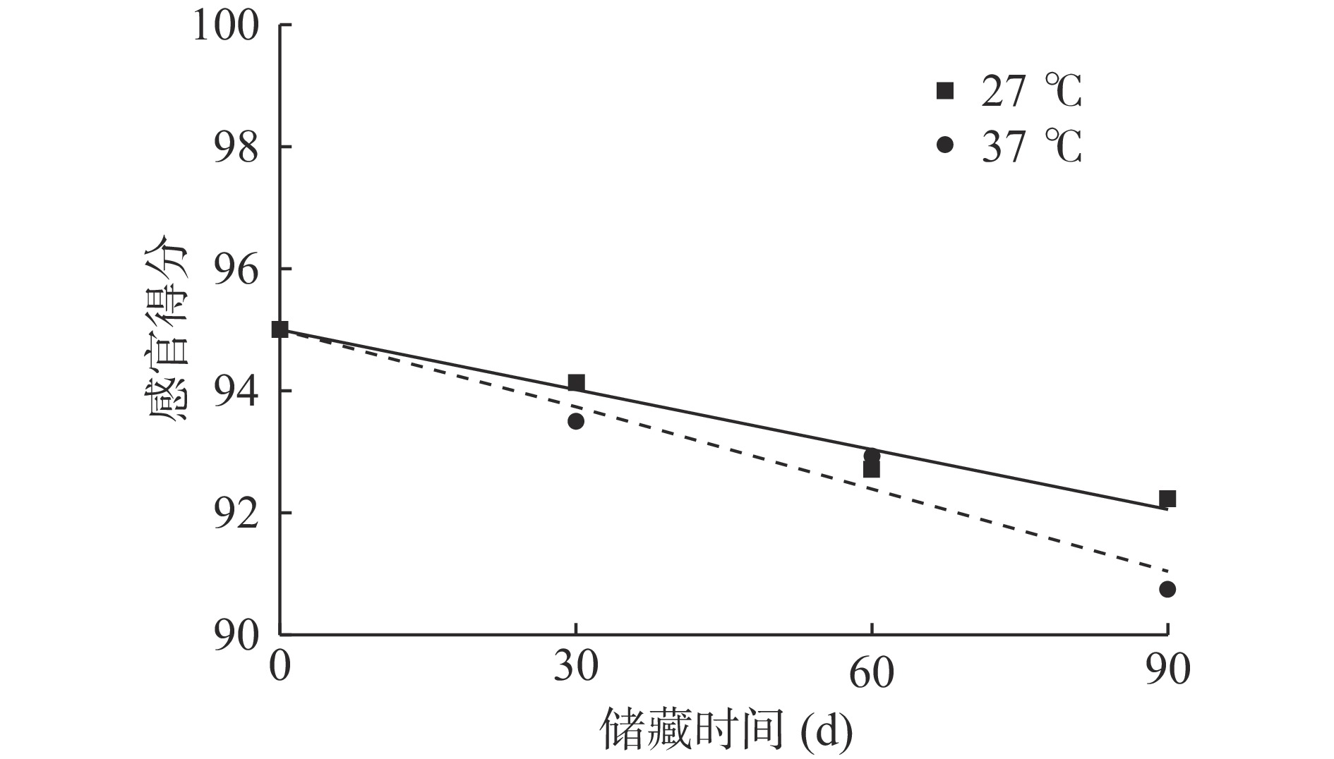 • 摘要: 本文主要阐述了蓝柑风味糖浆货架期预测模型的研究过程及方法,对蓝柑风味糖浆储存过程中多维度品质变化、保藏期限等进行评估预测。在4、27、37 ℃的贮藏条件下,通过对感官指标、可溶性固形物含量、pH、还原糖含量、羟甲基糠醛(5-hydroxymethyl-furfural,HMF)等多项指标变化的逐一分析,结合动力学模型和Arrhenius方程,完成了货架期预测模型的构建。结果表明,以感官得分为80分、可溶性固形物含量为85%、pH为2、还原糖含量为100%、羟甲基糠醛含量为35 mg/kg作为蓝柑风味糖浆货架期的终点,在4 ℃冷藏条件下,蓝柑风味糖浆的理论货架期约为48个月;20 ℃室温条件下,蓝柑风味糖浆的理论货架期约为24个月,货架期终点蓝柑风味糖浆的品质出现不可接受的损失。蓝柑风味糖浆货架期预测模型的建立,为糖浆类产品货架期预测建模提供了新思路。