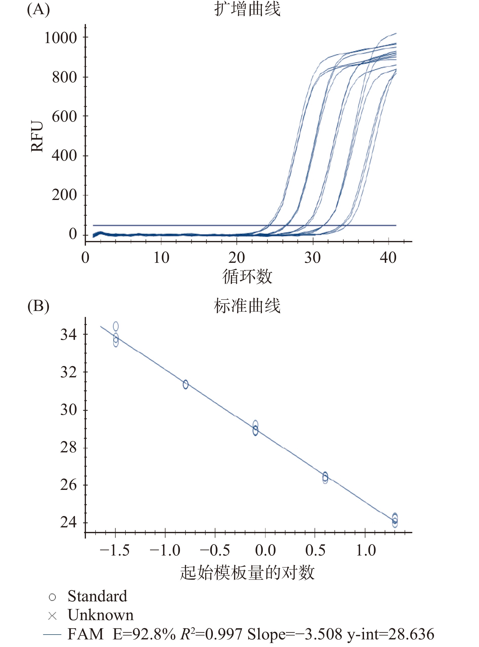 CACA gene as the amplification target, specific primers and TaqMan probes were designed, and a TaqMan real-time quantitative PCR method for detecting pork ingredients was established. The experimental results showed that the method had good extraspecies specificity and intraspecies stability. There was a good linear relationship between the template DNA and the amplified Ct value within the DNA concentration range from 20 to 0.032 ng/µL. The standard curve was y=−3.508x+28.636, the coefficient of determination (