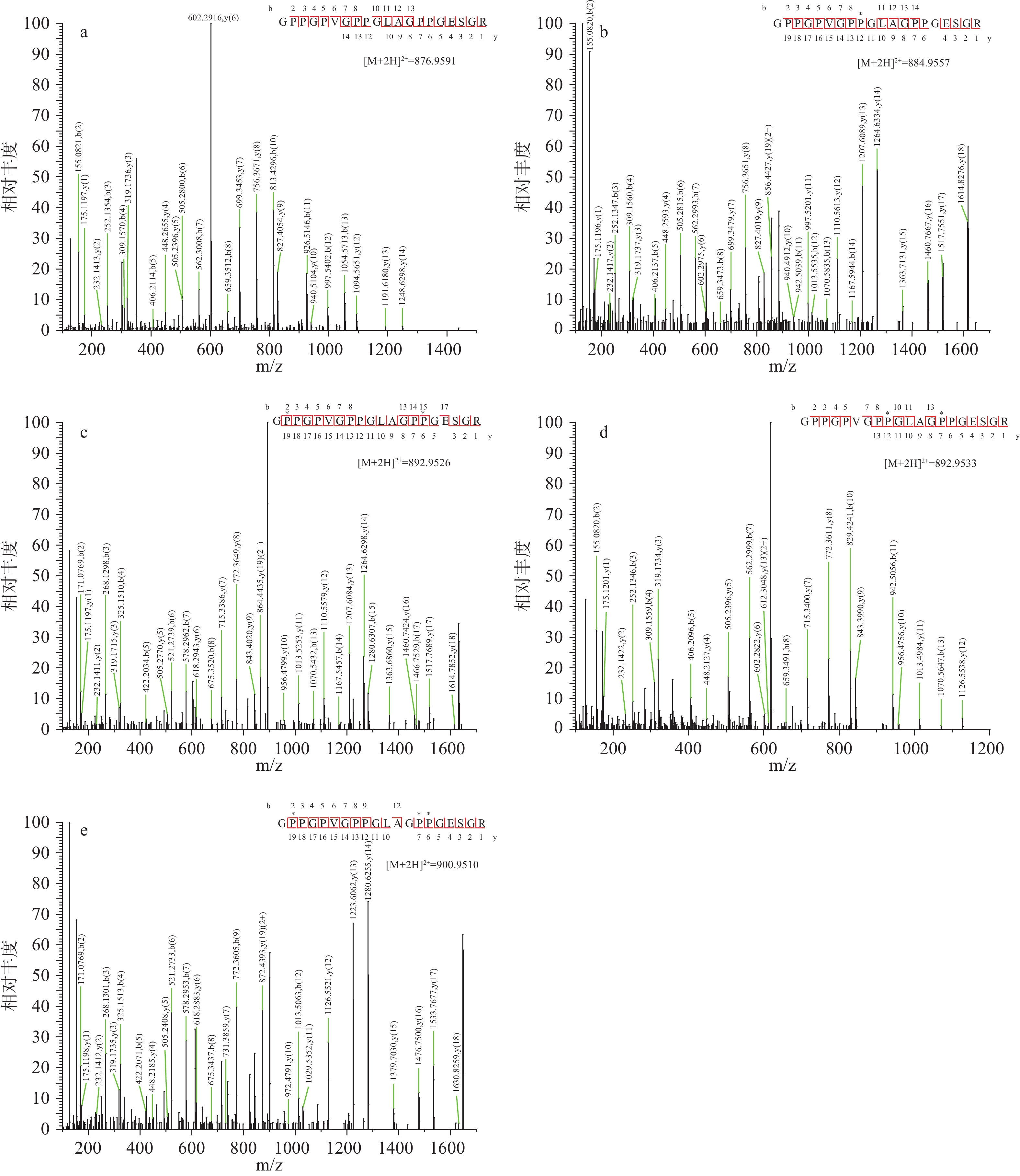 α2 chain. Meanwhile, the number of common characteristic peptides with hydroxylated modifications was 15, 2 and 4 respectively, while those without any modification groups were 3, 1 and 1. These common characteristic peptides would provide a basis for the HPLC-MS/MS traceable identification of the gelatin source in donkey-hide gelatin lump, which is of reference significance for the quality assurance of donkey-hide gelatin lump products.
