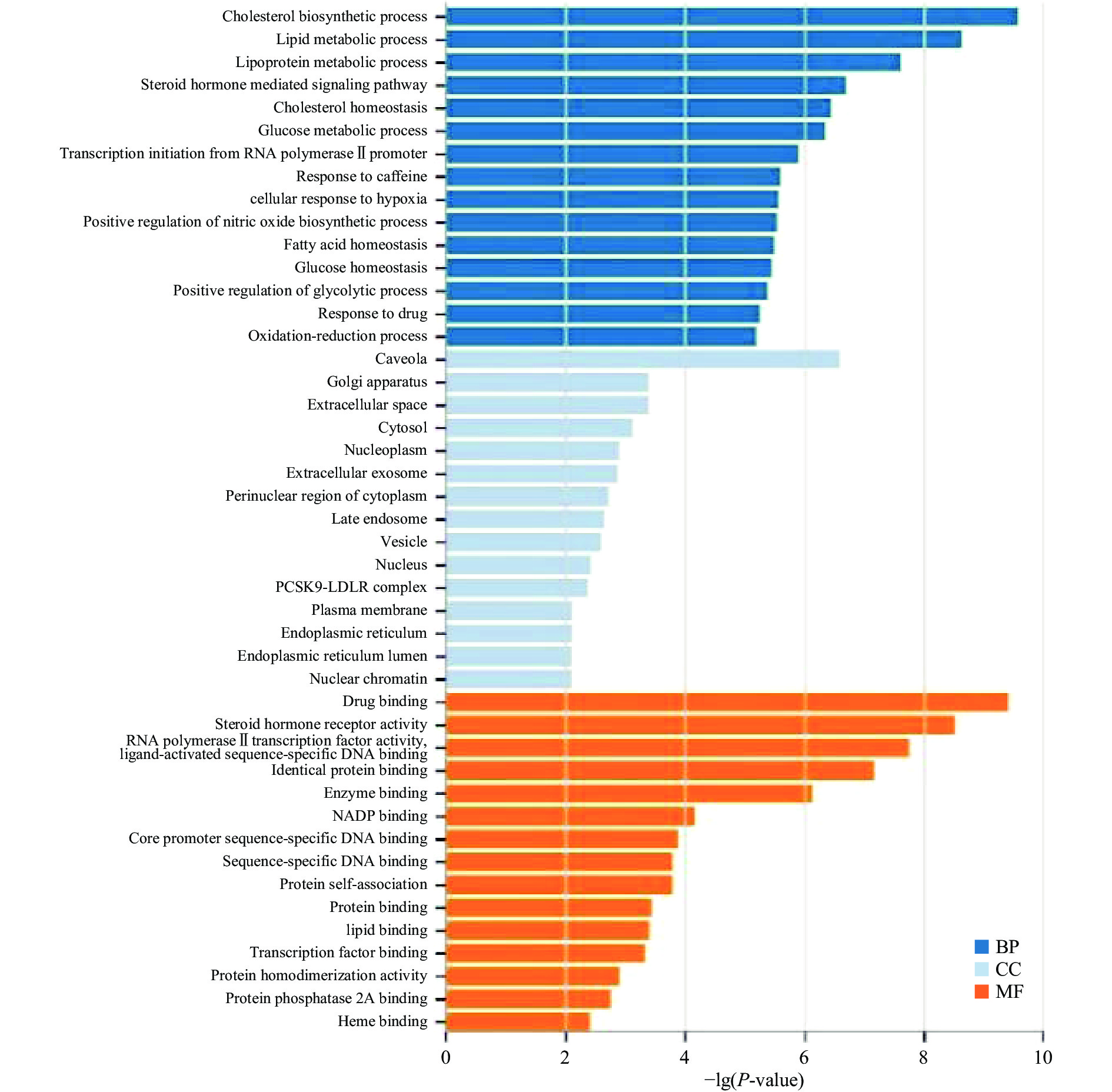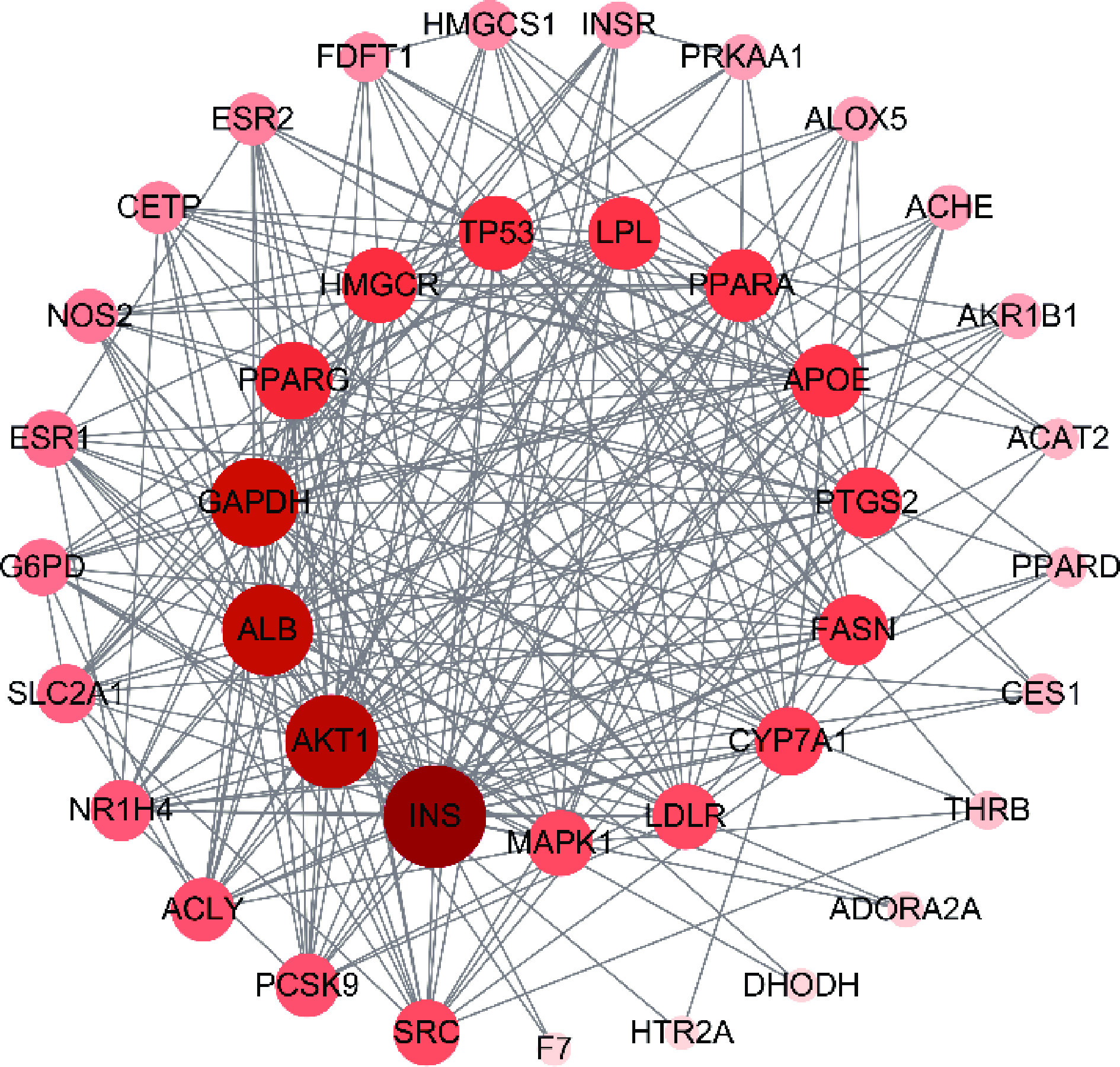 Objective: Network pharmacology was used to predict potential compounds, targets and pathways of action in hawthorn leaves for the treatment of hyperlipidaemia, and the network pharmacology predictions were validated in conjunction with target enzyme and cellular assays. The material basis and mechanism of action of hawthorn leaves against hyperlipidemia. Methods: The chemical components of hawthorn leaves were obtained through the traditional Chinese Medicine System Pharmacology database analysis platform and literature mining, and the potential targets were obtained by using the relevant databases. GO and KEGG analysis were carried out to construct the “component-target-pathway” network. The effective components and potential targets predicted by network pharmacology were verified by ERK2 kinase, oil red O staining and triglyceride experiment. Results: After the network pharmacology screening, 96 active ingredients and 40 interacting target proteins were obtained from hawthorn leaves. The results of KEGG analysis indicated that the therapeutic effects of the active ingredient on hyperlipidaemia were mainly through the following signalling pathways: Metabolic pathway, AMPK signaling pathway, HIF-1 signaling pathway, insulin resistance, thyroid hormone signaling pathway. According to the prediction results of network pharmacology, combined with the representative compounds of hawthorn leaves isolated by the research group, the ERK2 kinase activity of six compounds such as vitexin was tested. The results showed that the inhibition rate of vitexin on ERK2 kinase was the highest, reaching 84%. By constructing high-fat HepG2 cell model, oil red O staining and quantitative experiment were carried out, and TG content was measured. It was found that after vitexin intervention, the number of lipid droplets in cells gradually decreased with the increasing of vitexin concentration, and TG content decreased, indicating that vitexin could reduce lipid accumulation and TG content in cells. Further, the results of network pharmacology predicted the anti hyperlipidemia effect of vitexin in hawthorn leaves were verified. Conclusion: In this paper, network pharmacology was used to predict the material basis and mechanism of action of compounds in hawthorn leaves against hyperlipidemia. Target enzyme, oil red O staining and TG quantification experiments initially confirmed the network pharmacology predictions, while suggesting that vitexin would be promising as a potential therapeutic compound for reducing intracellular lipid content.