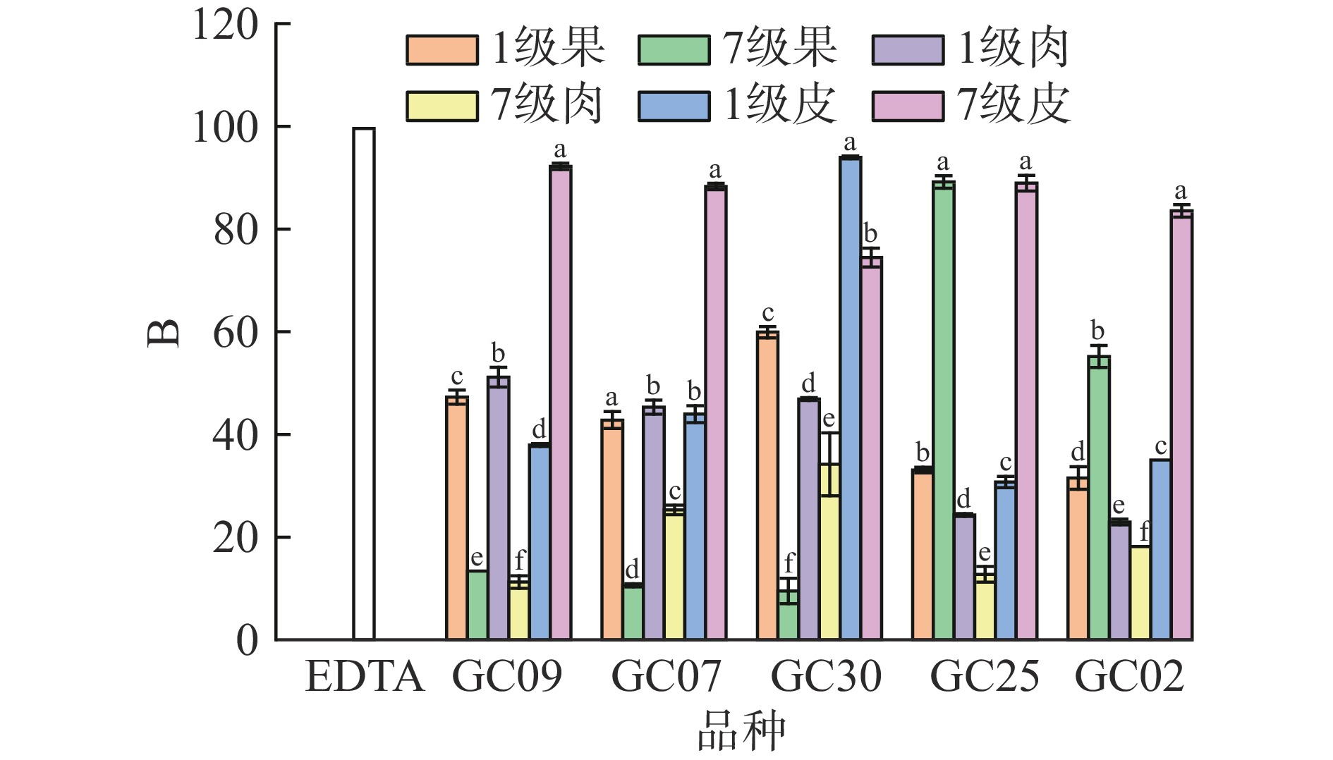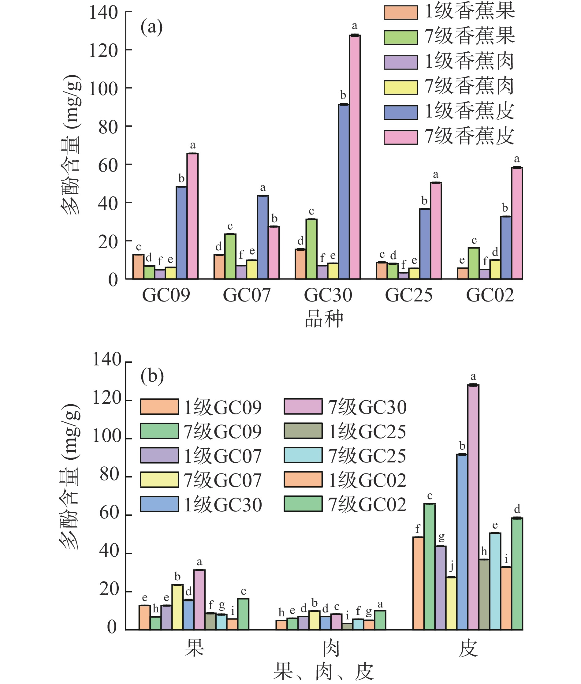 P<0.01), and the phenol content of banana peel, pulp and fruit at grade-7 maturity were not significantly different from that at grade-1 maturity. However, the phenol content in banana peel of different varieties was significantly different (