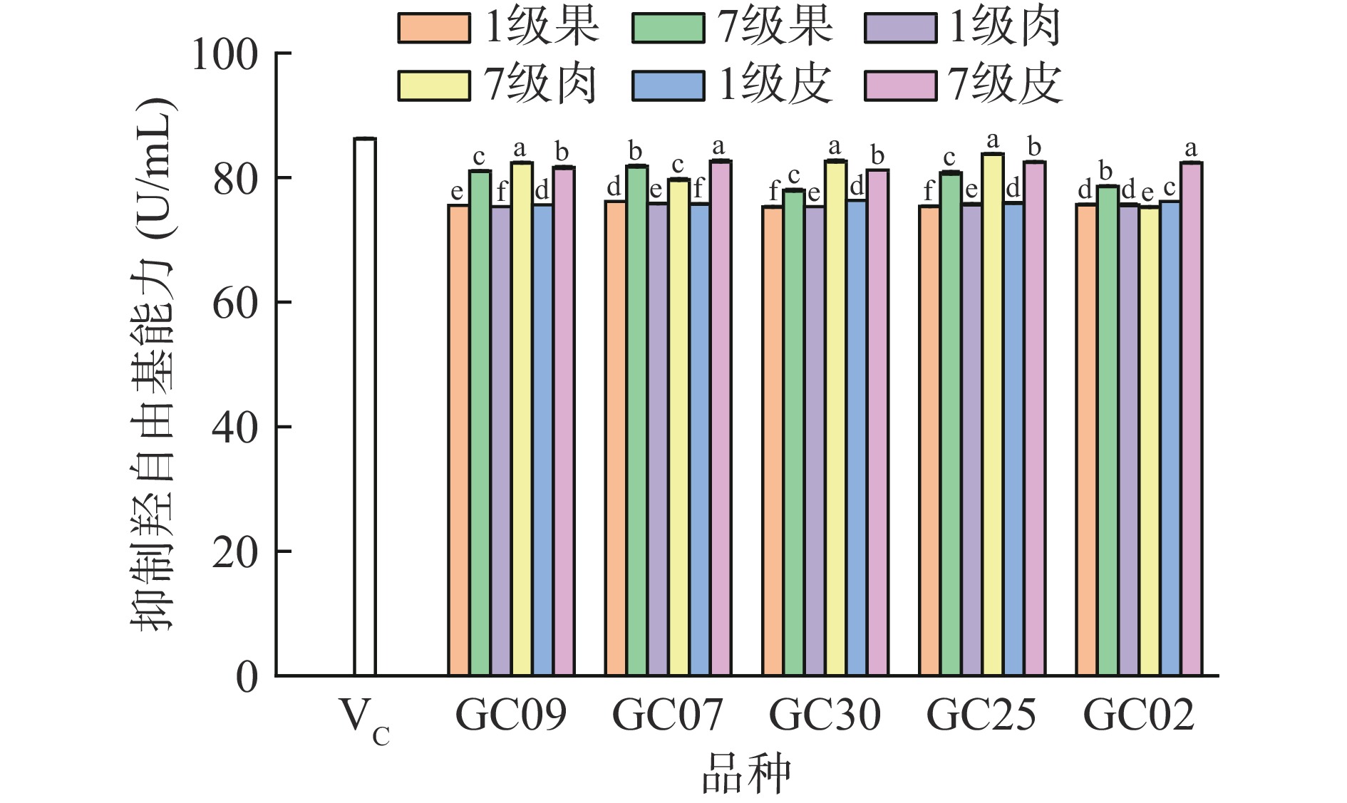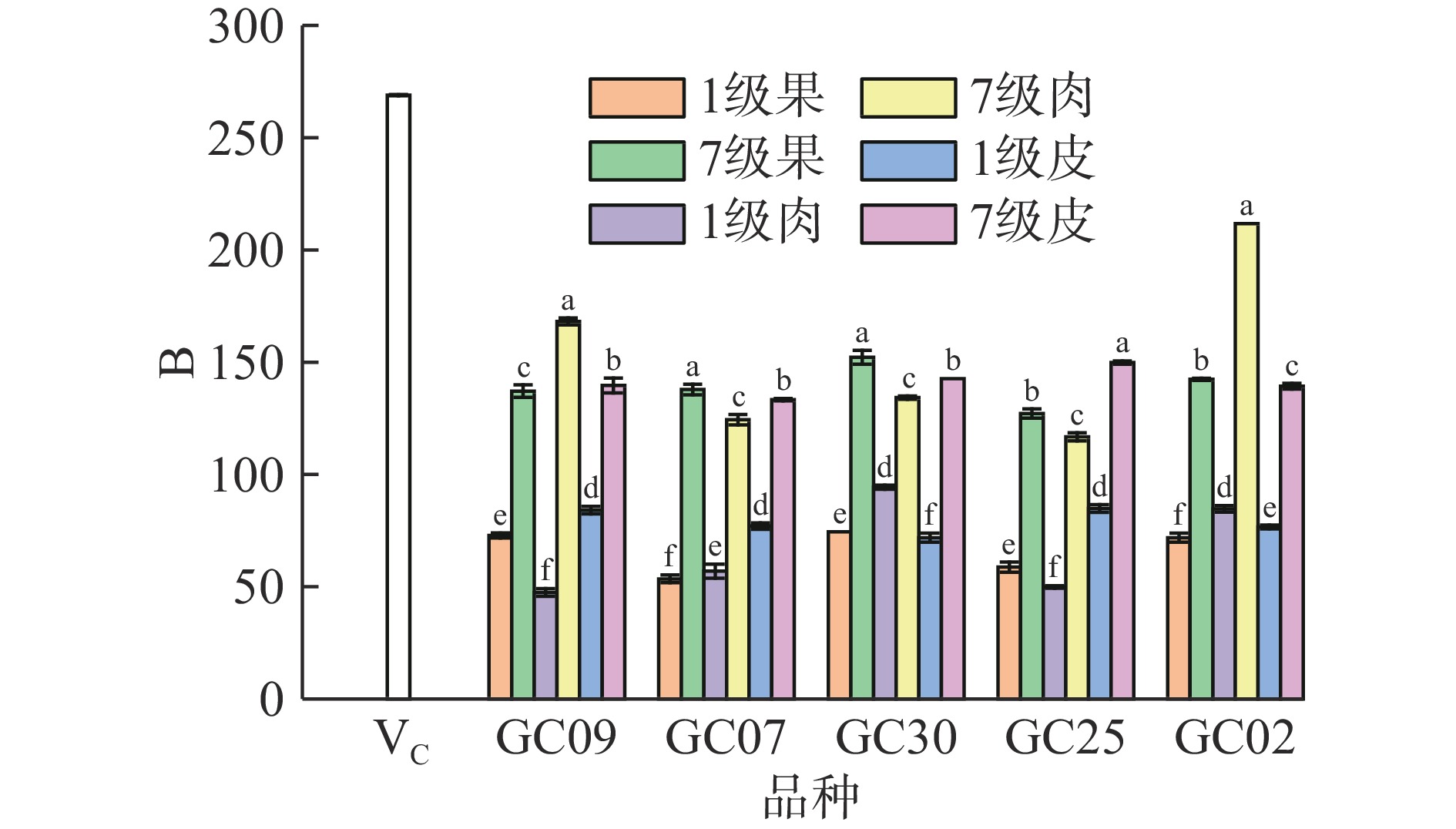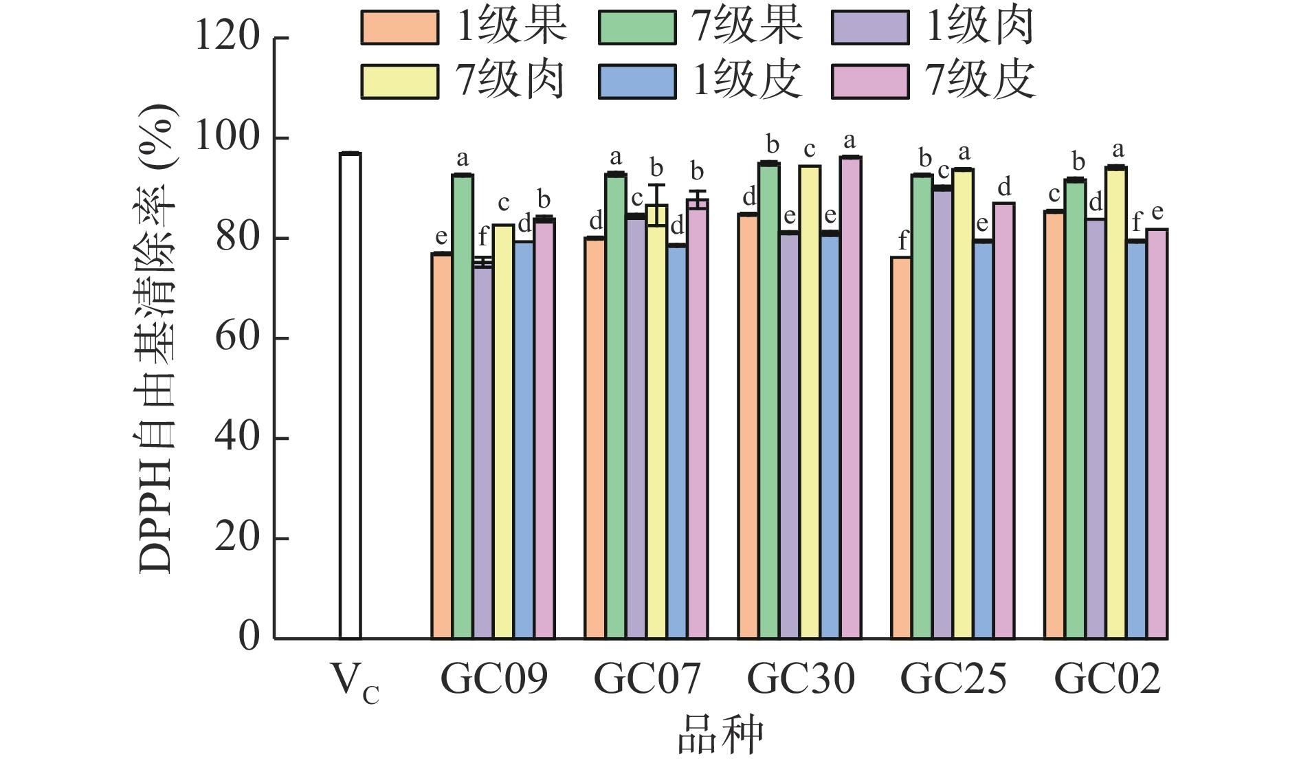 P>0.05). Moreover, the antioxidant activities of banana fruit, pulp and peel with different varieties at grade-7 maturity were better than those of fruit, pulp and peel at grade-1 maturity. The GC30 banana peel at grade-7 maturity had the strongest antioxidant properties in the comprehensive evaluation of antioxidants. The findings of this research could provide a theoretical basis for the breeding, processing and application of banana varieties, and promote the commercial value of banana.