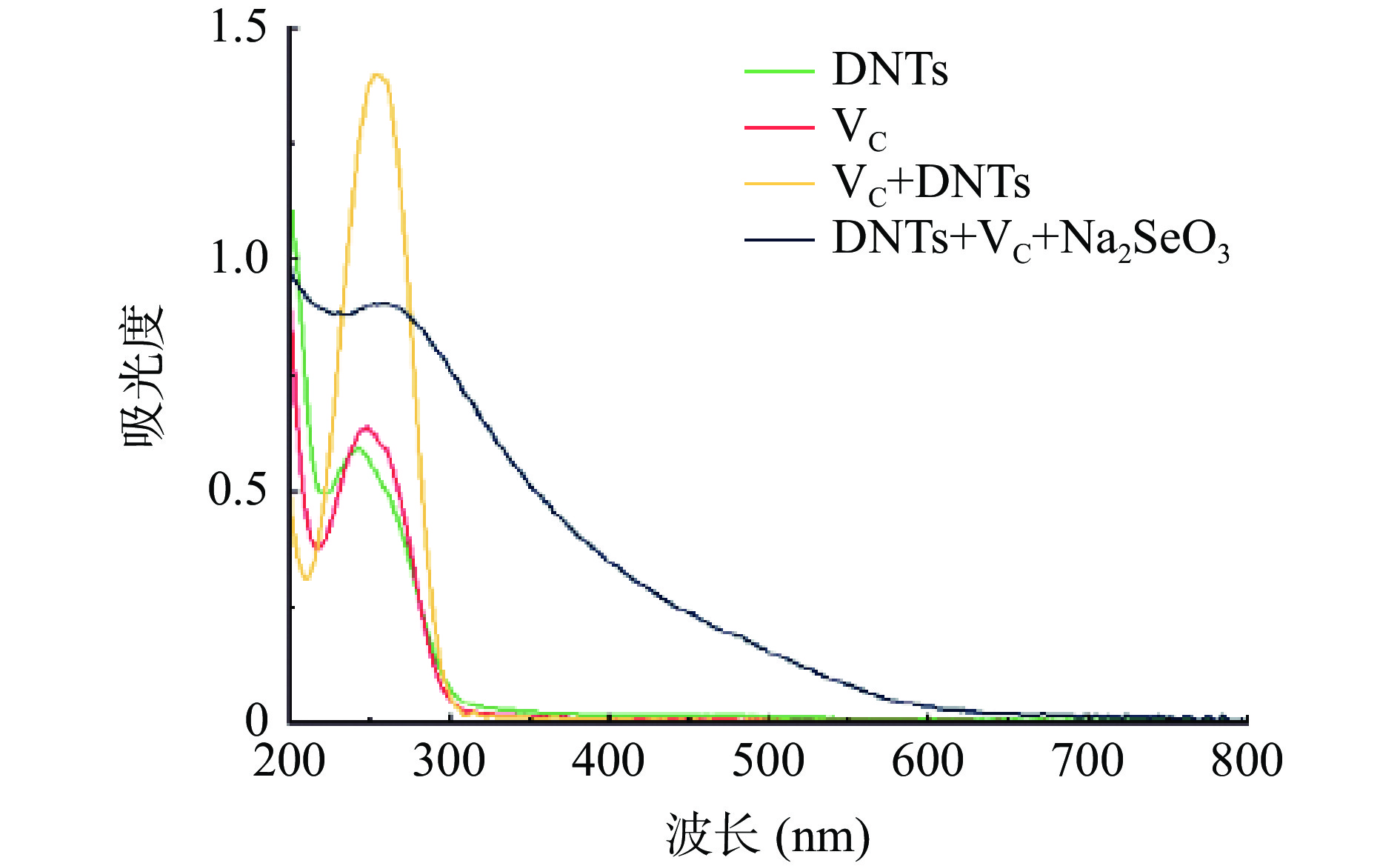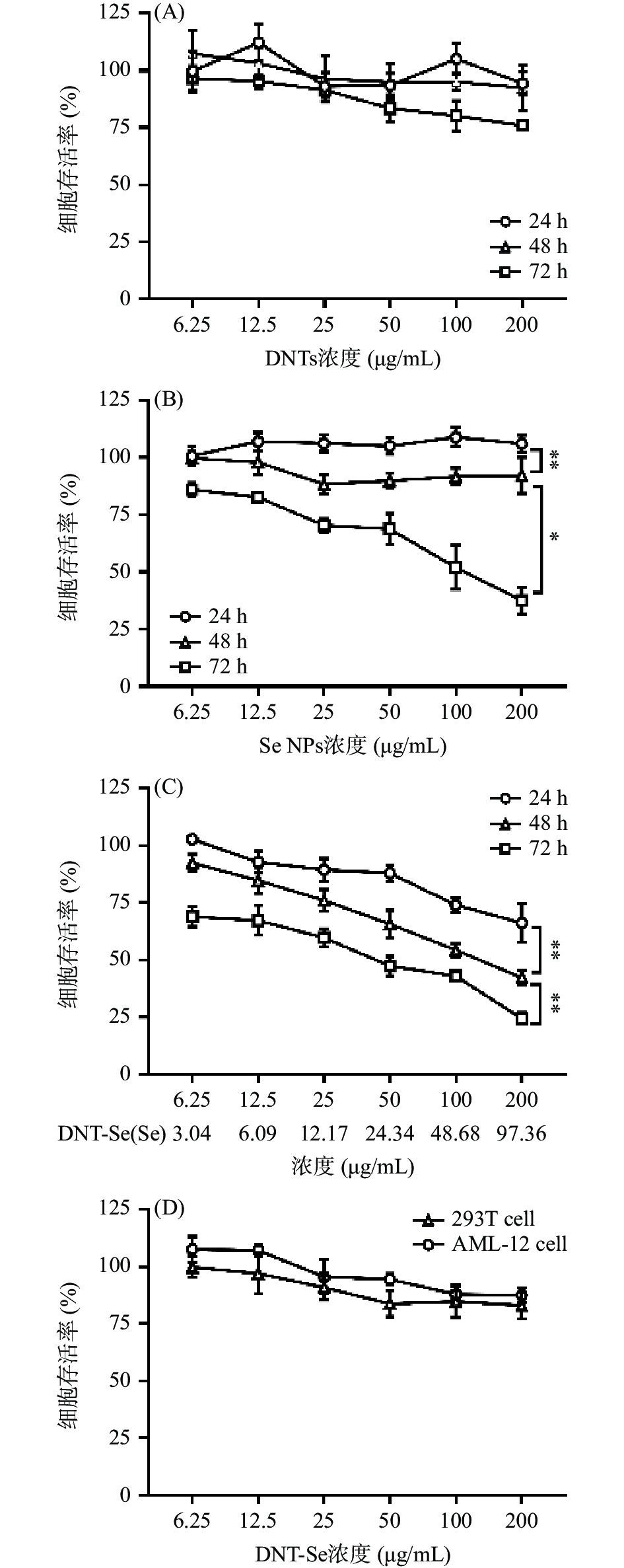 3, the reaction time, and the reaction temperature were used as experimental factors. The dual-wavelength colorimetric method and the Malvern particle-size assay method were used to characterize changes in the particle size of Se NPs in DNT-Se, and the single-factors and orthogonal experimental design were used to investigate the preparation process of DNT-Se, and the toxicity of DNT-Se to 293T human embryonic kidney cells and normal liver cells of AML-12 mice was evaluated by using CCK-8. The results showed that the optimal conditions for DNT-Se preparation were list as follows: 1.0 mg/mL of DNTs, and 1.0 mg/mL of Na