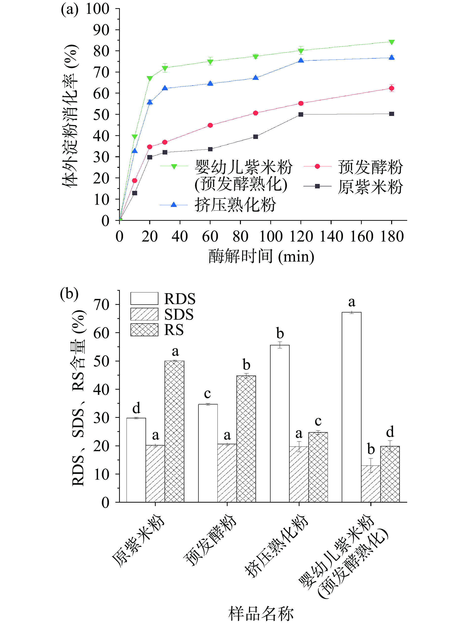 Lactobacillus plantarum), 0.8% inoculation dose, 1:0.8 g/mL solid-liquid ratio, 12 h fermentation time, and 31 ℃ fermentation temperature. Compared with the unfermented purple rice flour as a control, the starch digestibility