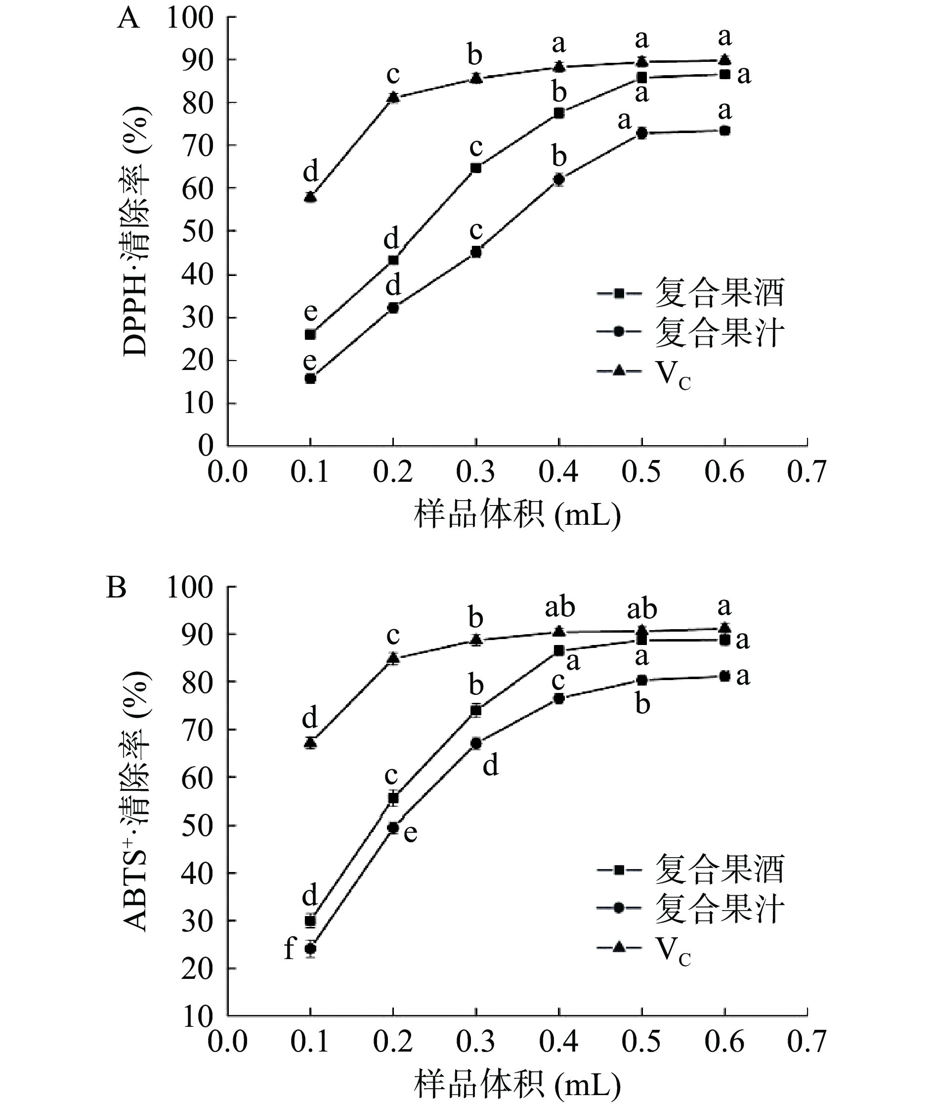 +· could reach 85.7% and 88.8%, respectively, and the antioxidant capacity was significantly higher than that of compound juice, but less than that of vitamin C. The compound fruit wine developed by this study has a unique flavor and a good specific antioxidant activity, which would provide a scientific basis for the development and application of