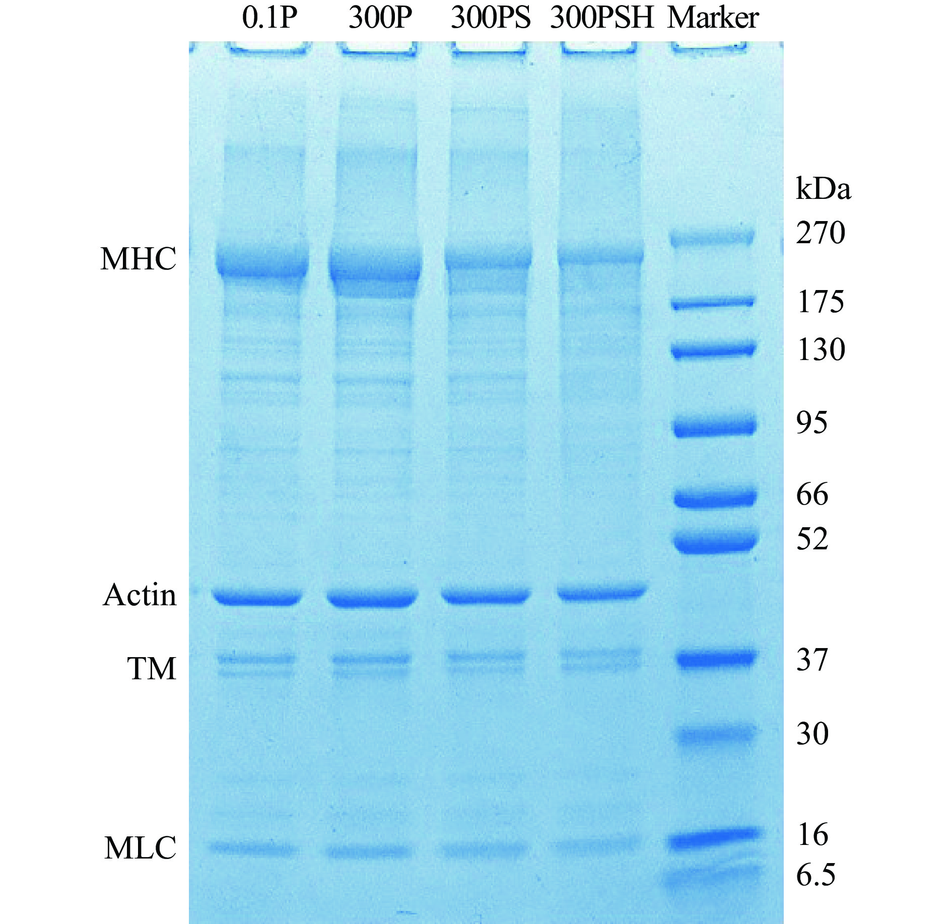 P<0.05) during the different treatments, and myosin heavy chain cross-linked aggregation. Meanwhile, the content of active sulfhydryl groups and surface hydrophobicity of surimi gel were significantly reduced (
